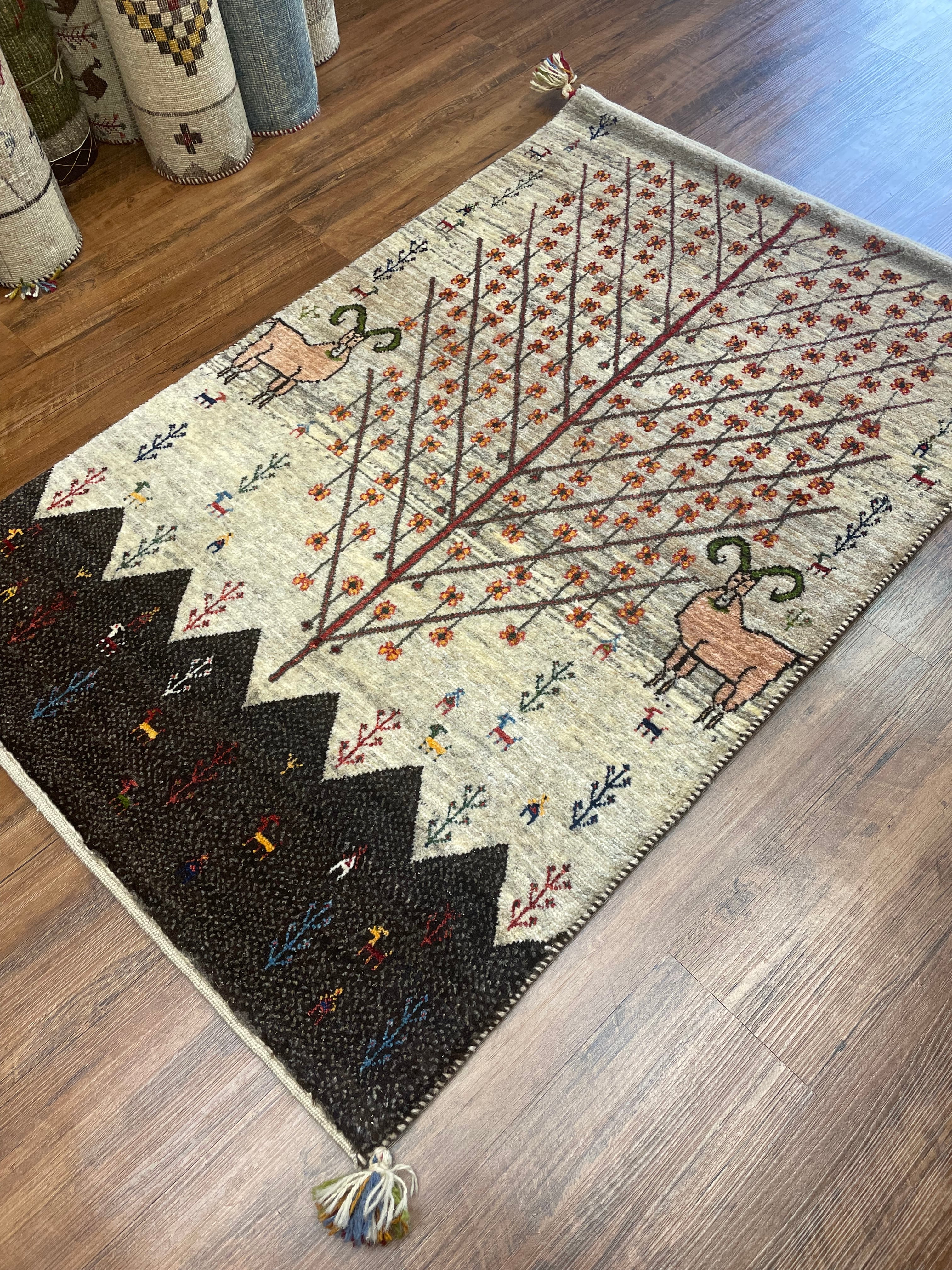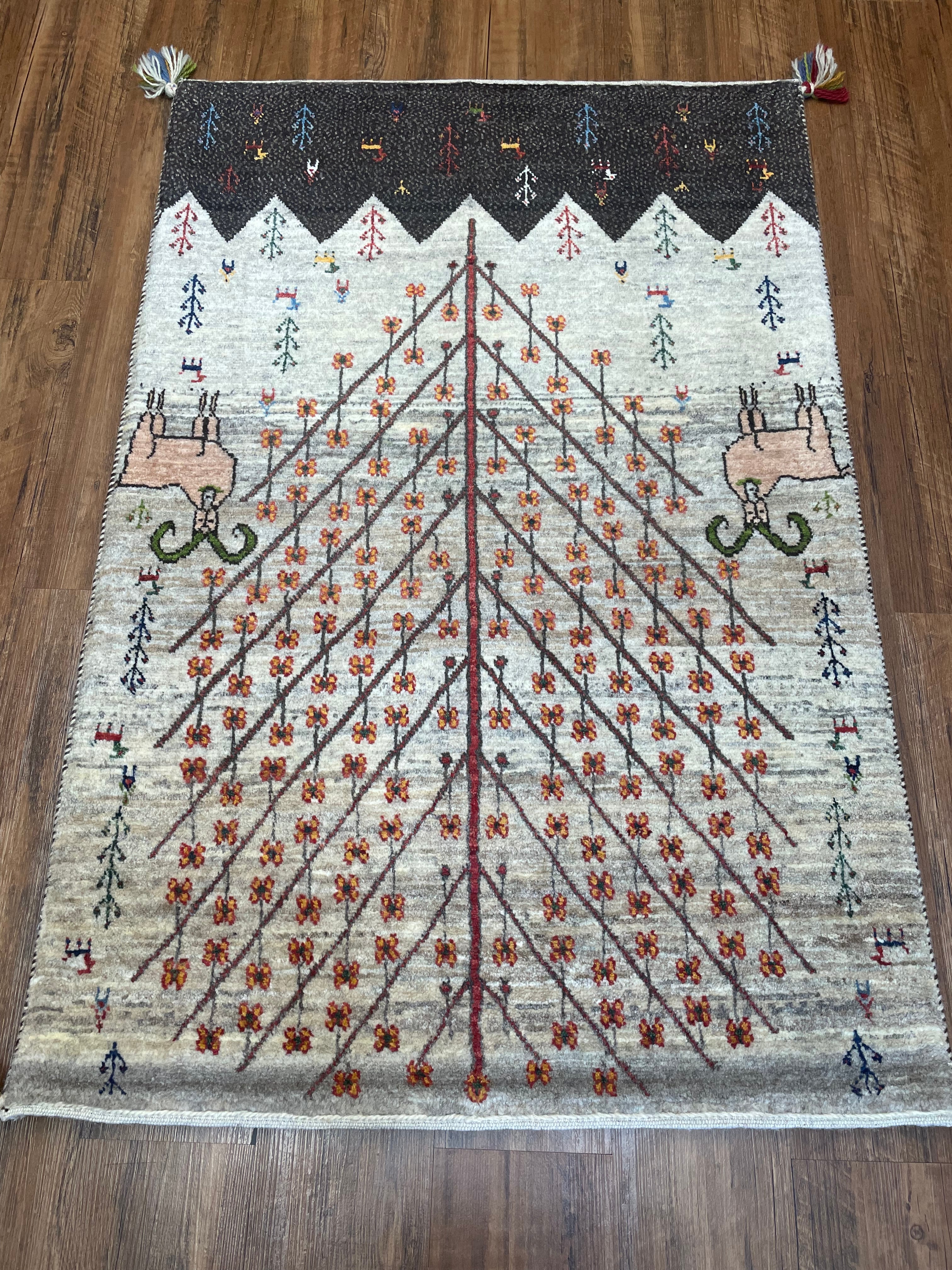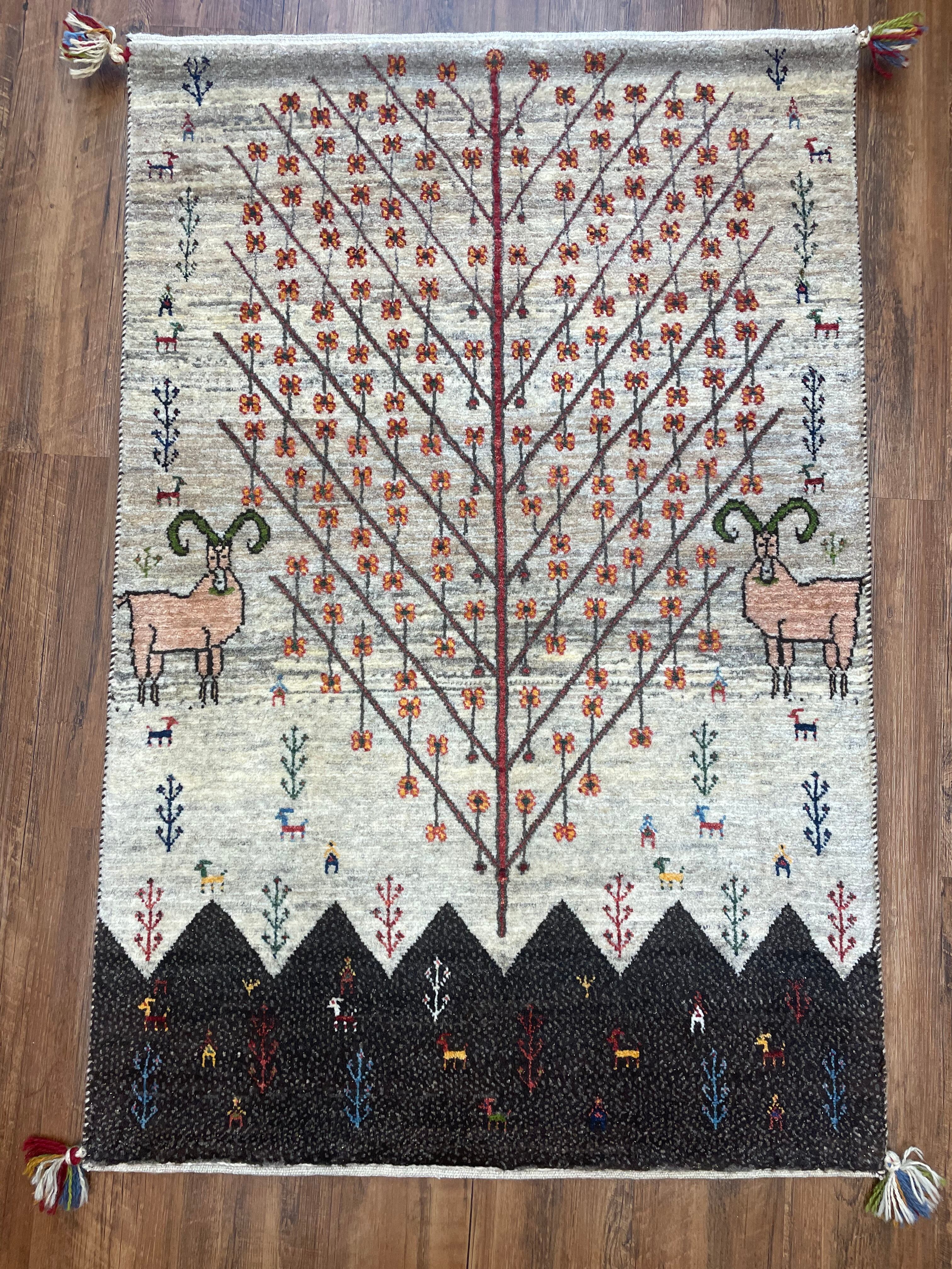 新品 ペルシャ絨毯 手織り ギャッベ キャシュクリ ナチュラル 生命の木 山羊