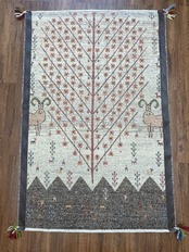 山脈や人々、山羊や生命の木などのモチーフが織り込まれていて楽しい1枚です