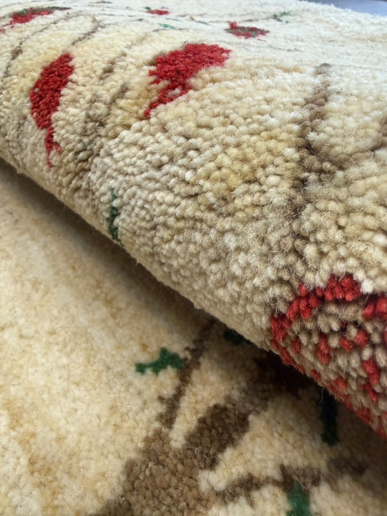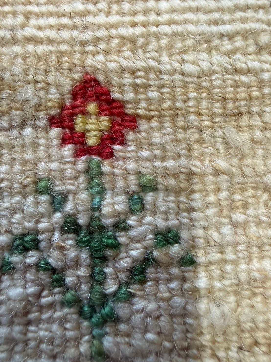 イランのギャッべの特徴は遊牧民の暮らしている地域は夏冬の温度差が大きい事に加え乾燥地帯であるため昼夜の温度差も大きい環境で育った羊の毛を刈り紡いで使っているので良質なウールで出来ていて手触りが良いです