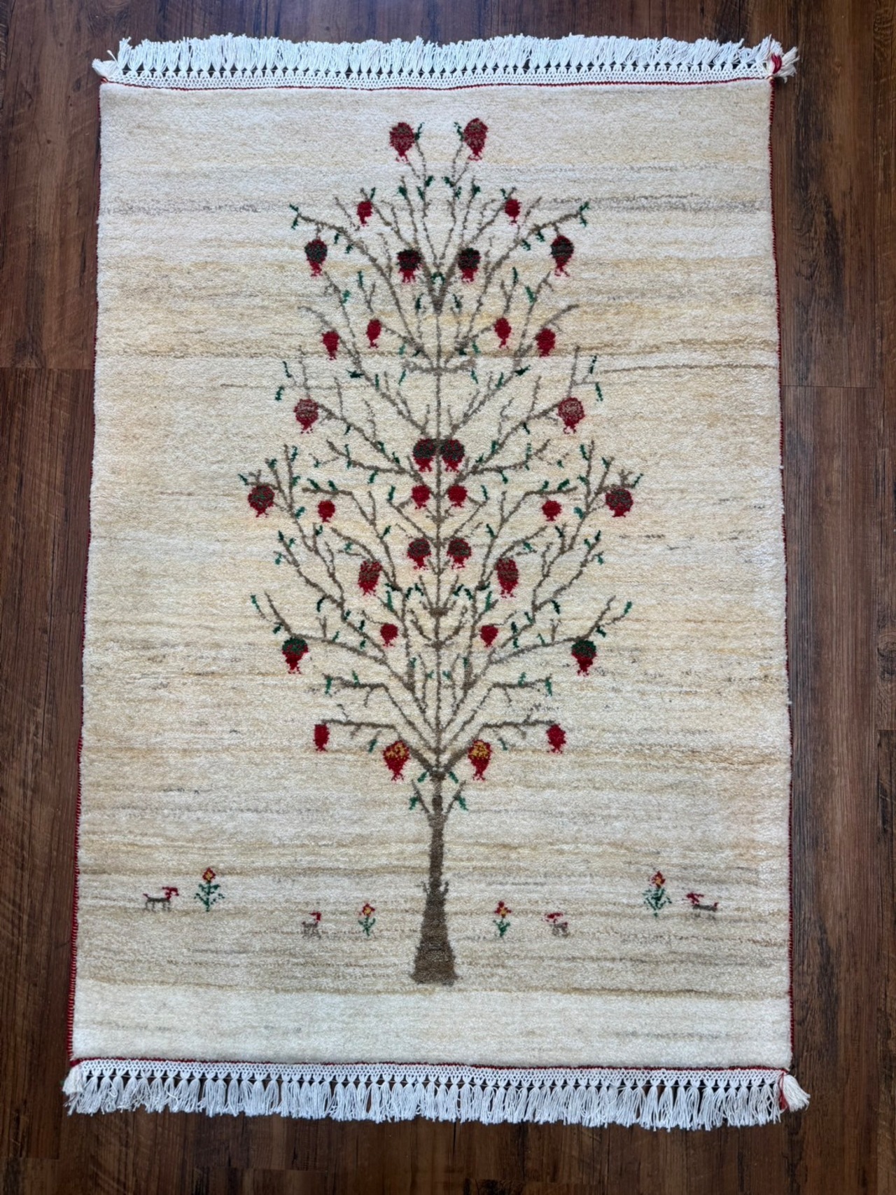 ナチュラルのフィールドに赤い実を付けたザクロの木が印象的でザクロの木の周りにお花や可愛らしい山羊たちの姿も織り込まれた素敵な手織りのリズギャッベです