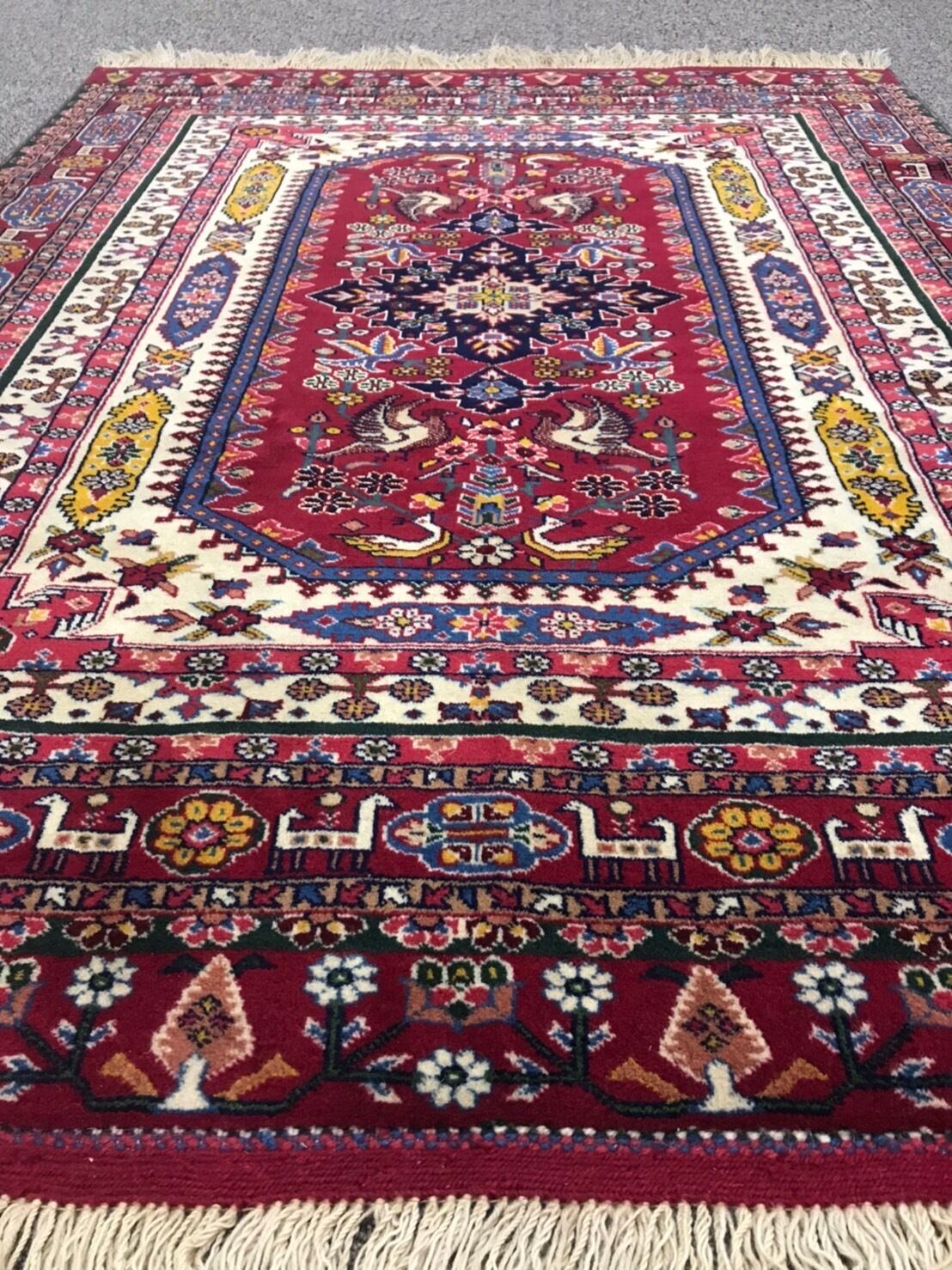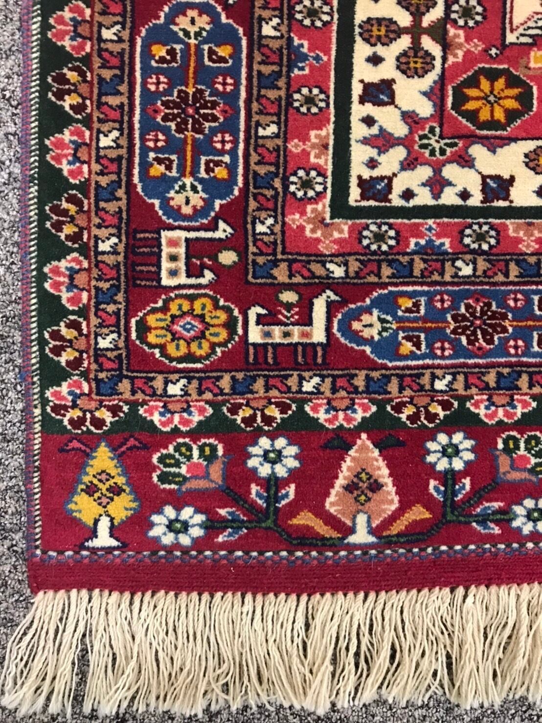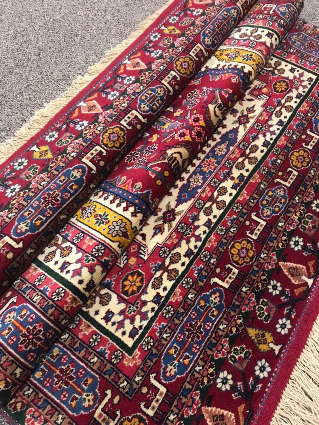 可愛らしい木々や鳥などの動物や植物の図柄がとても楽しく色の組み合わせも個性的で素敵なペルシャ絨毯です。