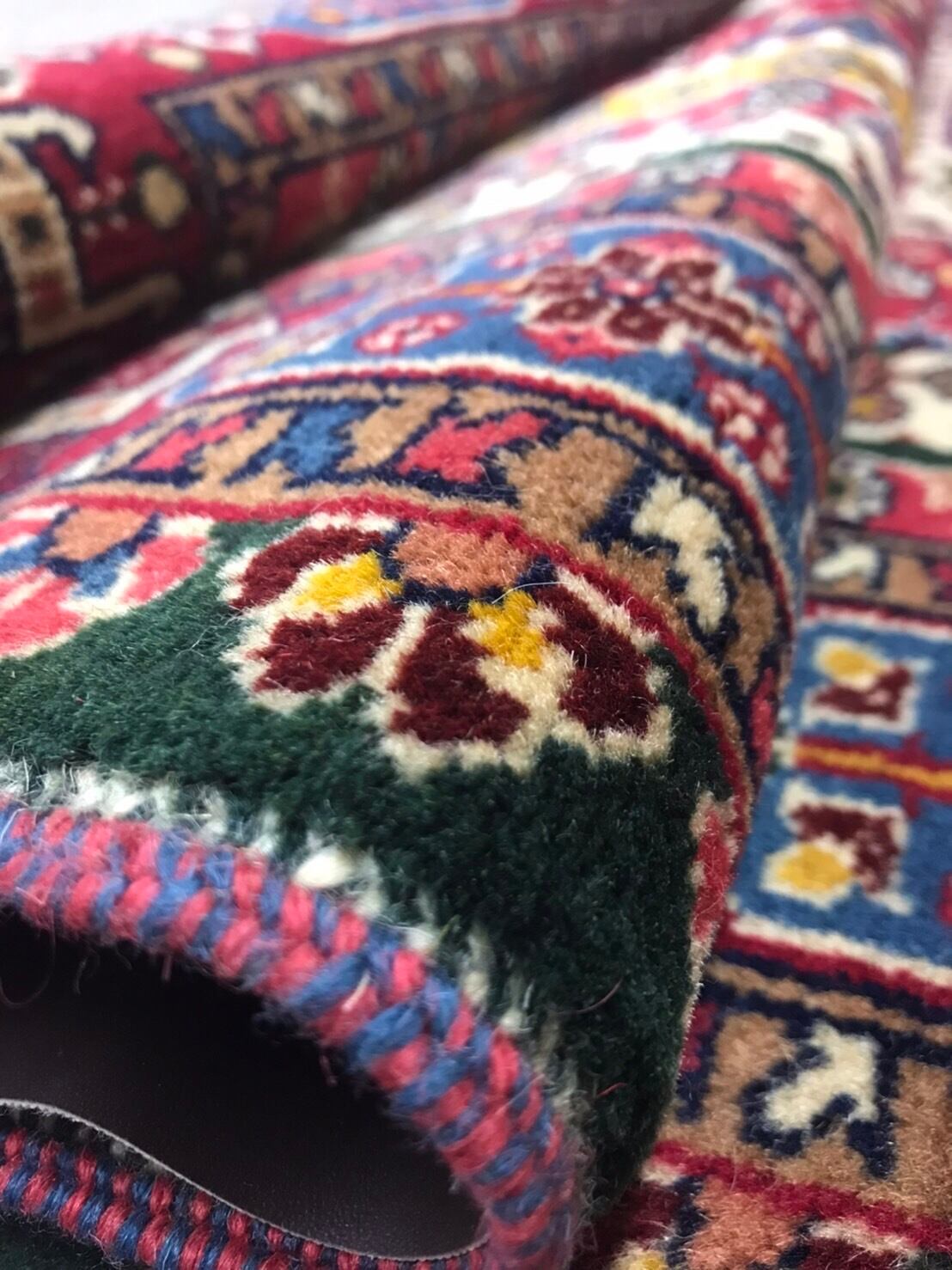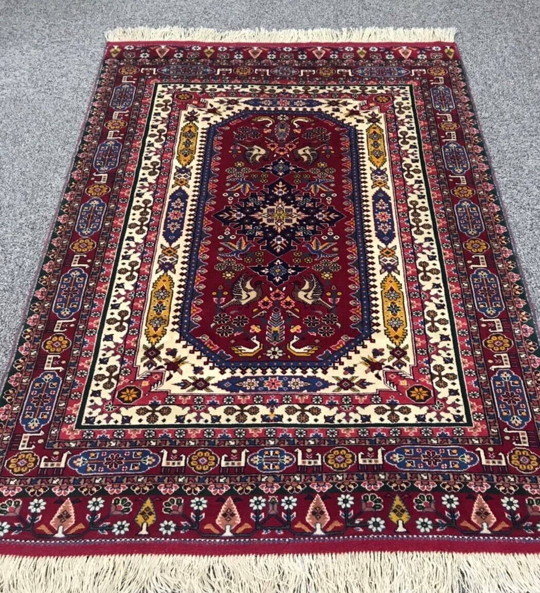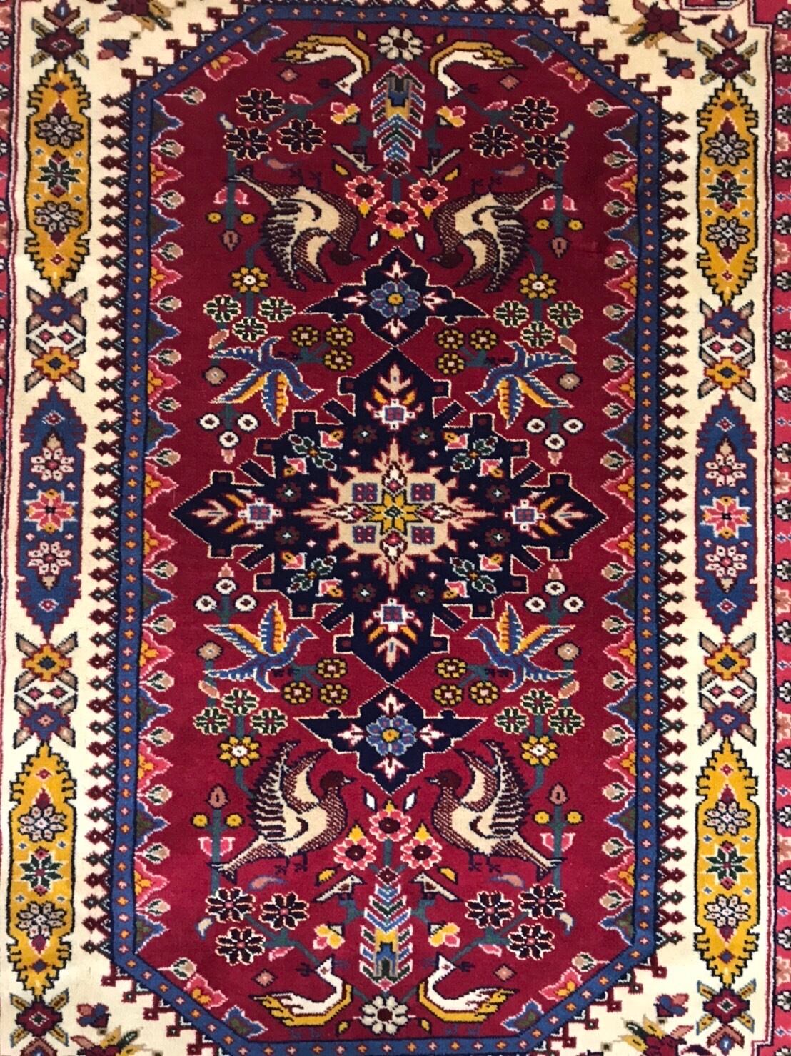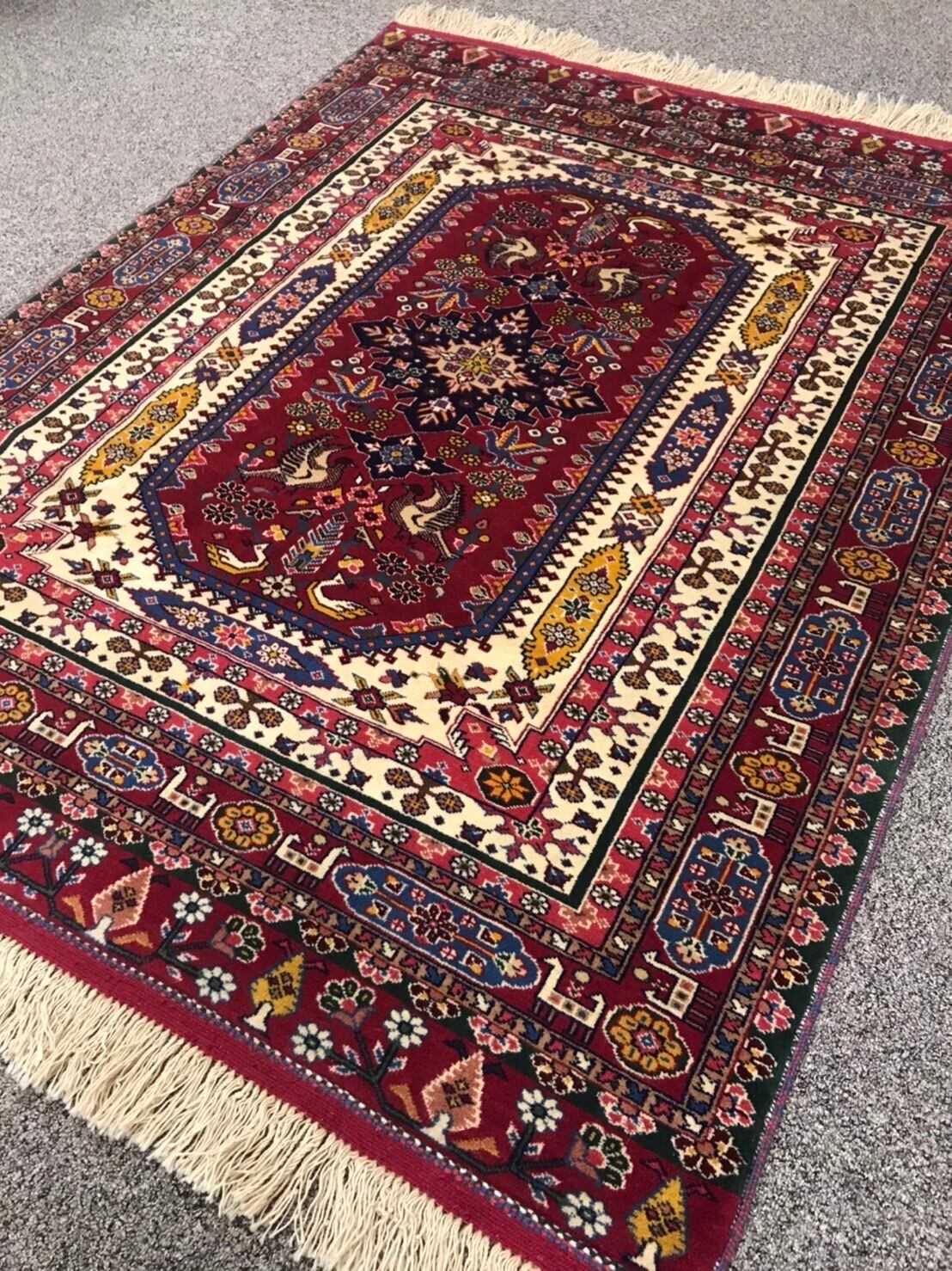 可愛らしい木々や鳥などの動物や植物の図柄がとても楽しく色の組み合わせも個性的で素敵なペルシャ絨毯です。