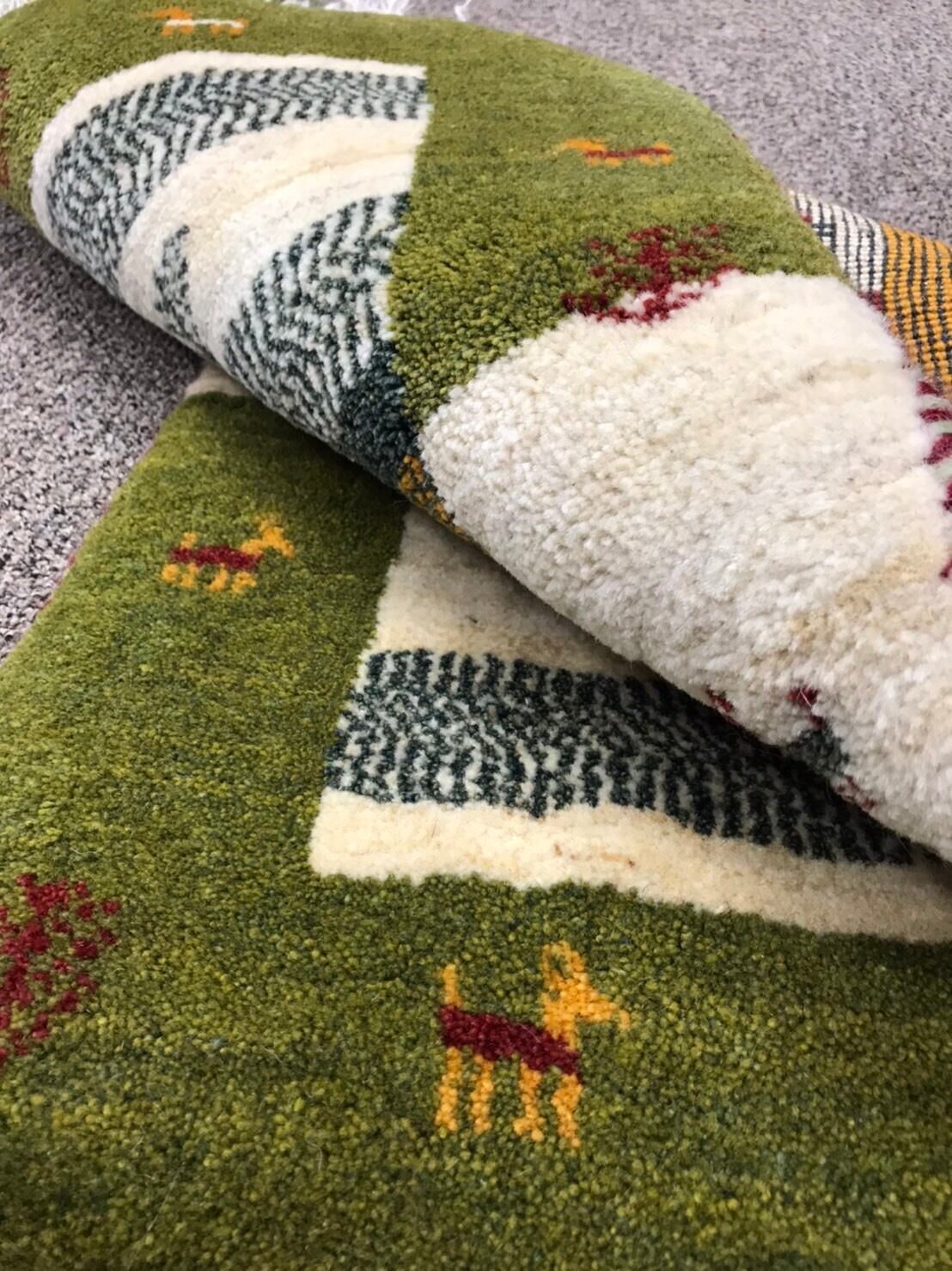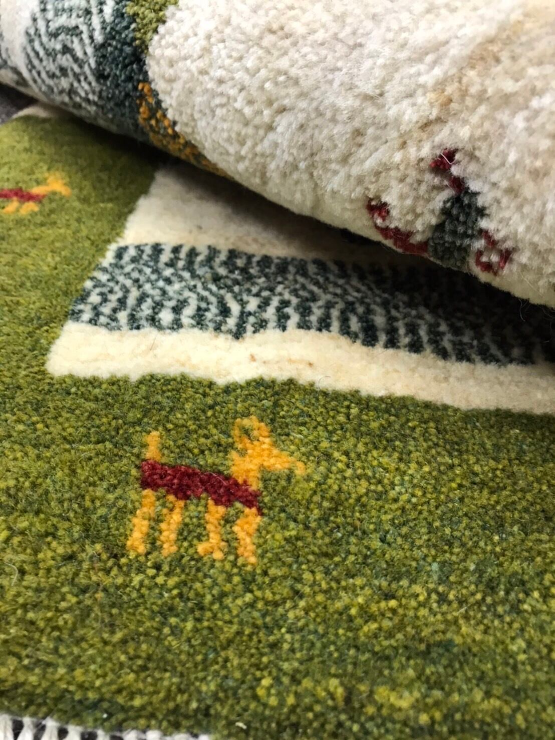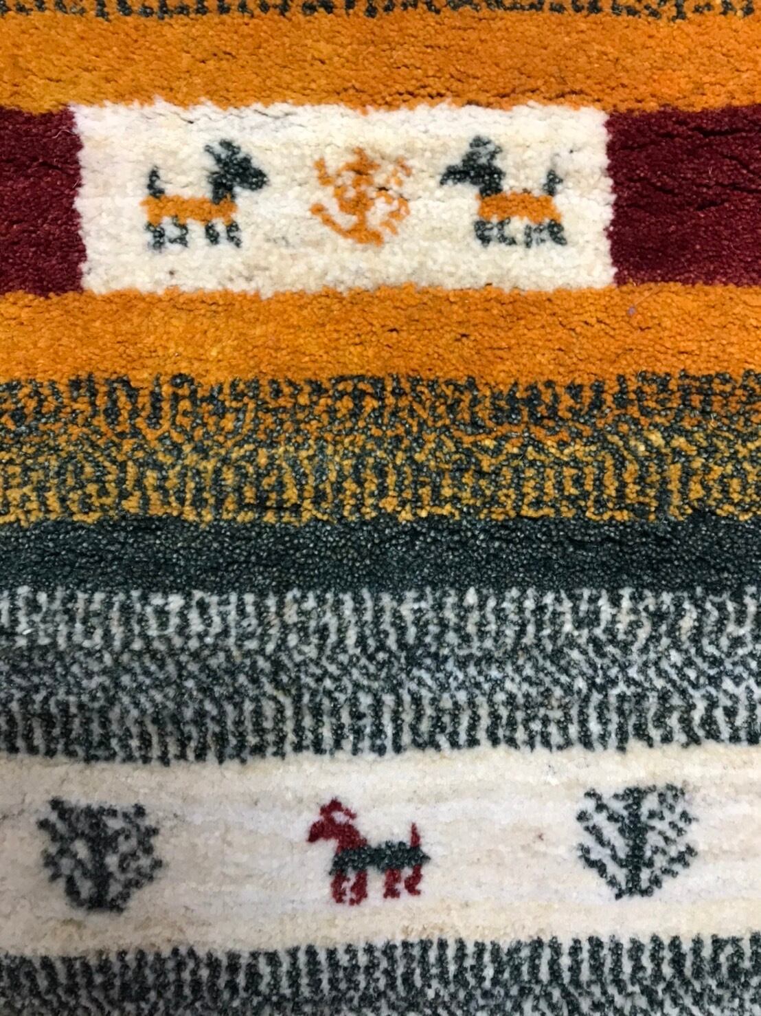 イランのギャッべの特徴は遊牧民の暮らしている地域は夏冬の温度差が大きい事に加え乾燥地帯であるため昼夜の温度差も大きい環境で育った羊の毛を刈り紡いで使っているので良質なウールで出来ていて手触りが良いです。