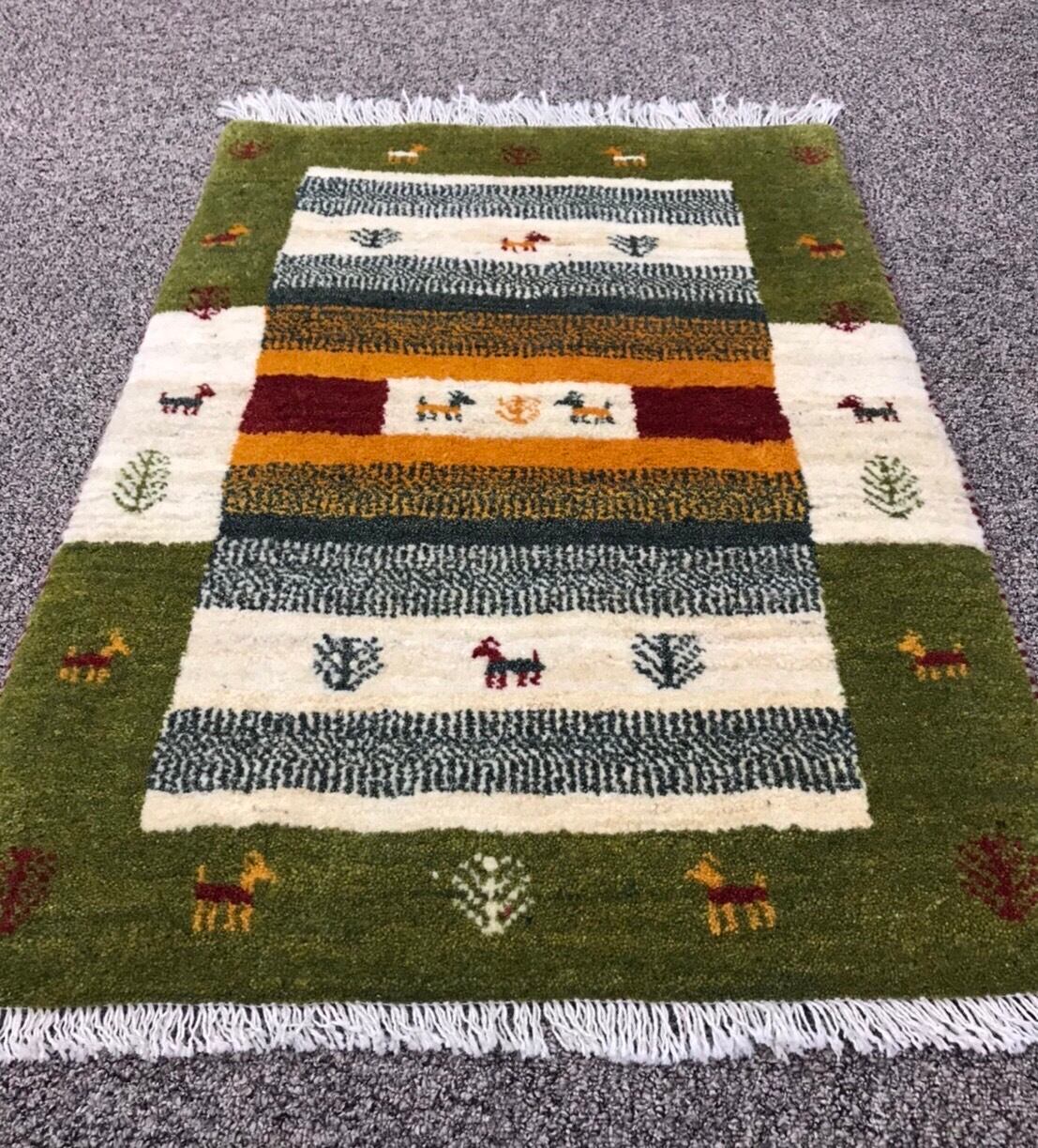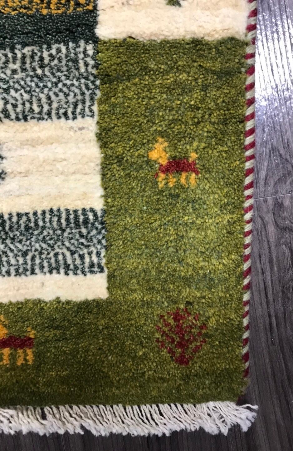 可愛らしい緑色(ジャシール「イラン南西部にあるザクロス山脈に自生する灌木(背丈の低い木)」+インディゴ)などの色味の組み合わせやモチーフの配置のバランスも良く可愛い印象的なギャッベです。
