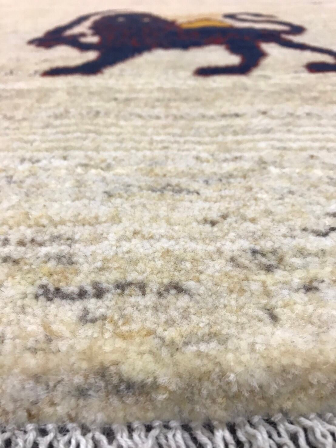 ベージュやクリーム色のミックス(無染色の羊さんの毛色)に所々にグレーっぽい色味がミックスされたベースに太陽を背に凛々しくも可愛い表情のライオンモチーフが印象的なギャッベです。