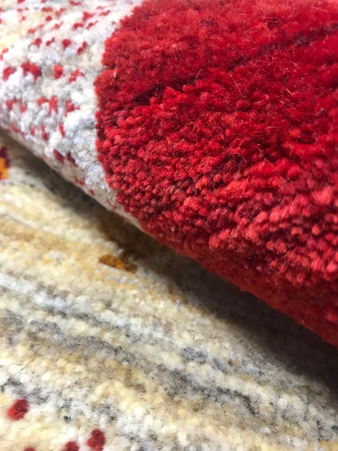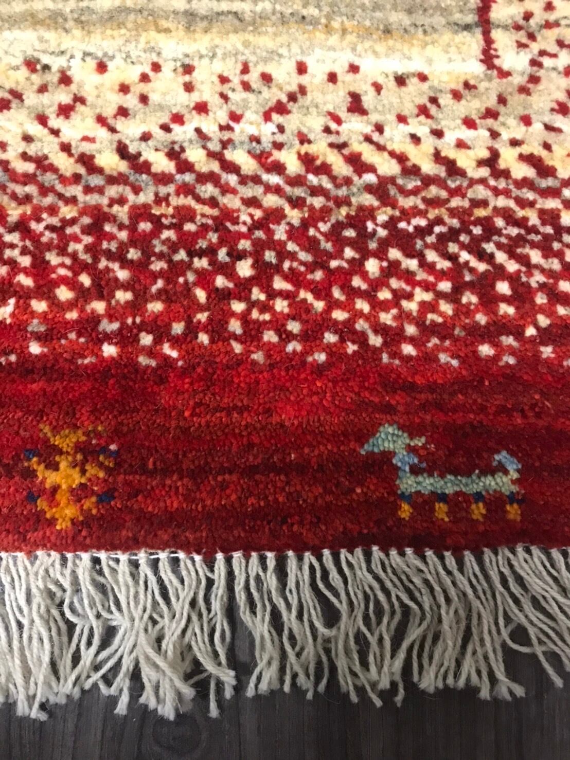 イランのギャッべの特徴は遊牧民の暮らしている地域は夏冬の温度差が大きい事に加え乾燥地帯であるため昼夜の温度差も大きい環境で育った羊の毛を刈り紡いで使っているので良質なウールで出来ていて手触りが良いです。