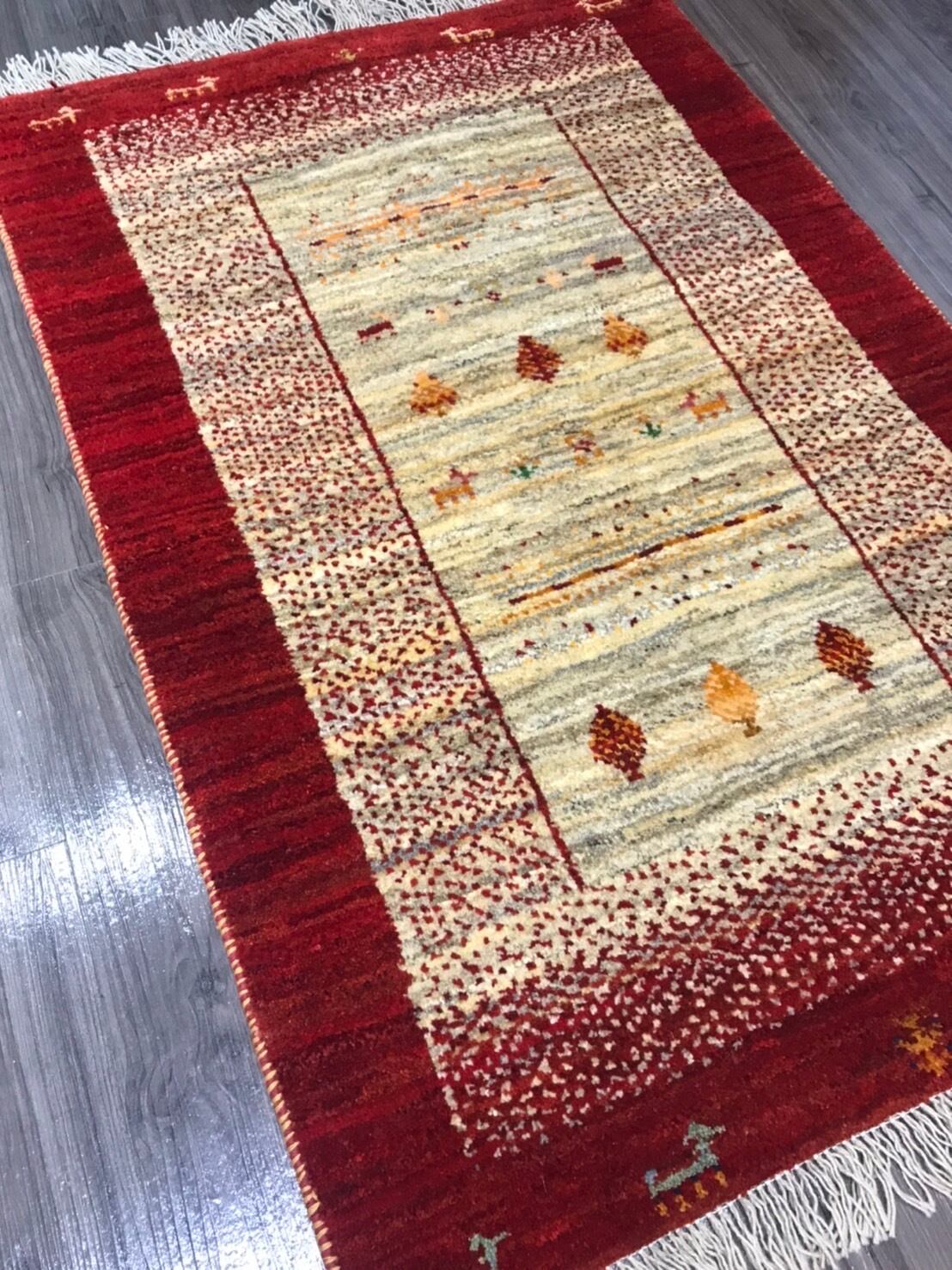 新品 ギャッベ 手織り ペルシャ絨毯 118cm×80cm 赤 生命の木 花 山羊