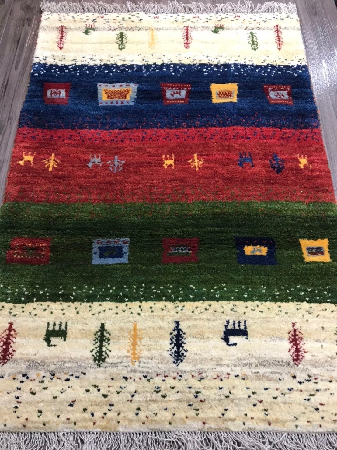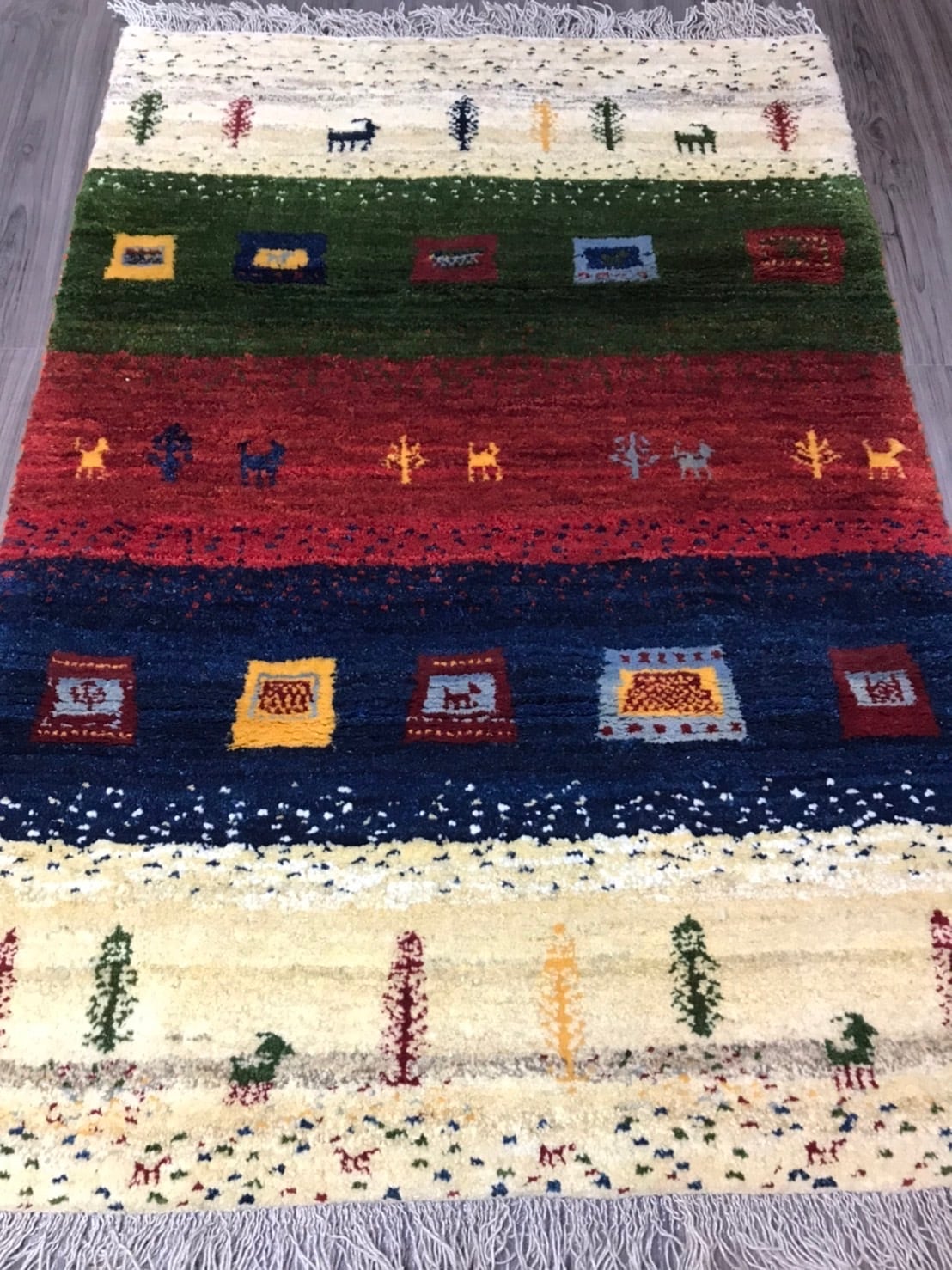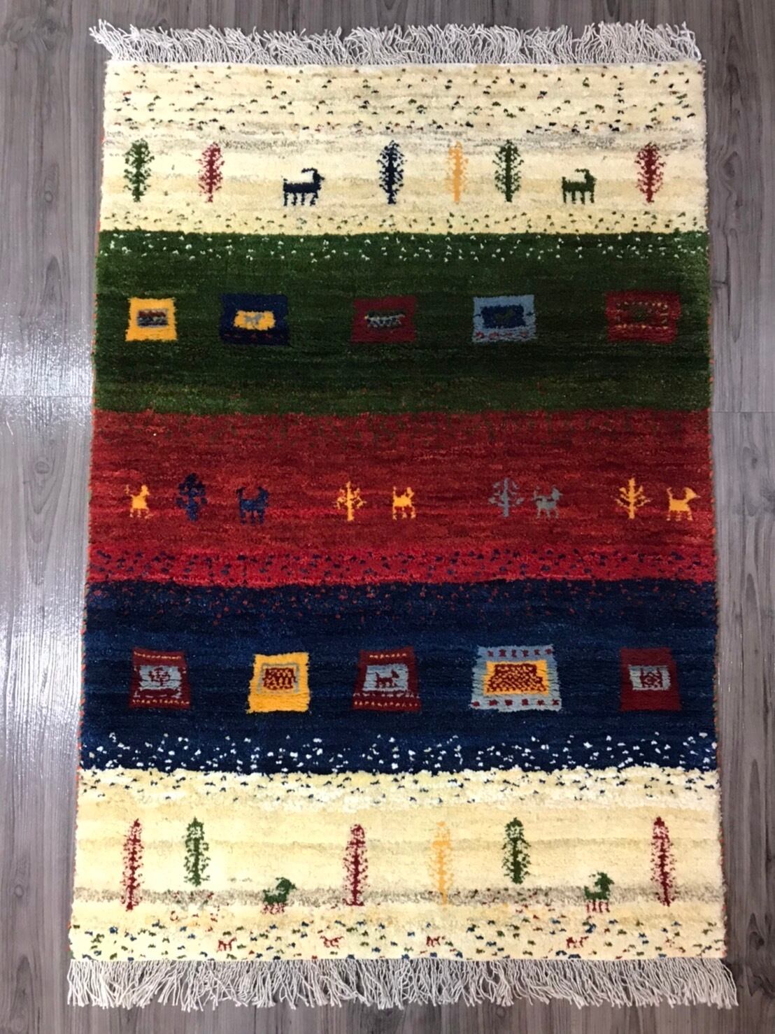 新品 ペルシャ絨毯 手織り ギャッベ 117cm×81cm 山羊 生命の木 幸せの窓 ナチュラル 赤 青 緑