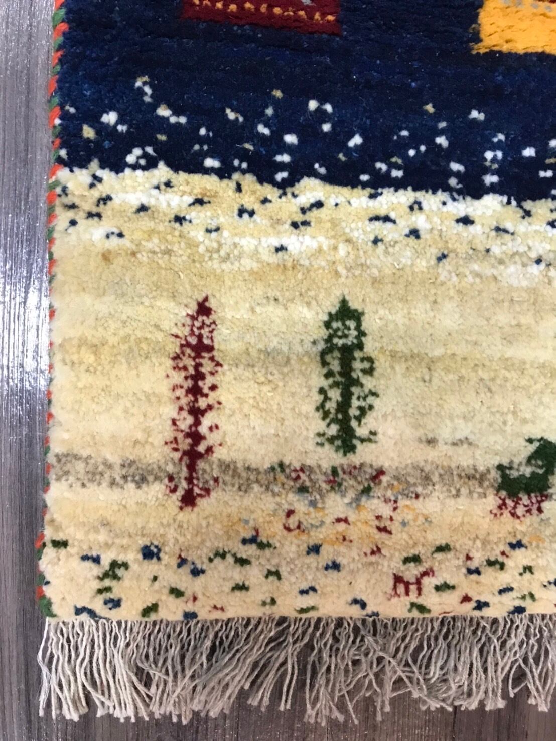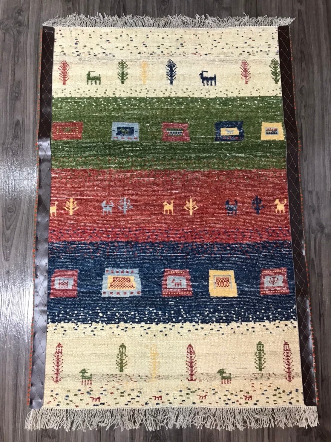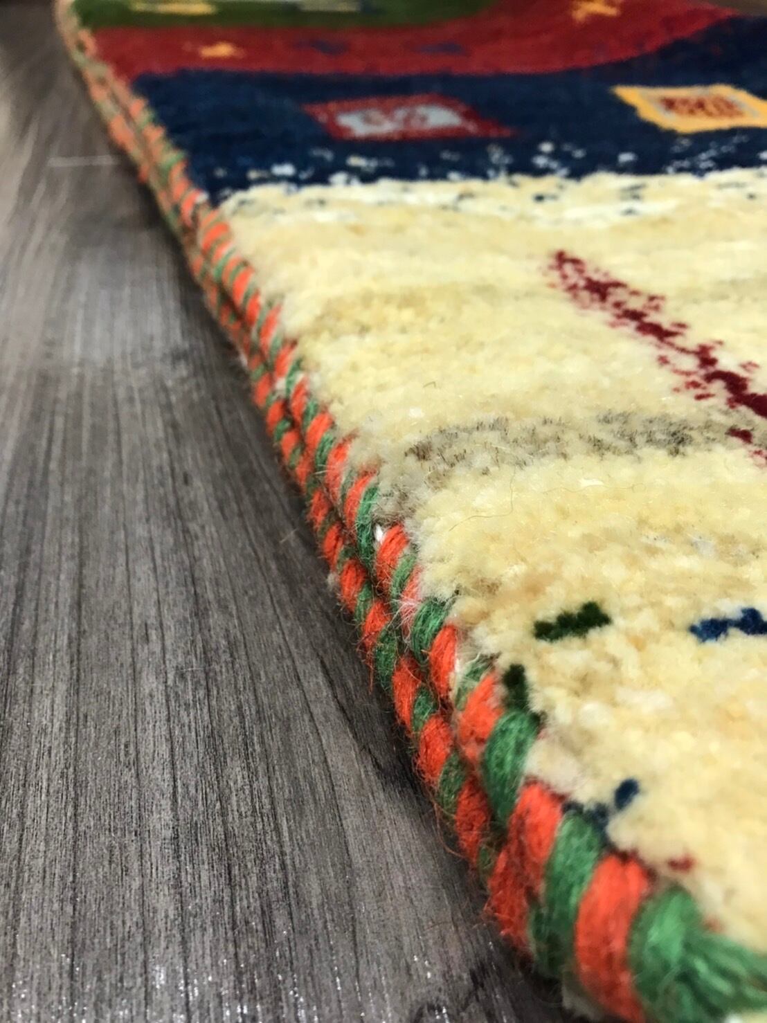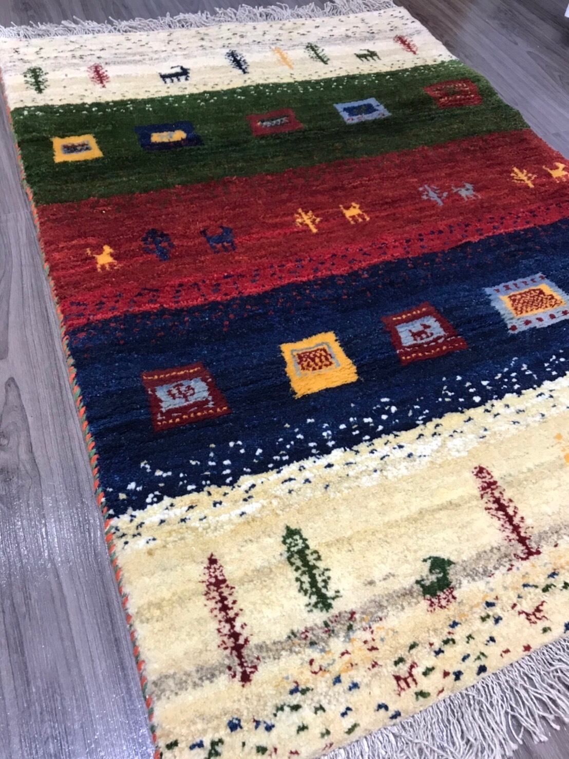 新品 ペルシャ絨毯 手織り ギャッベ 117cm×81cm 山羊 生命の木 幸せの窓 ナチュラル 赤 青 緑