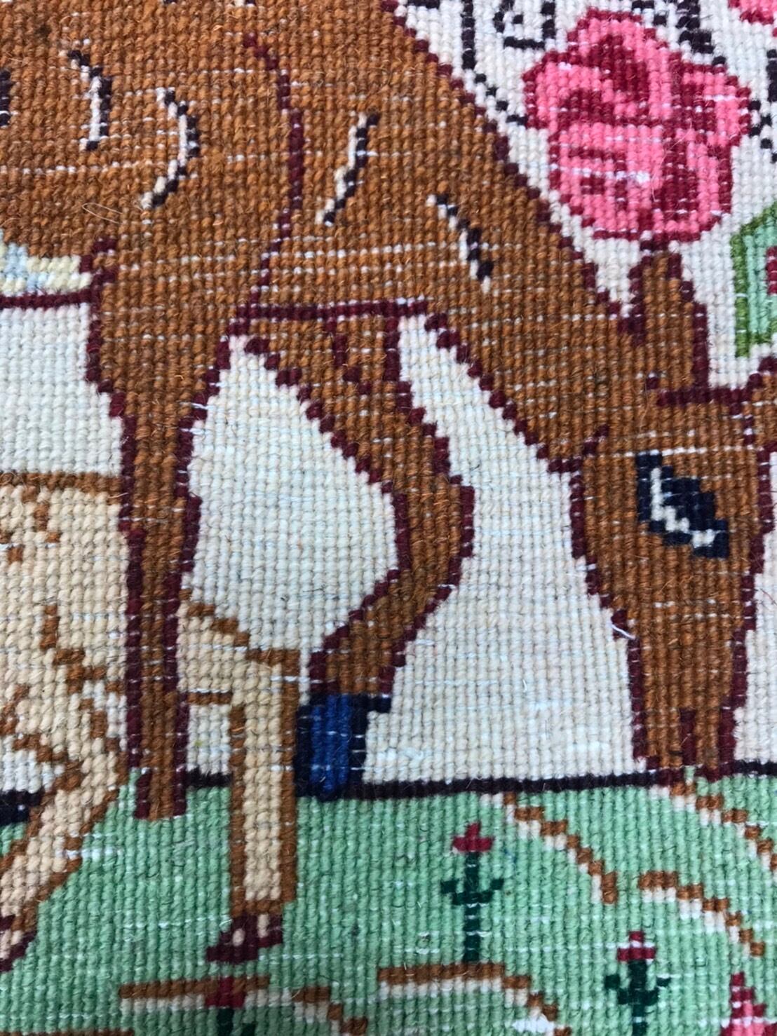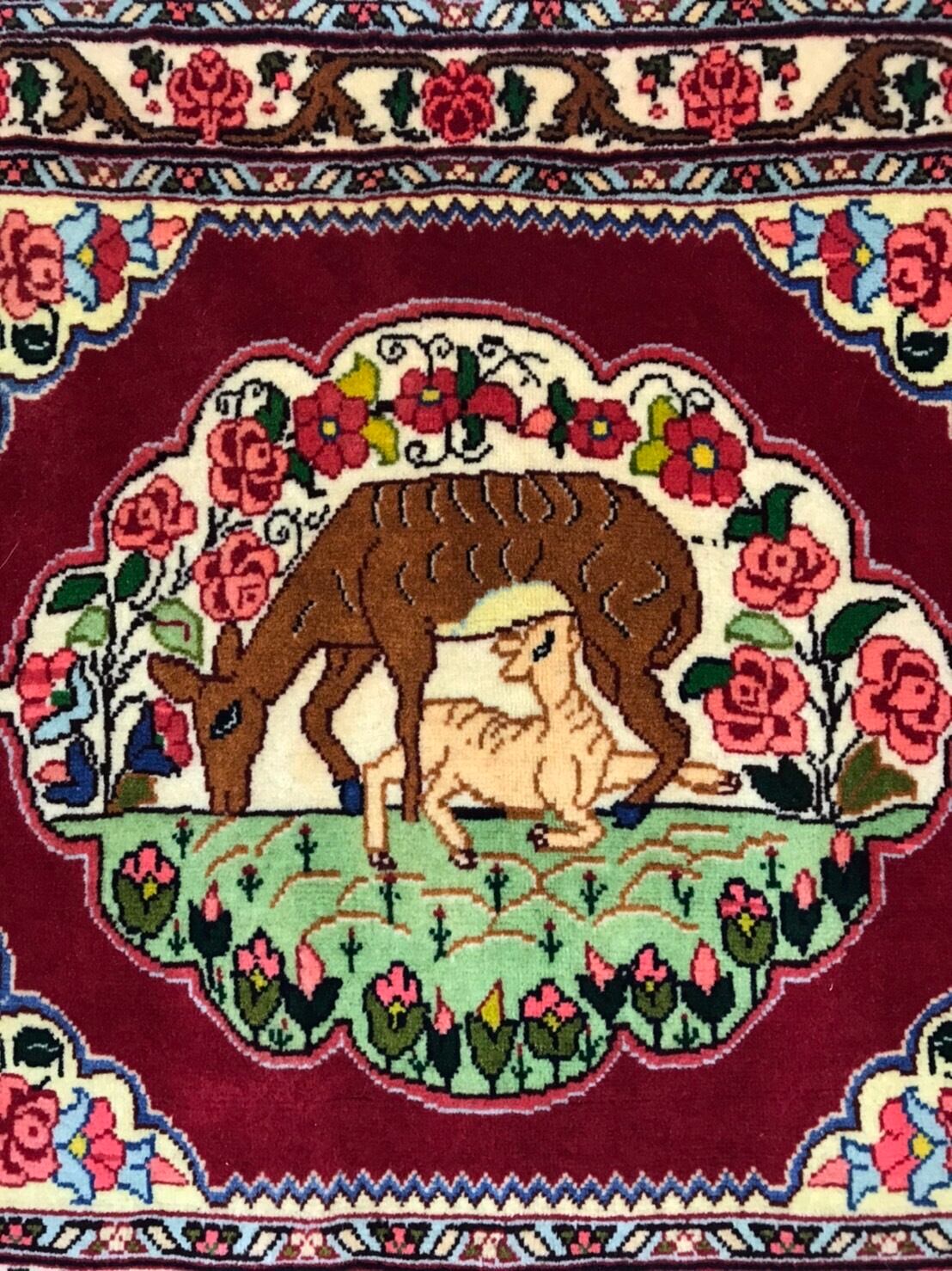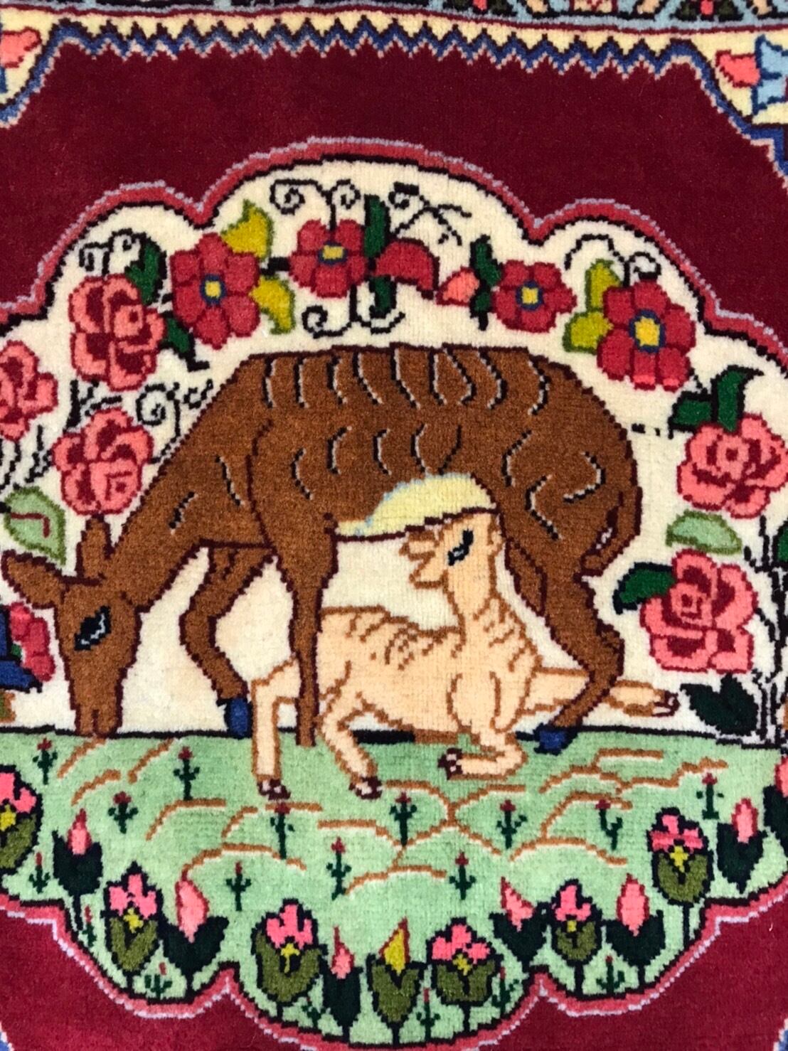 イランの国花である薔薇が沢山織られていて華やかであり真ん中には鹿の親子が寄り添い、お母さん鹿が子供にミルクを与えている姿が織られていて微笑ましく愛情あふれる親子の鹿の姿を見ているとほっこり癒されるようなペルシャ絨毯です。