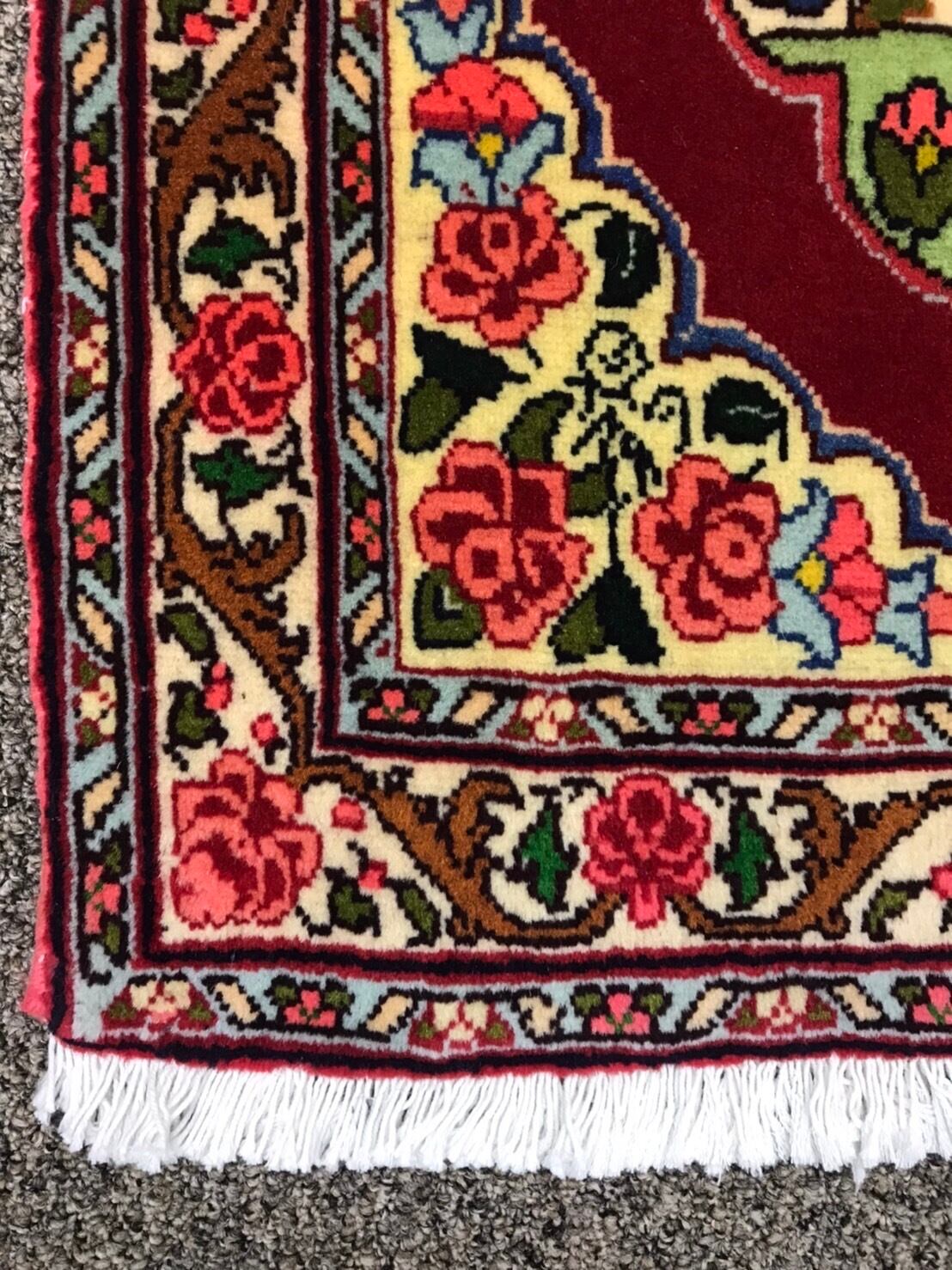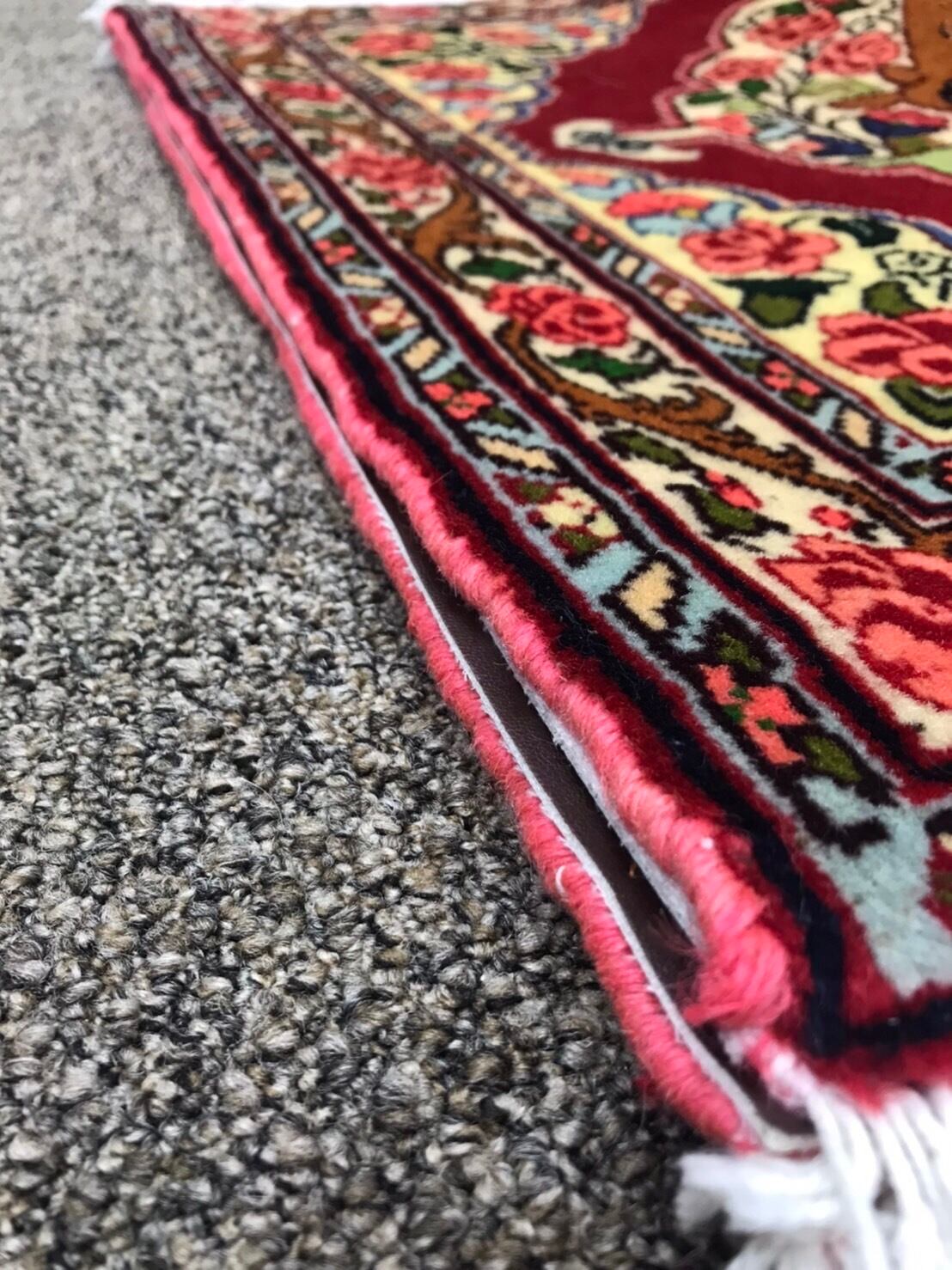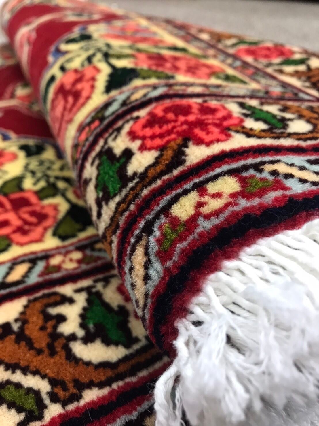 イランの国花である薔薇が沢山織られていて華やかであり真ん中には鹿の親子が寄り添い、お母さん鹿が子供にミルクを与えている姿が織られていて微笑ましく愛情あふれる親子の鹿の姿を見ているとほっこり癒されるようなペルシャ絨毯です。