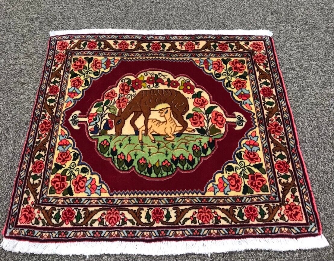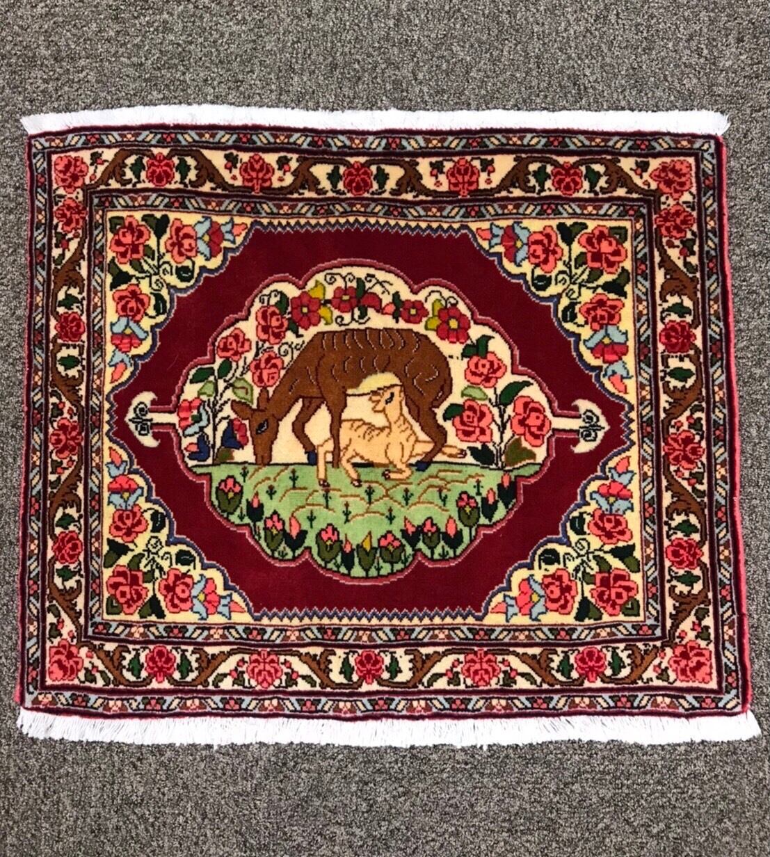 新品 ペルシャ絨毯 手織り サナンダジ産 80cm×66cm 鹿 親子 薔薇