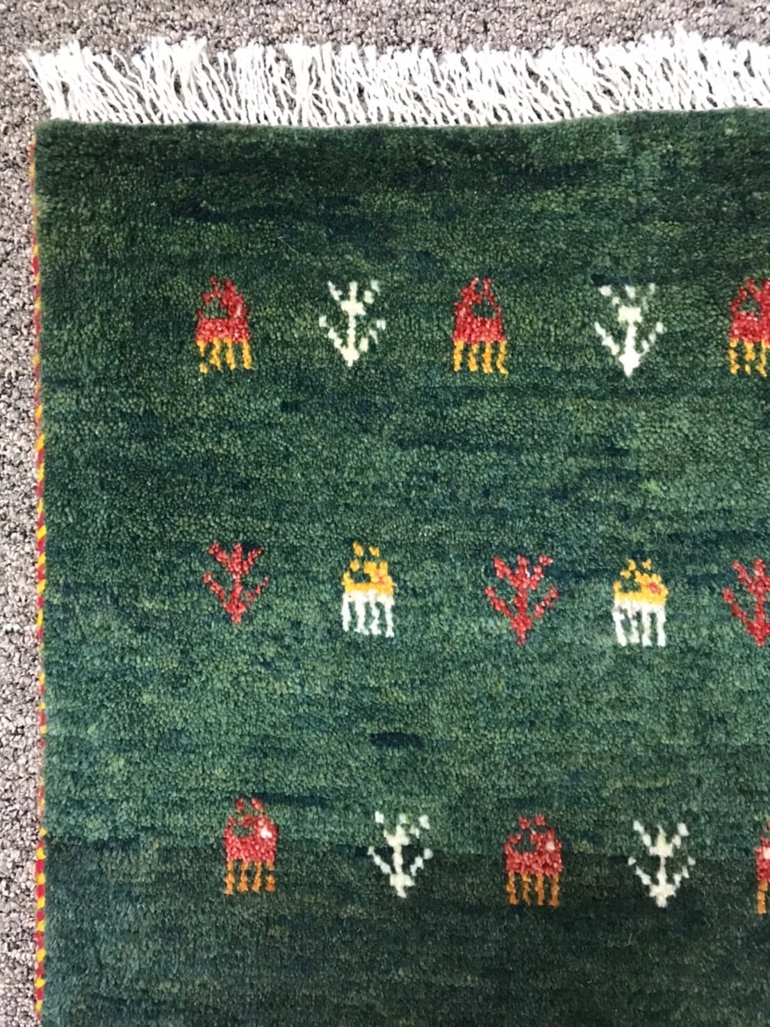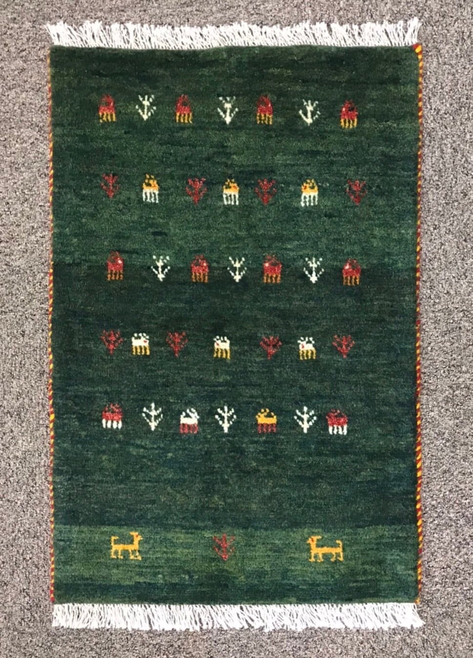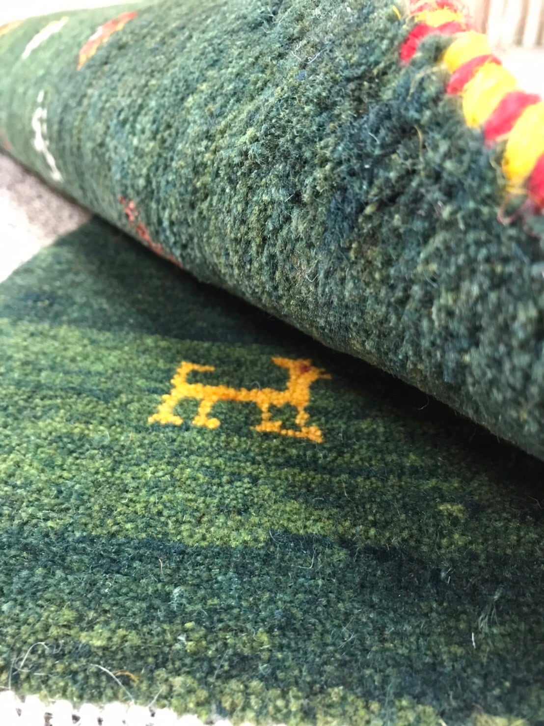 グリーンの濃淡(ジャシール「イラン南西部にあるザクロス山脈に自生する灌木(背丈の低い木)」+インディゴ)をベースにして山羊や生命の木のモチーフがとても可愛らしいギャッベです。