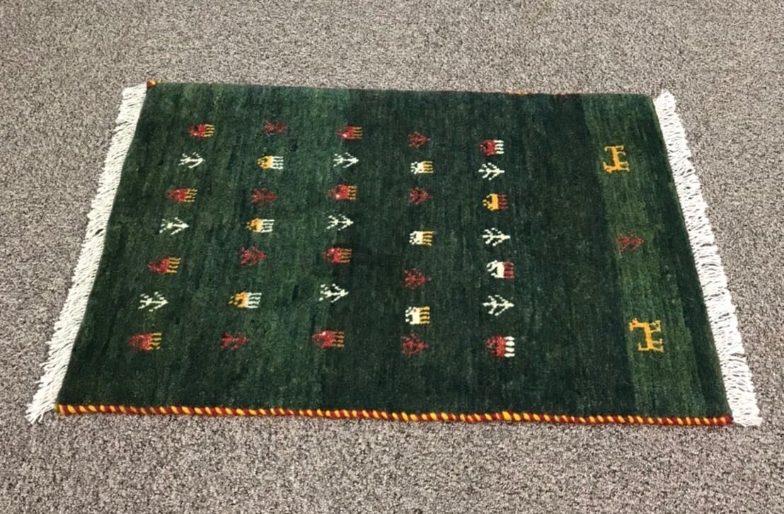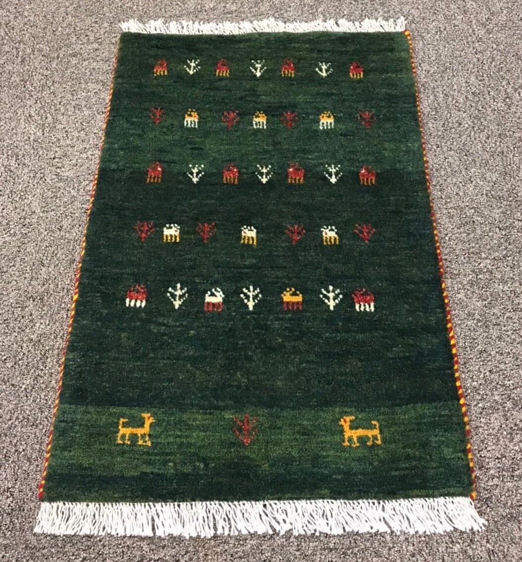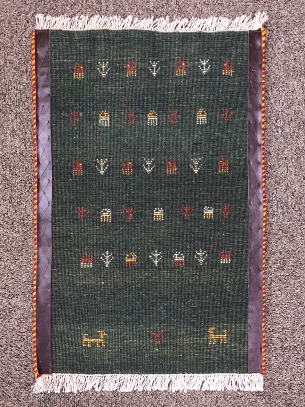 グリーンの濃淡(ジャシール「イラン南西部にあるザクロス山脈に自生する灌木(背丈の低い木)」+インディゴ)をベースにして山羊や生命の木のモチーフがとても可愛らしいギャッベです。
