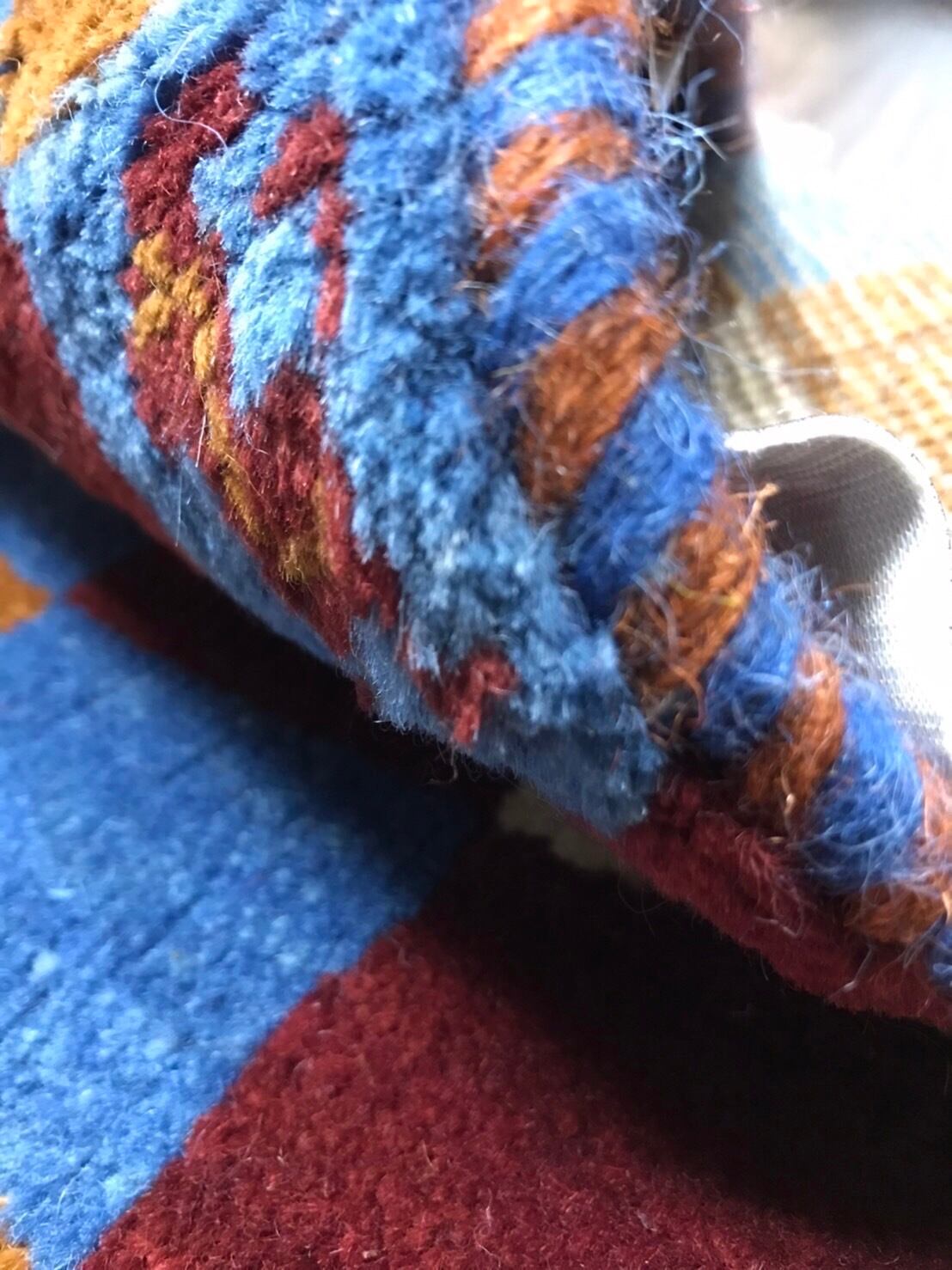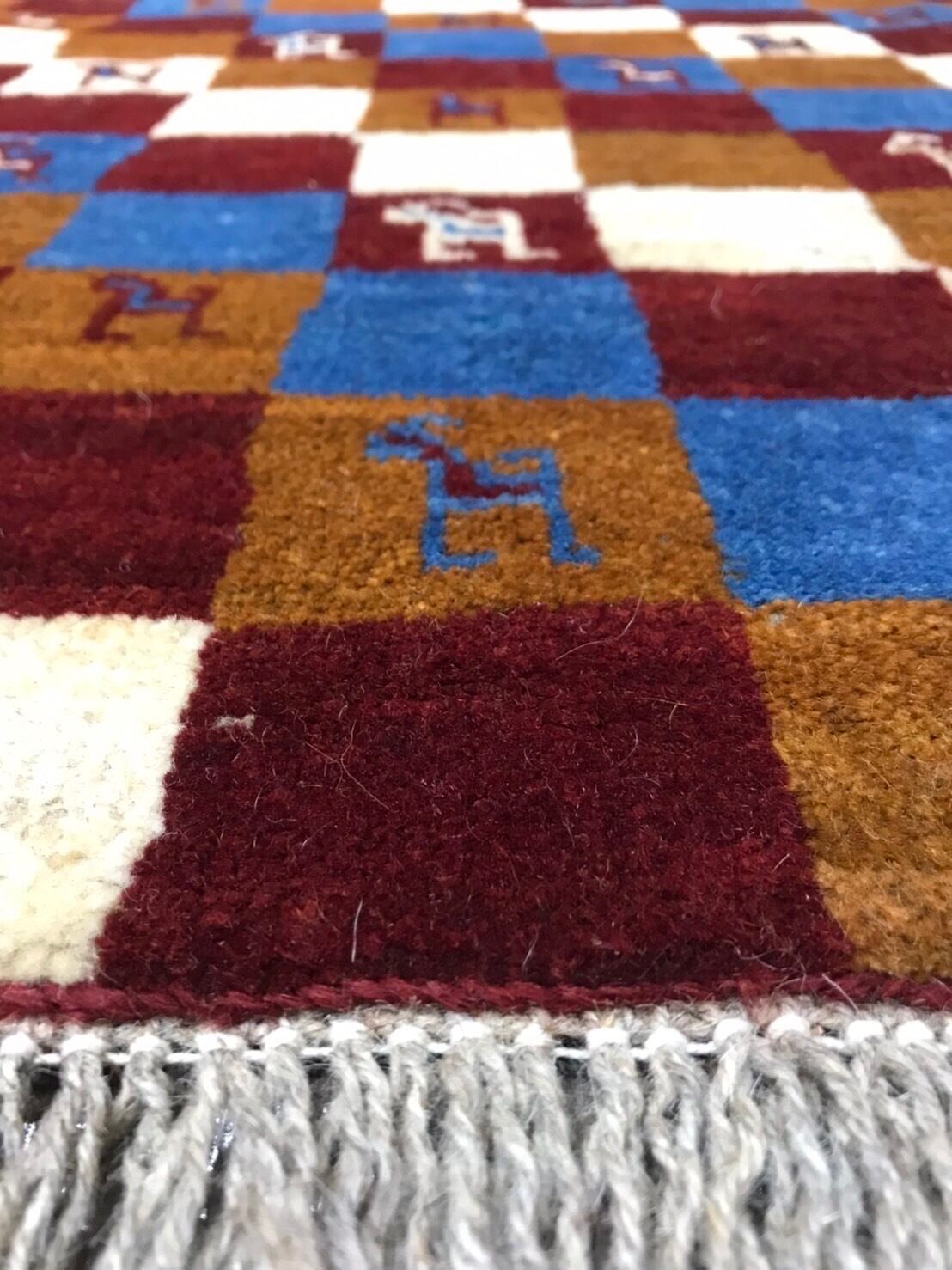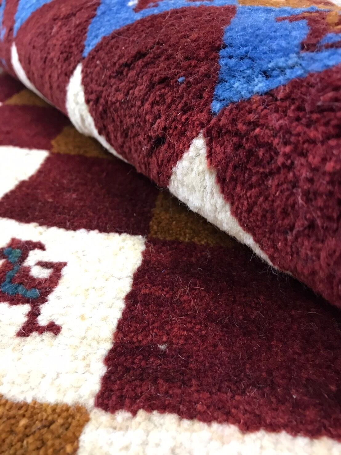 イランのギャッべの特徴は遊牧民の暮らしている地域は夏冬の温度差が大きい事に加え乾燥地帯であるため昼夜の温度差も大きい環境で育った羊の毛を刈り紡いで使っているので良質なウールで出来ていて手触りが良いです。