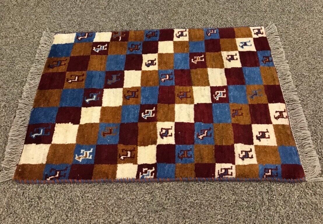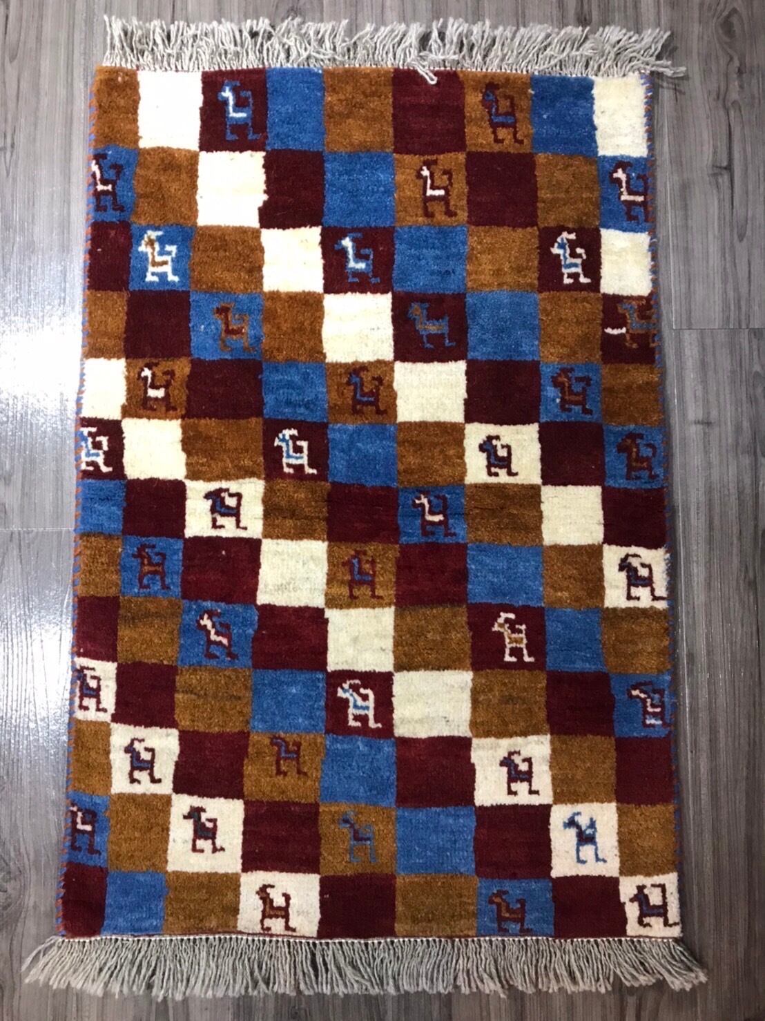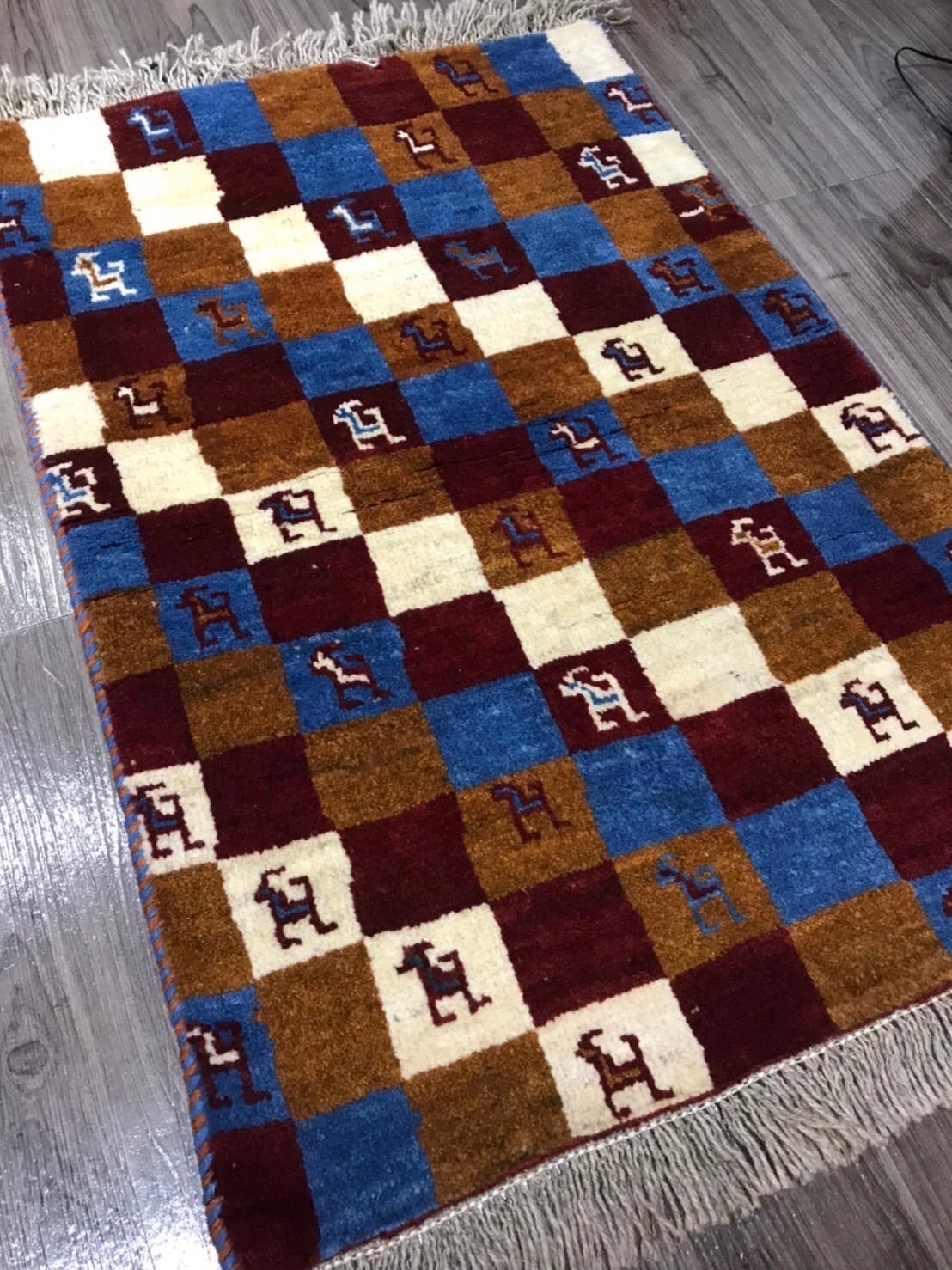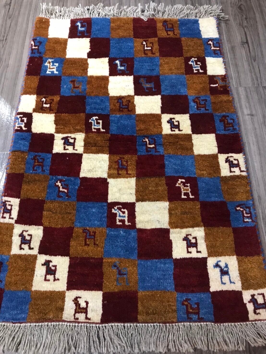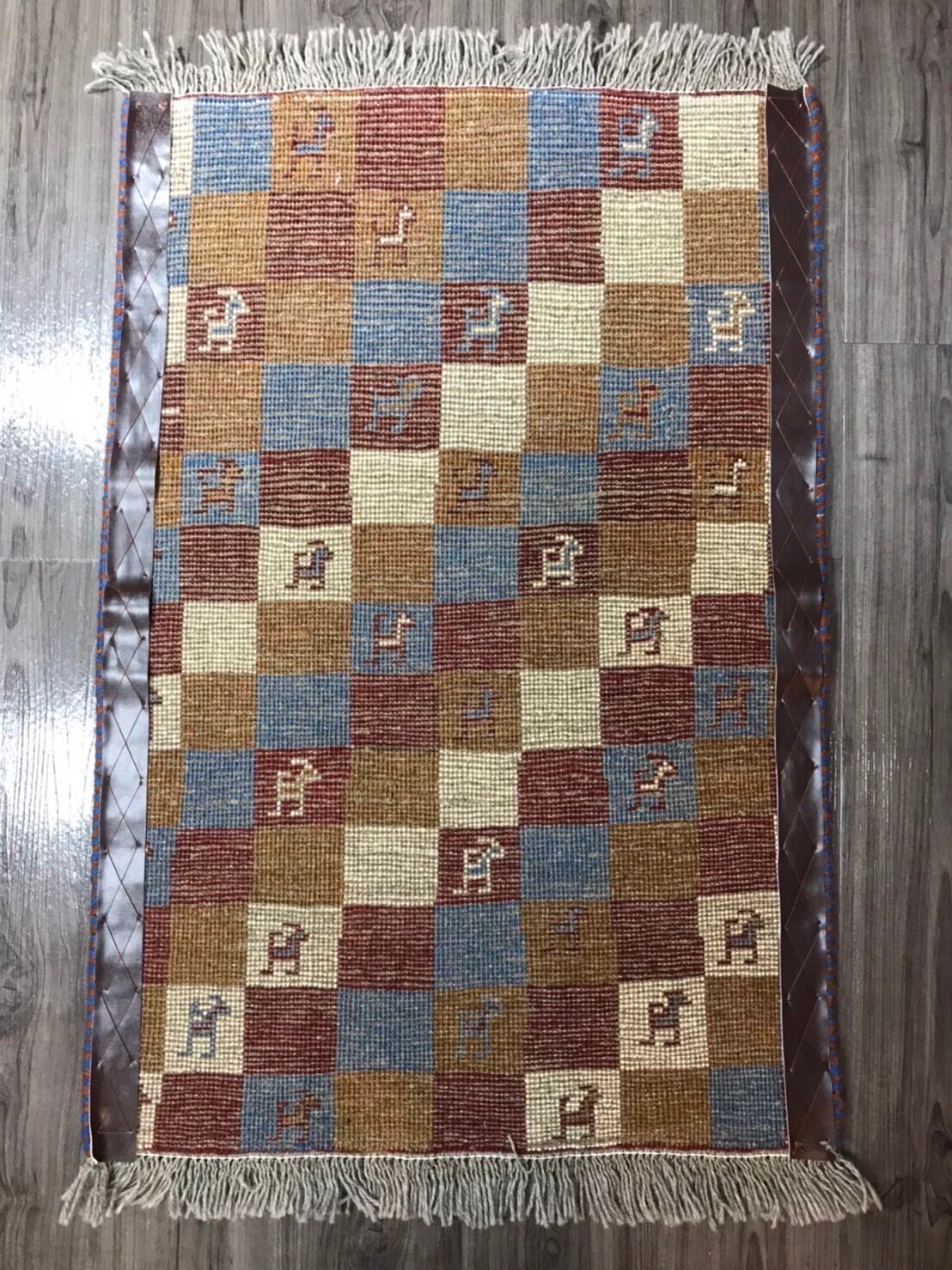 新品 ペルシャ絨毯 手織り ギャッベ 89cm×61cm 山羊 幸せの窓 ナチュラル 茶色 青