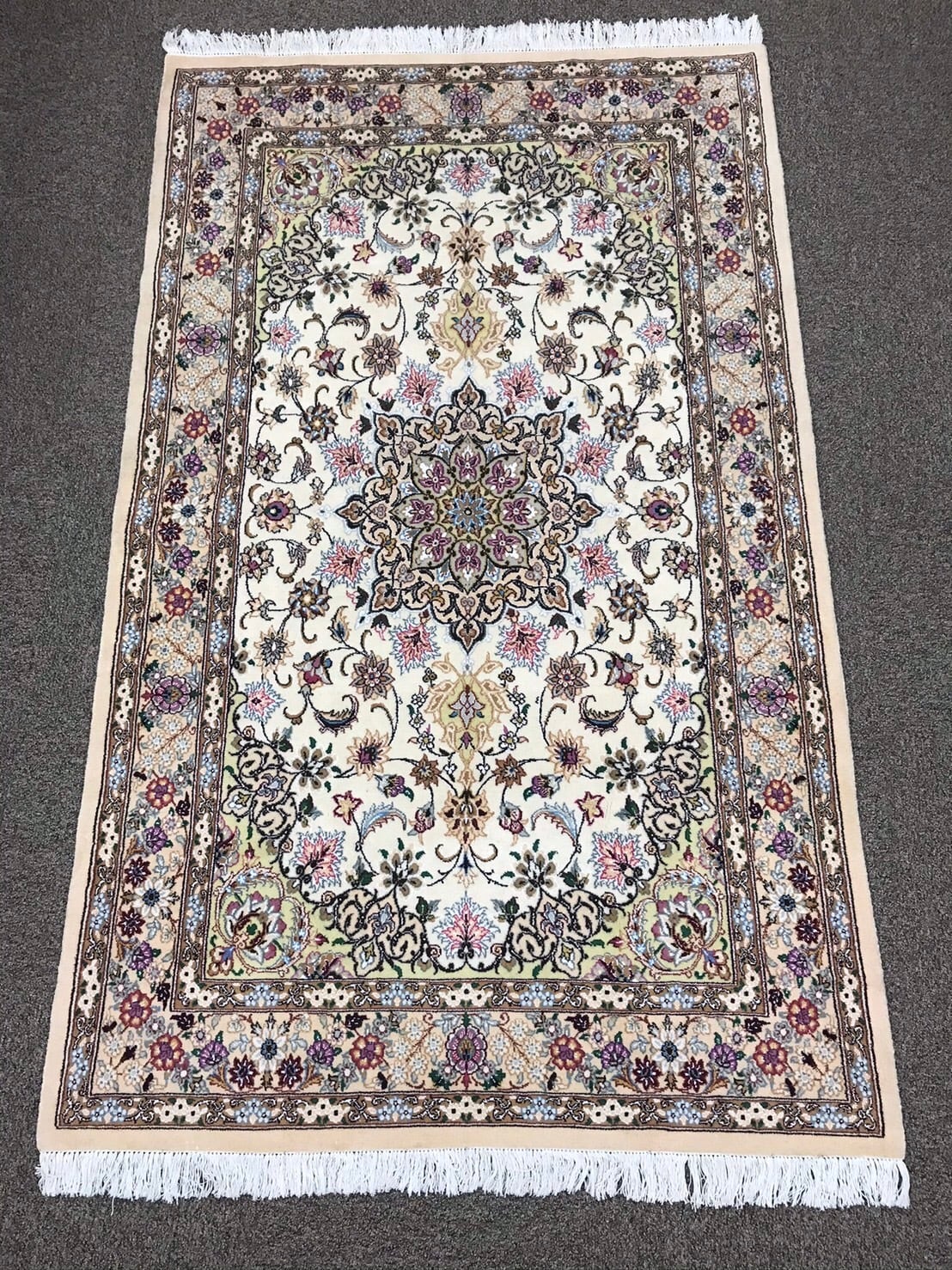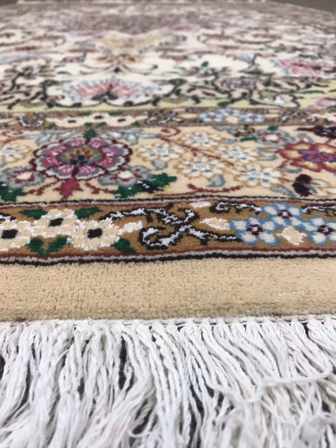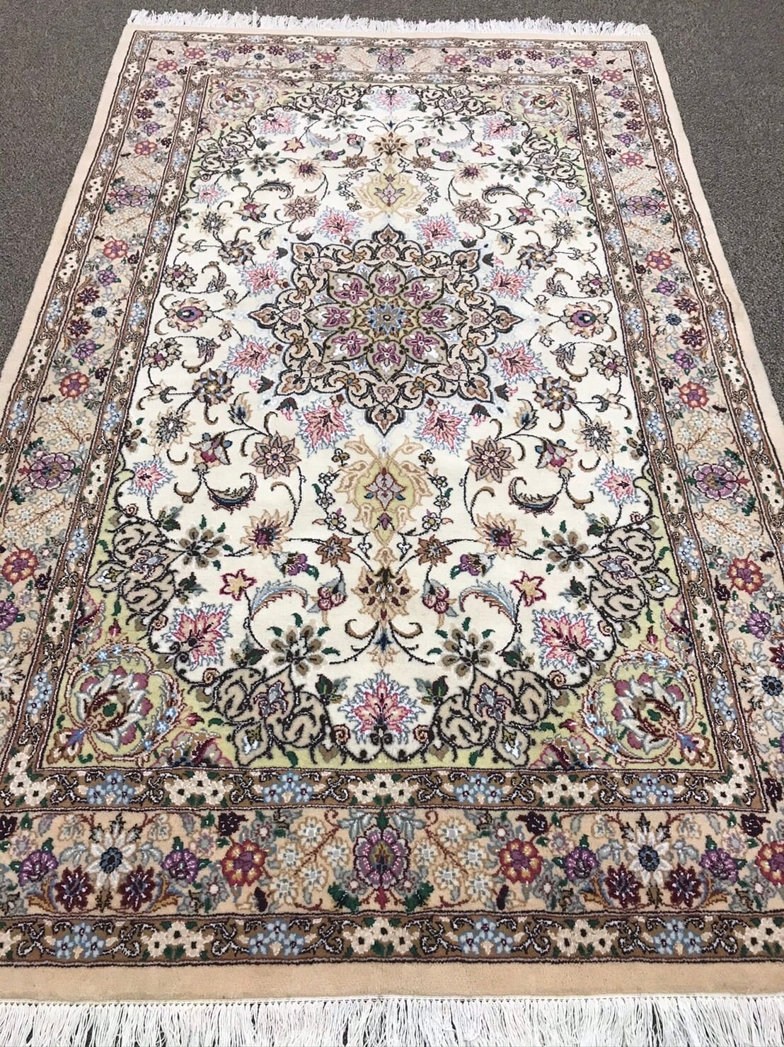 クリーム色系とベージュ系の組み合わせのベースに様々な色味をポイントに使いとても素敵な絨毯です。