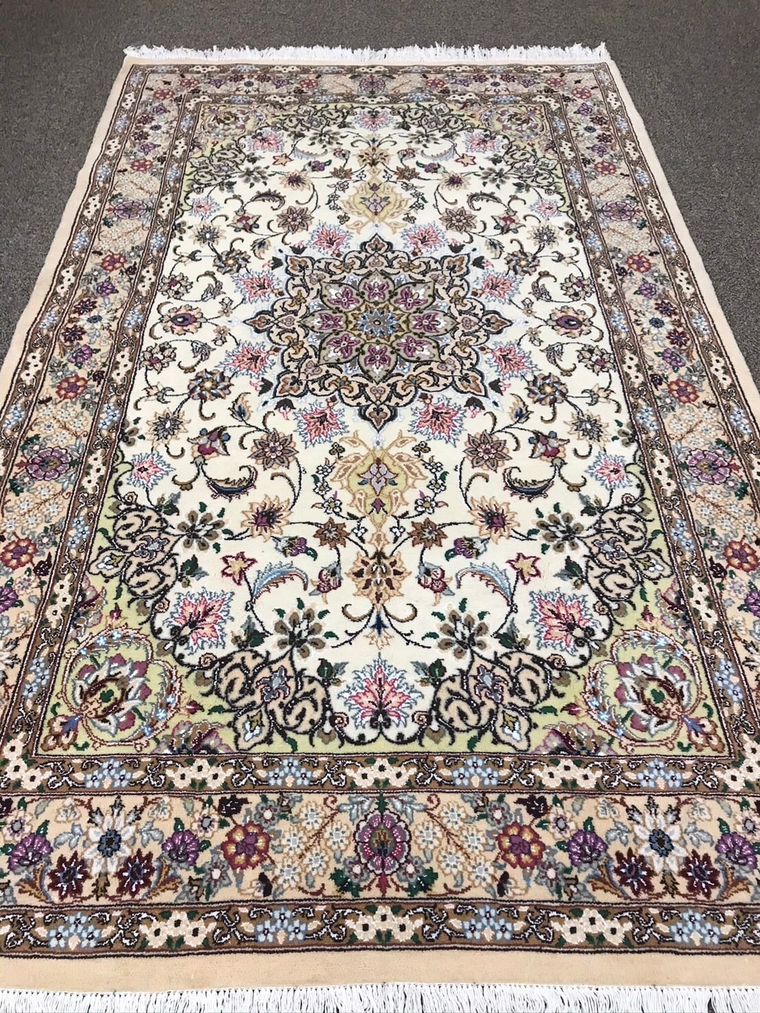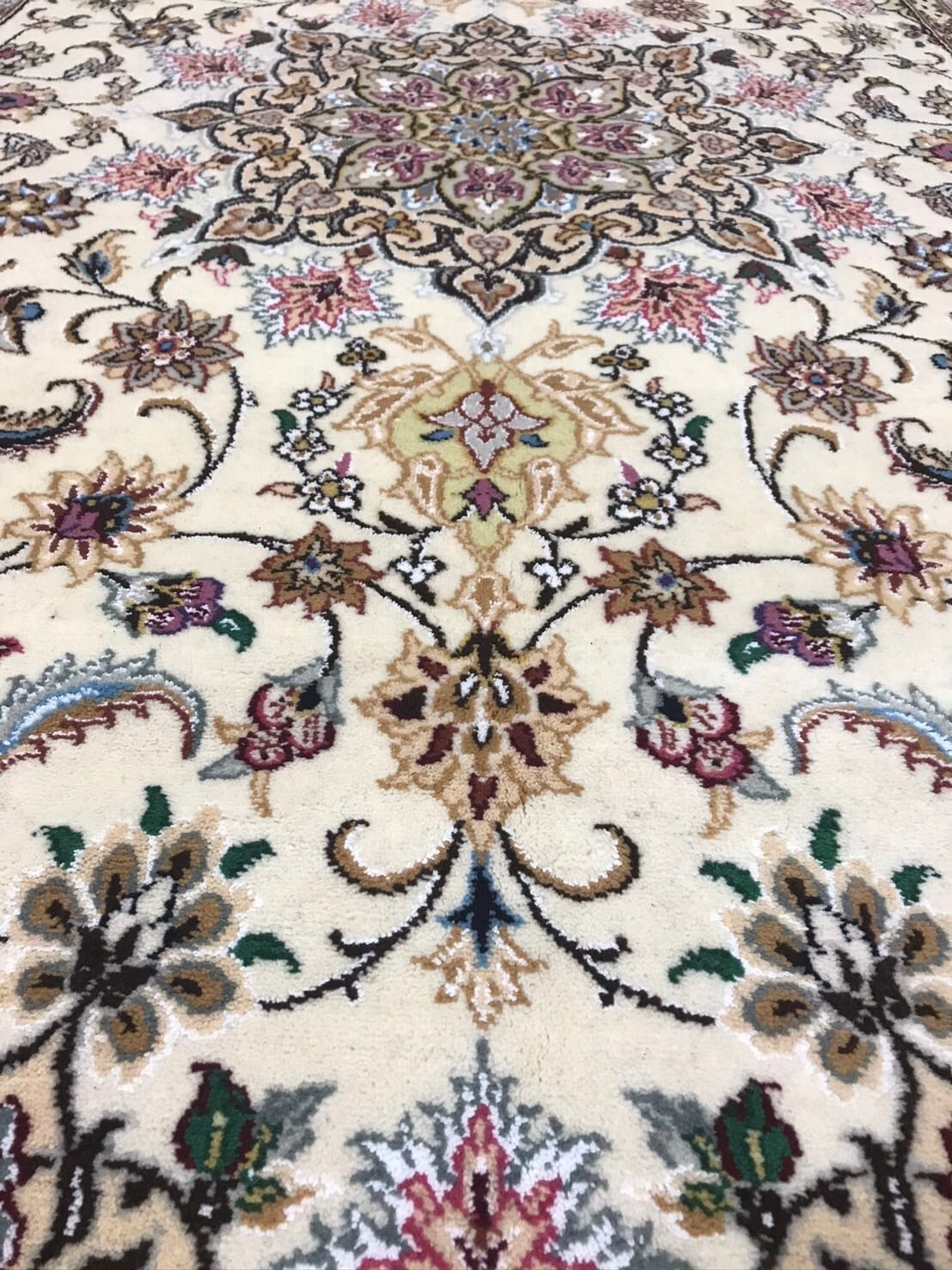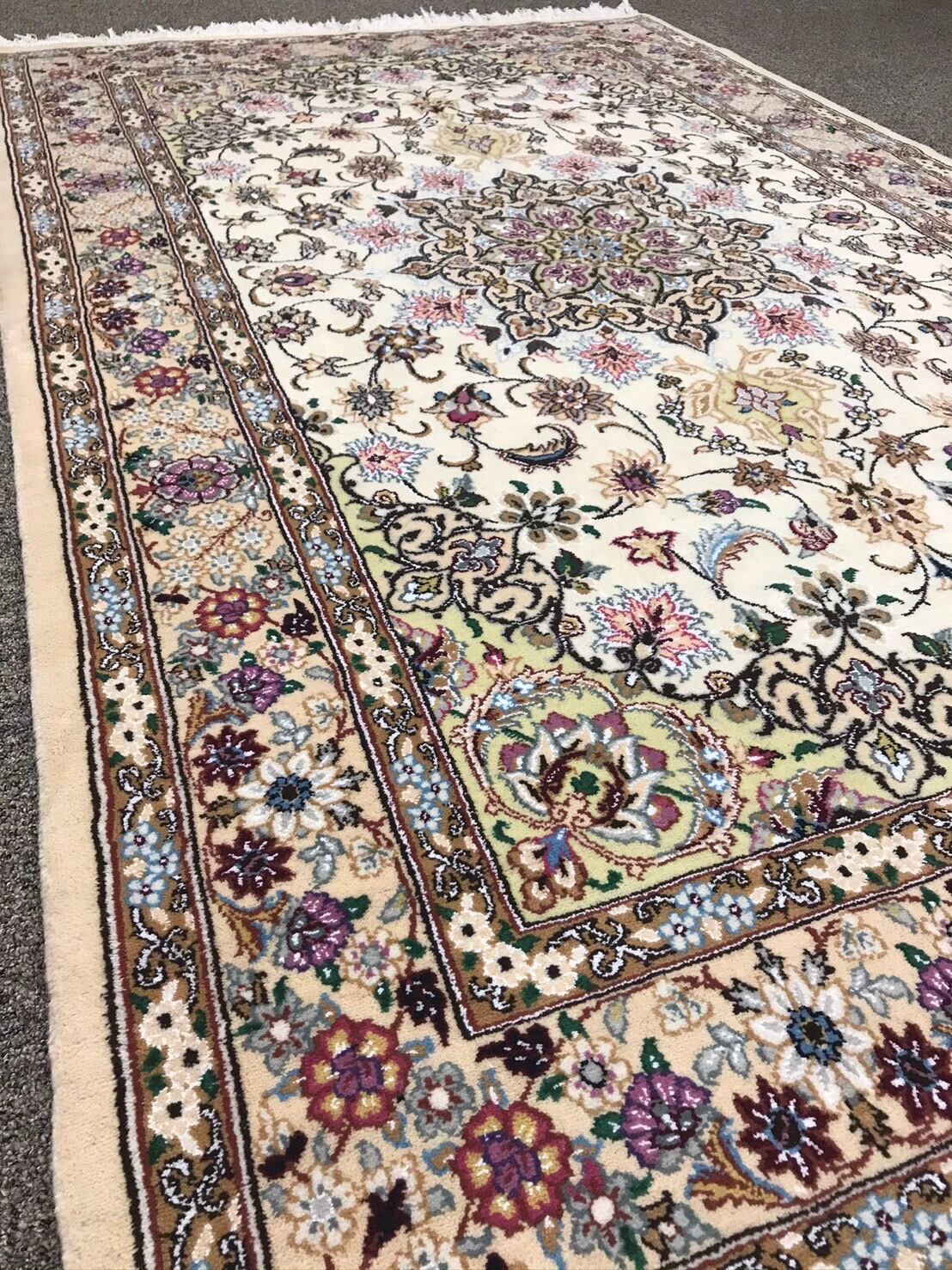 クリーム色系とベージュ系の組み合わせのベースに様々な色味をポイントに使いとても素敵な絨毯です。