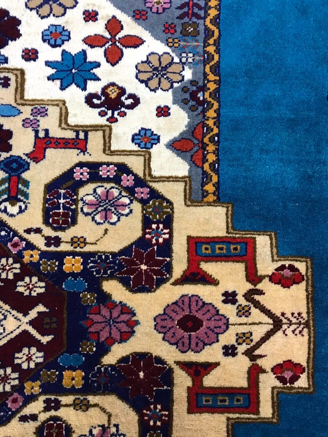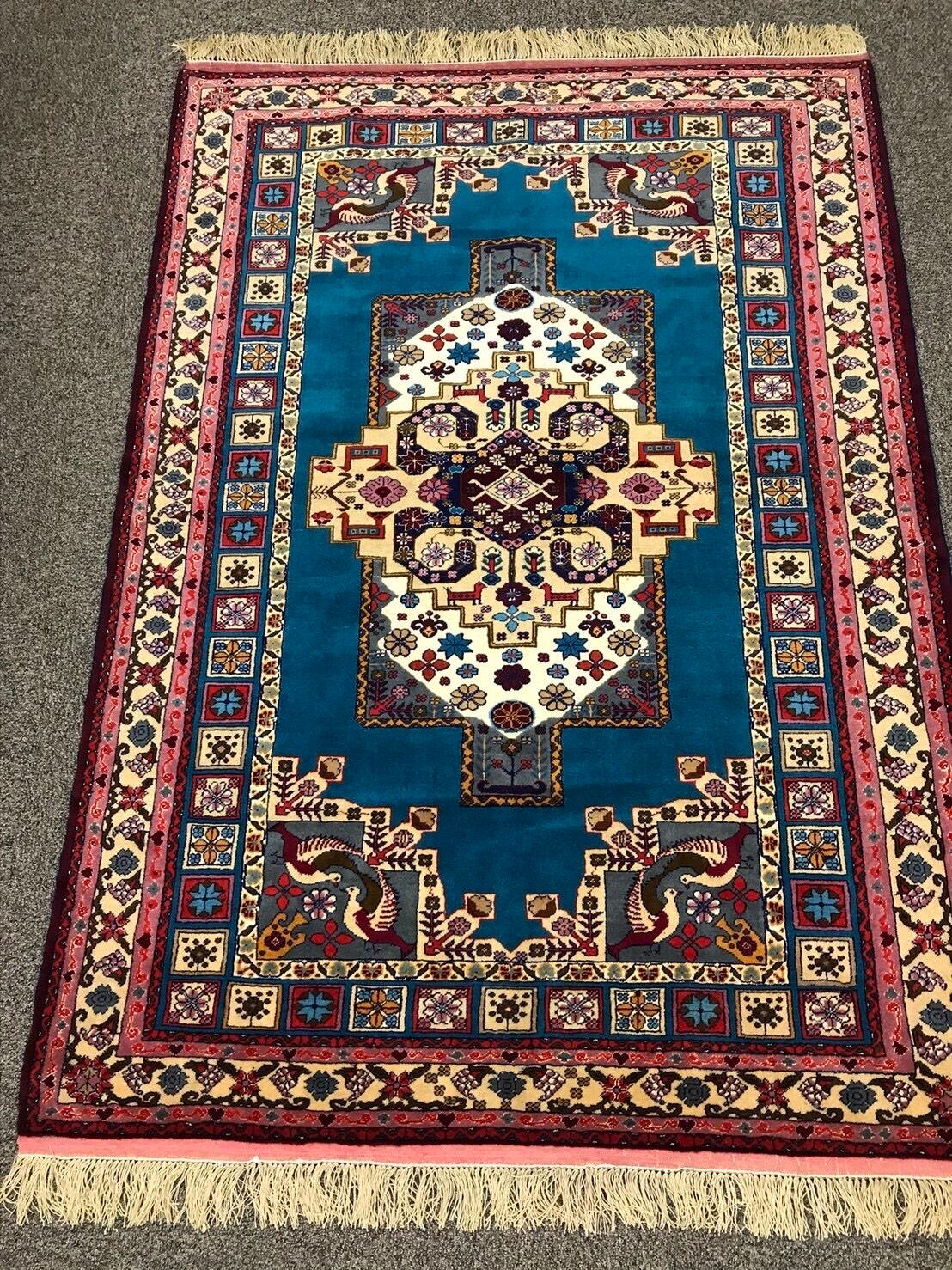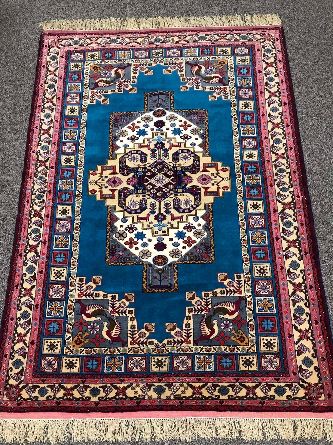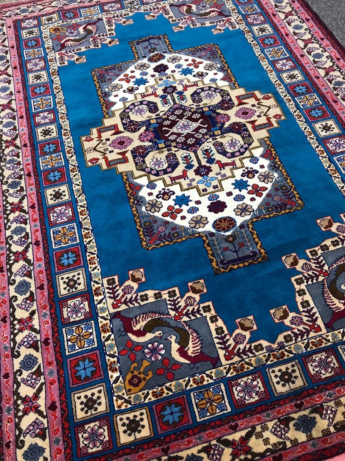 可愛らしい木々や鳥などの動物や植物の図柄がとても楽しく草木染めされた青系の色味がとてもきれいな素敵なペルシャ絨毯です。