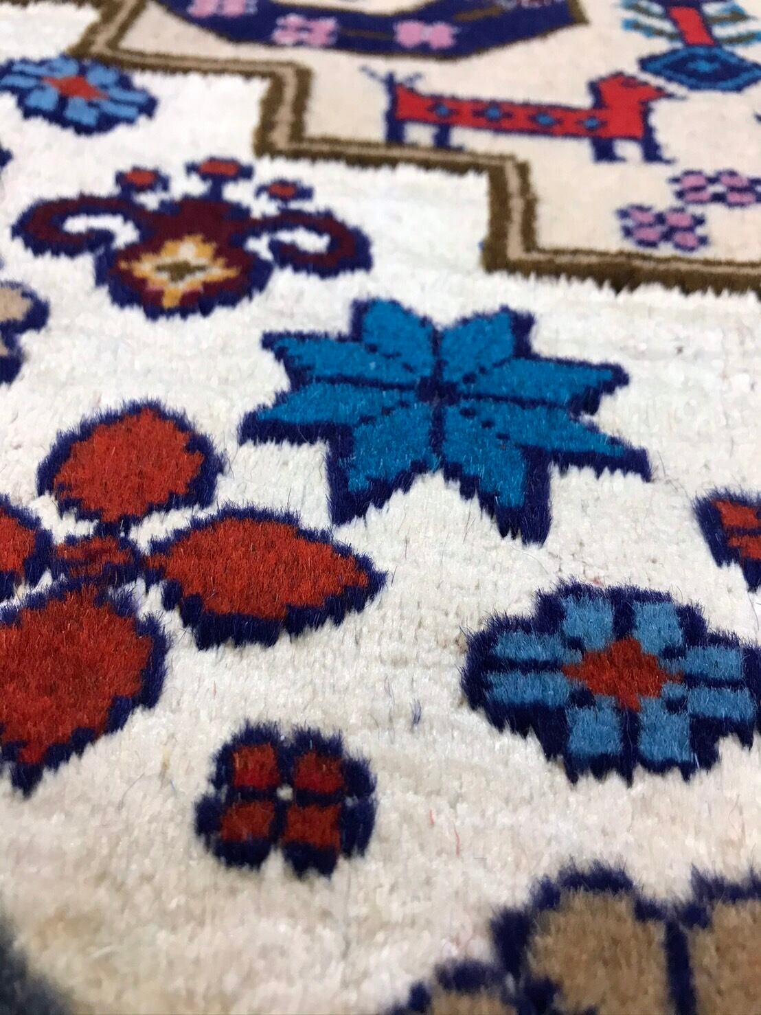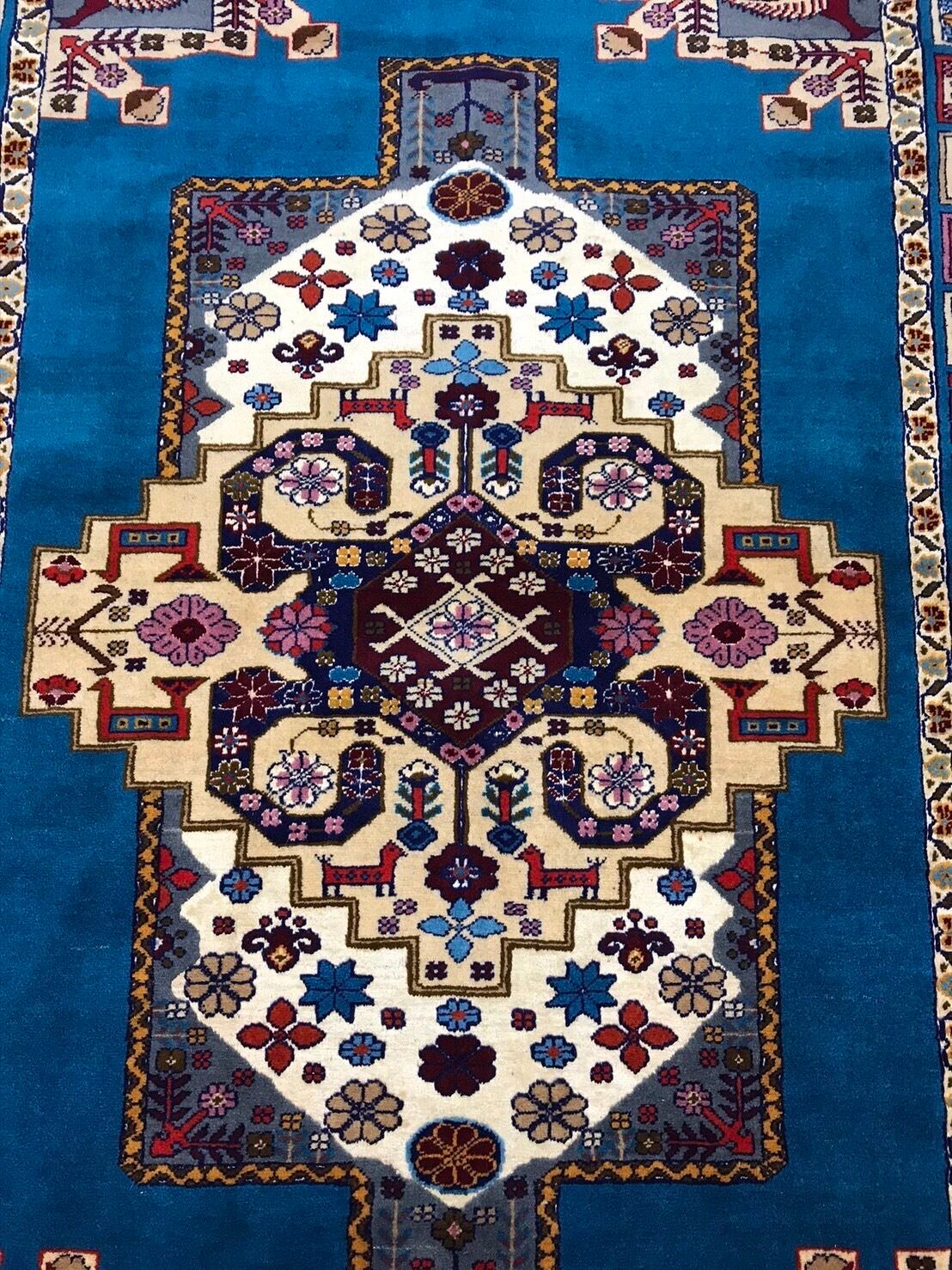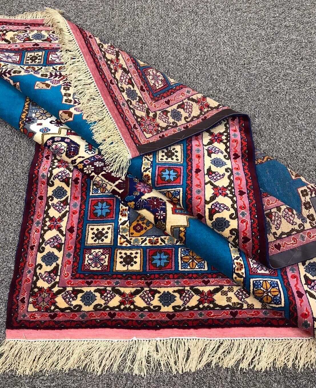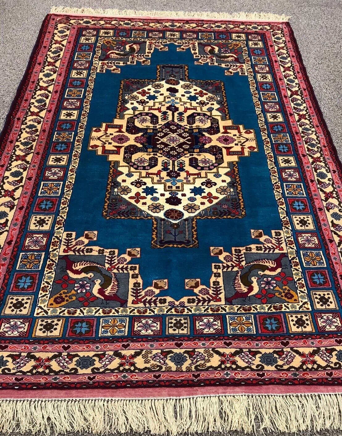 可愛らしい木々や鳥などの動物や植物の図柄がとても楽しく草木染めされた青系の色味がとてもきれいな素敵なペルシャ絨毯です。