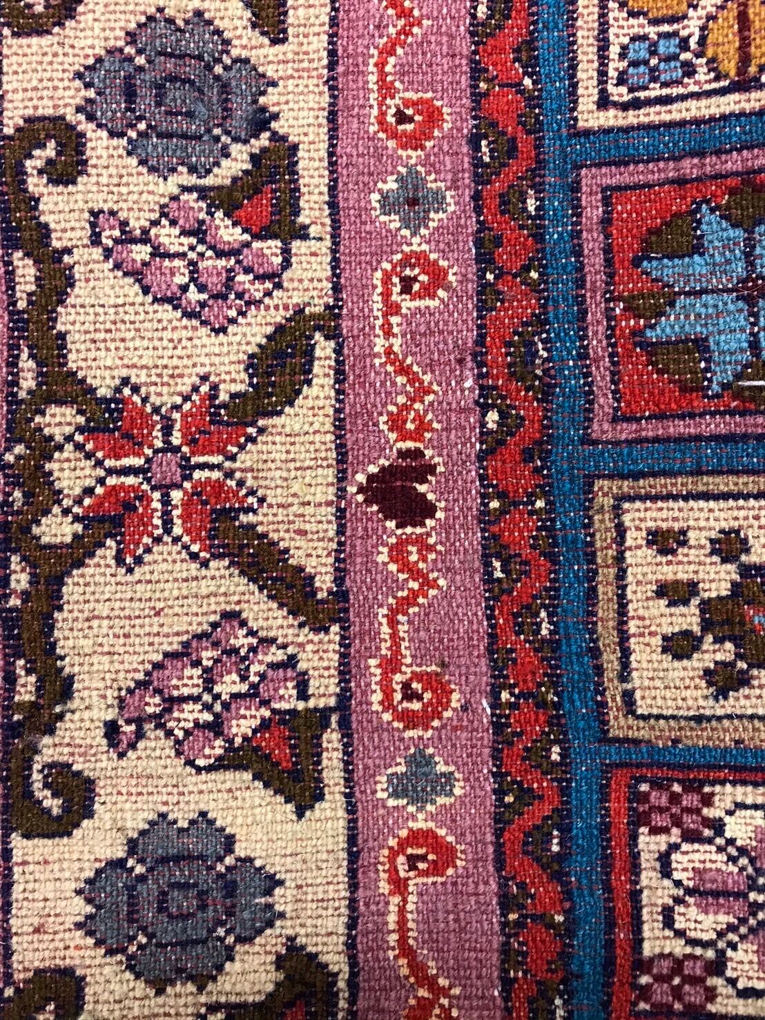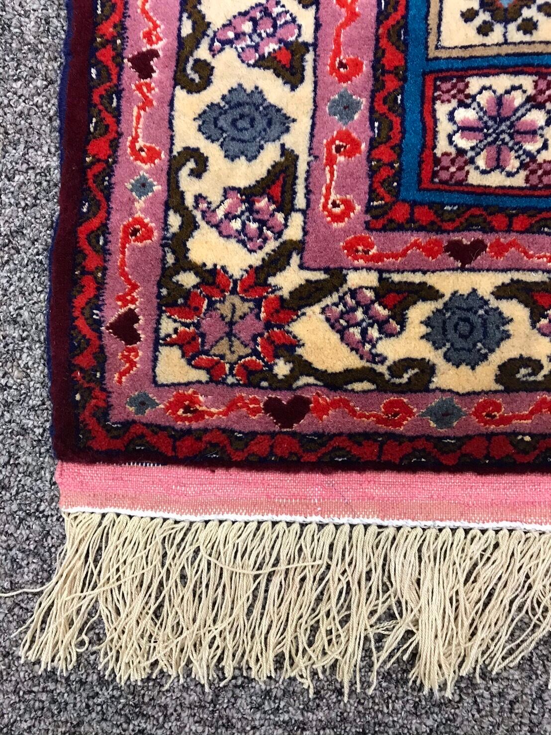 経糸やパイルにシルクを使用しているのでとても柔らかくしなやかで艶のあり、見る方向や角度で色味が濃く出たり明るく出たりと楽しめる絨毯です。(2・3枚目参照)