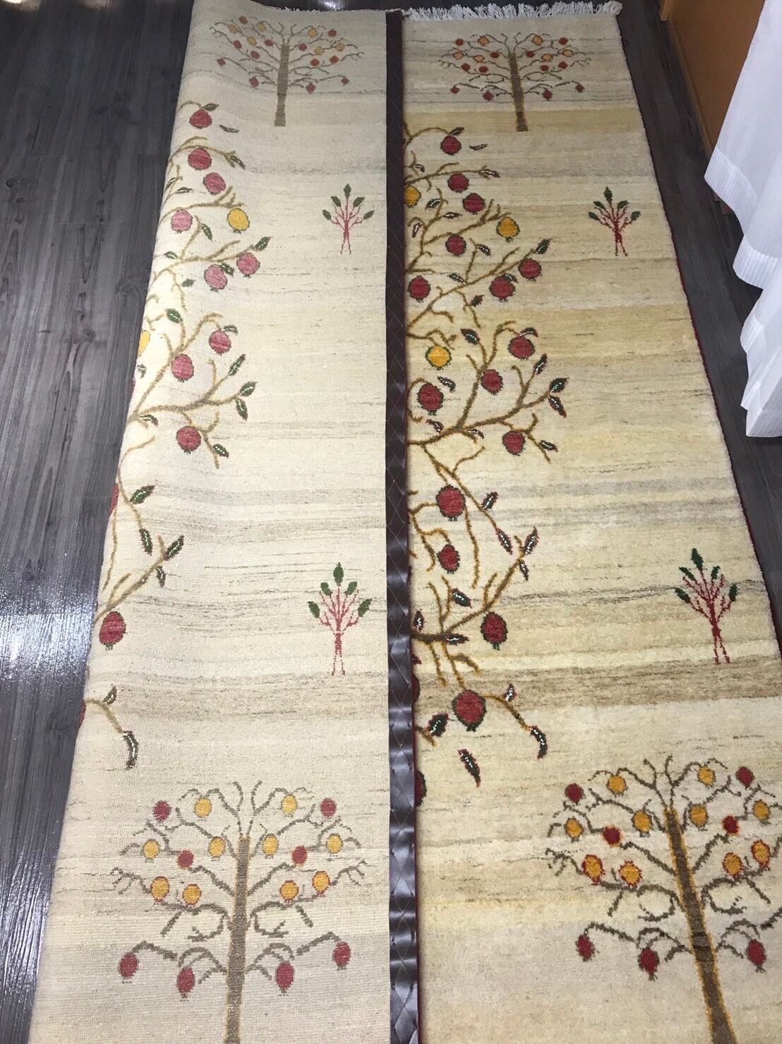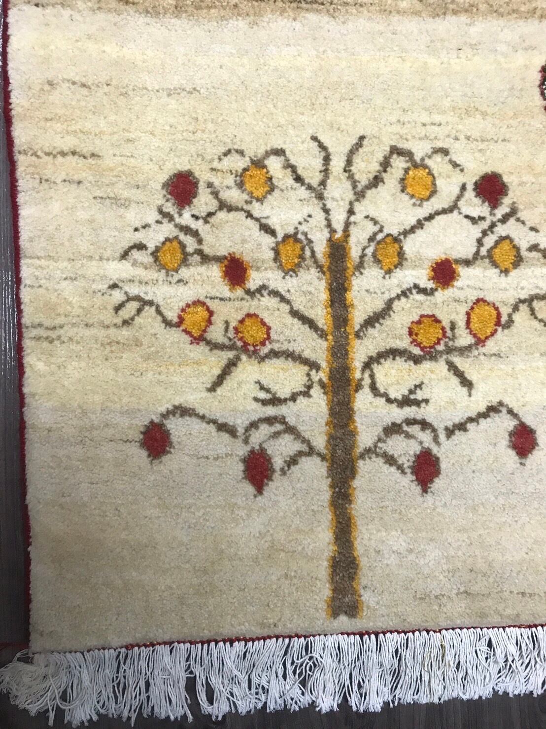 ナチュラルなベージュやアイボリー系や一部茶系ミックス(無染色の羊さんの毛の色)のフィールドに赤や黄色の実を付けた堂々とした姿のザクロの木を中心に周りにもザクロの木や生命の木がバランス良く織られた素敵なギャッベです。