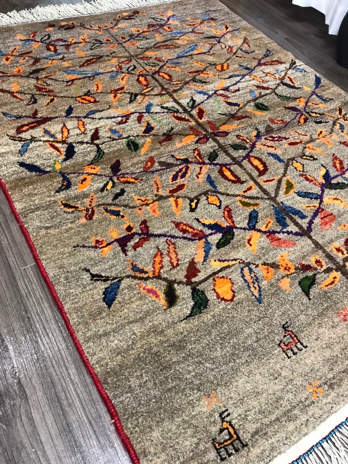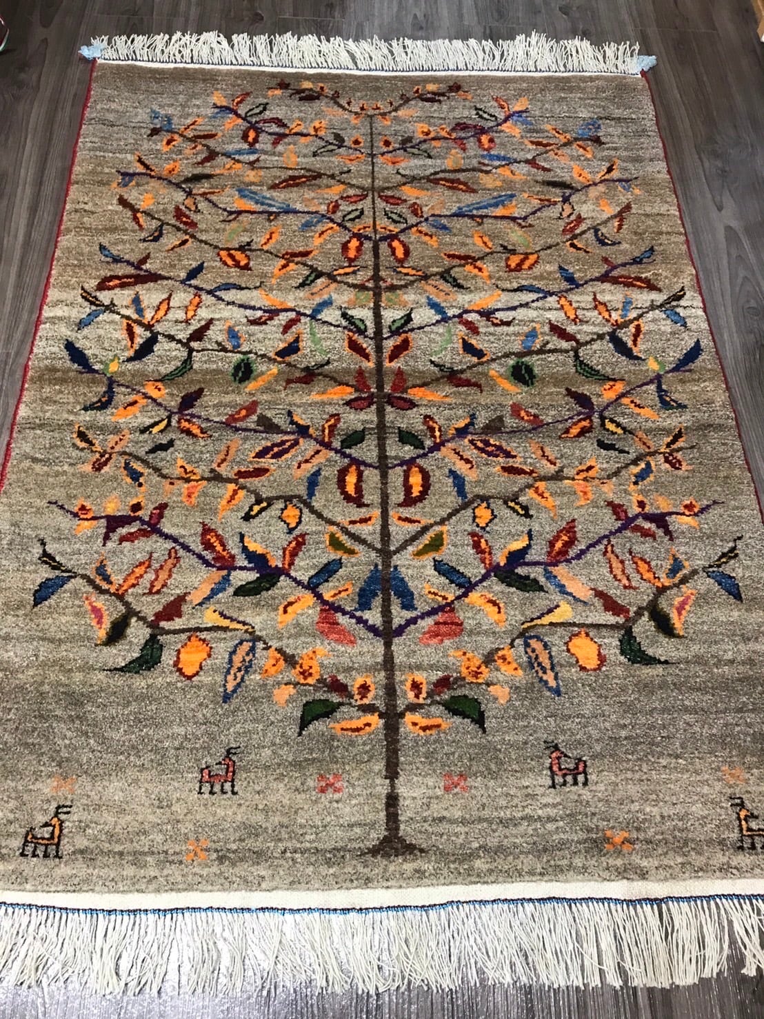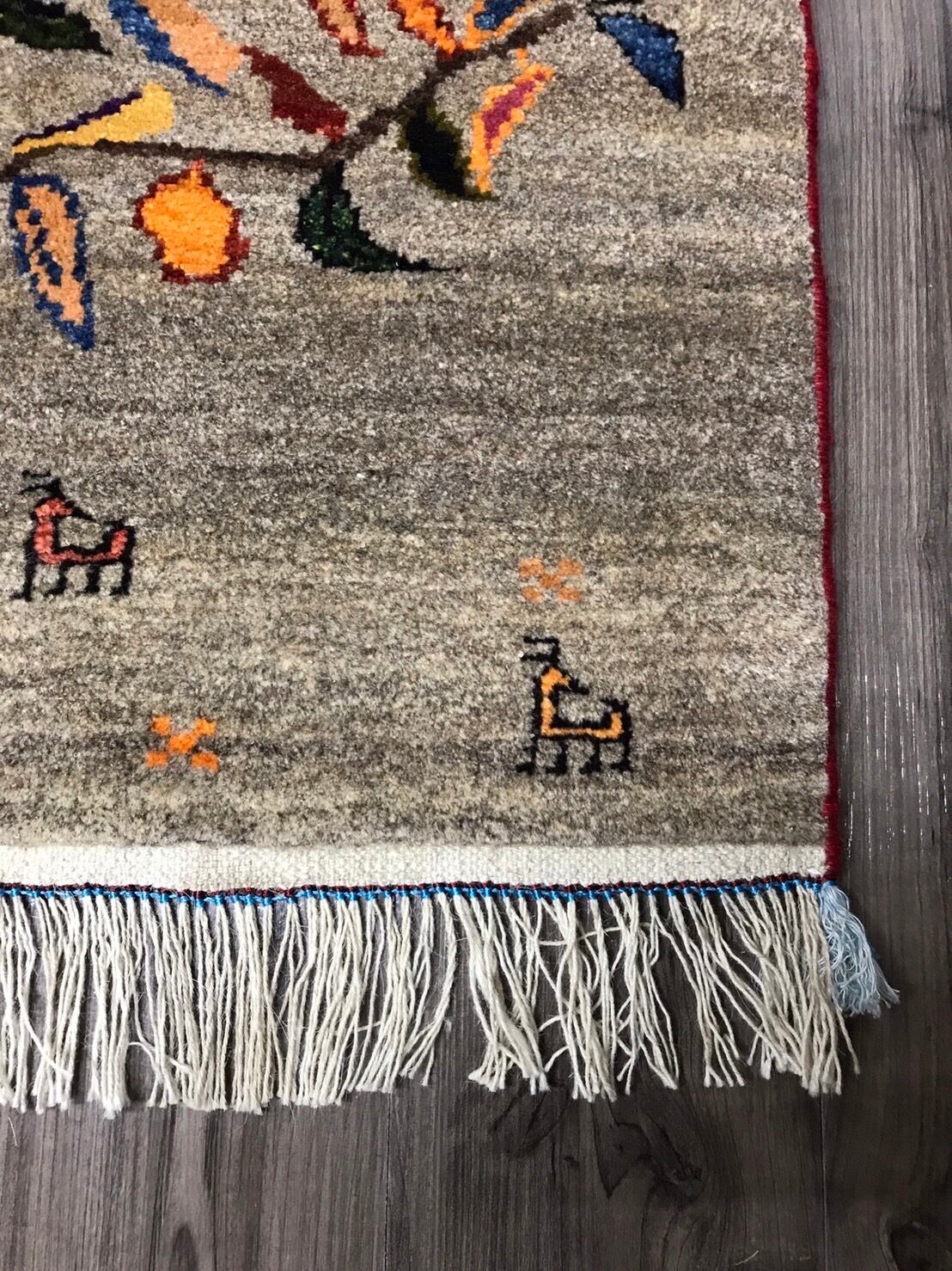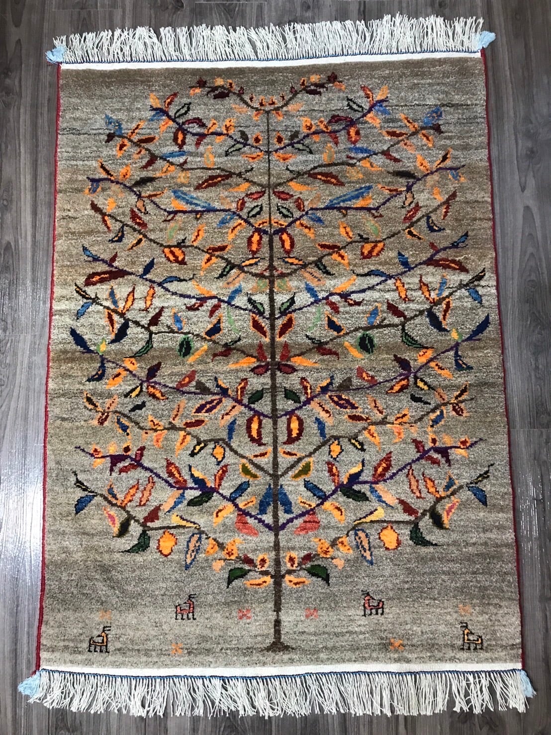 新品 ペルシャ絨毯 手織り リズギャッベ 120cm×90cm 茶系ナチュラル 生命の木 山羊 花