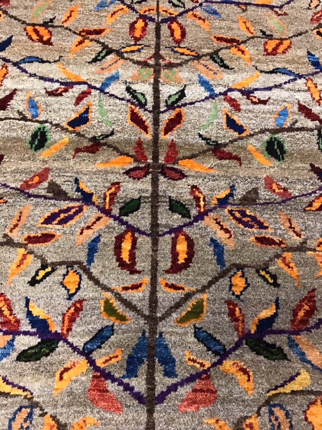 ナチュラルの茶系のフィールドいっぱいにカラフルな葉をつけた生命の木の堂々とした姿が印象的なギャッベです