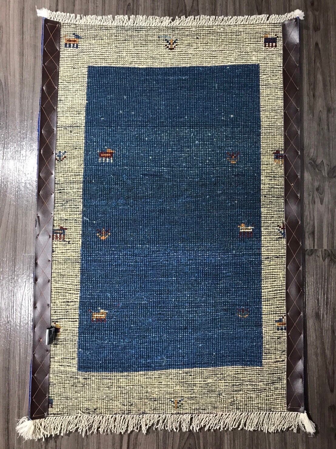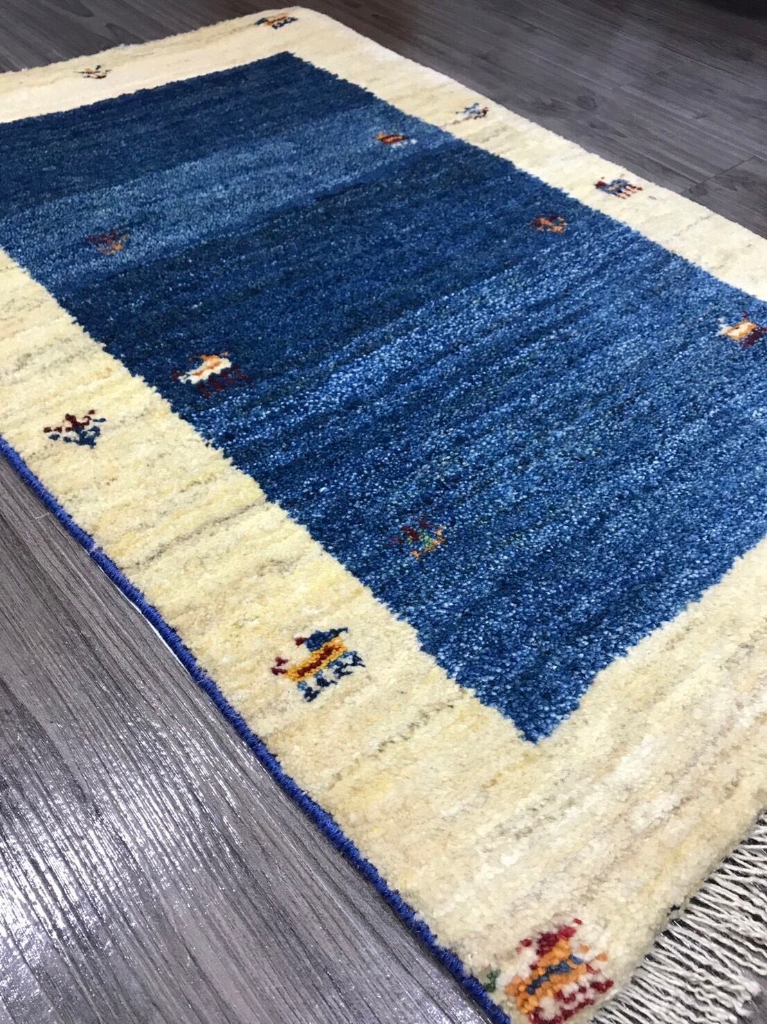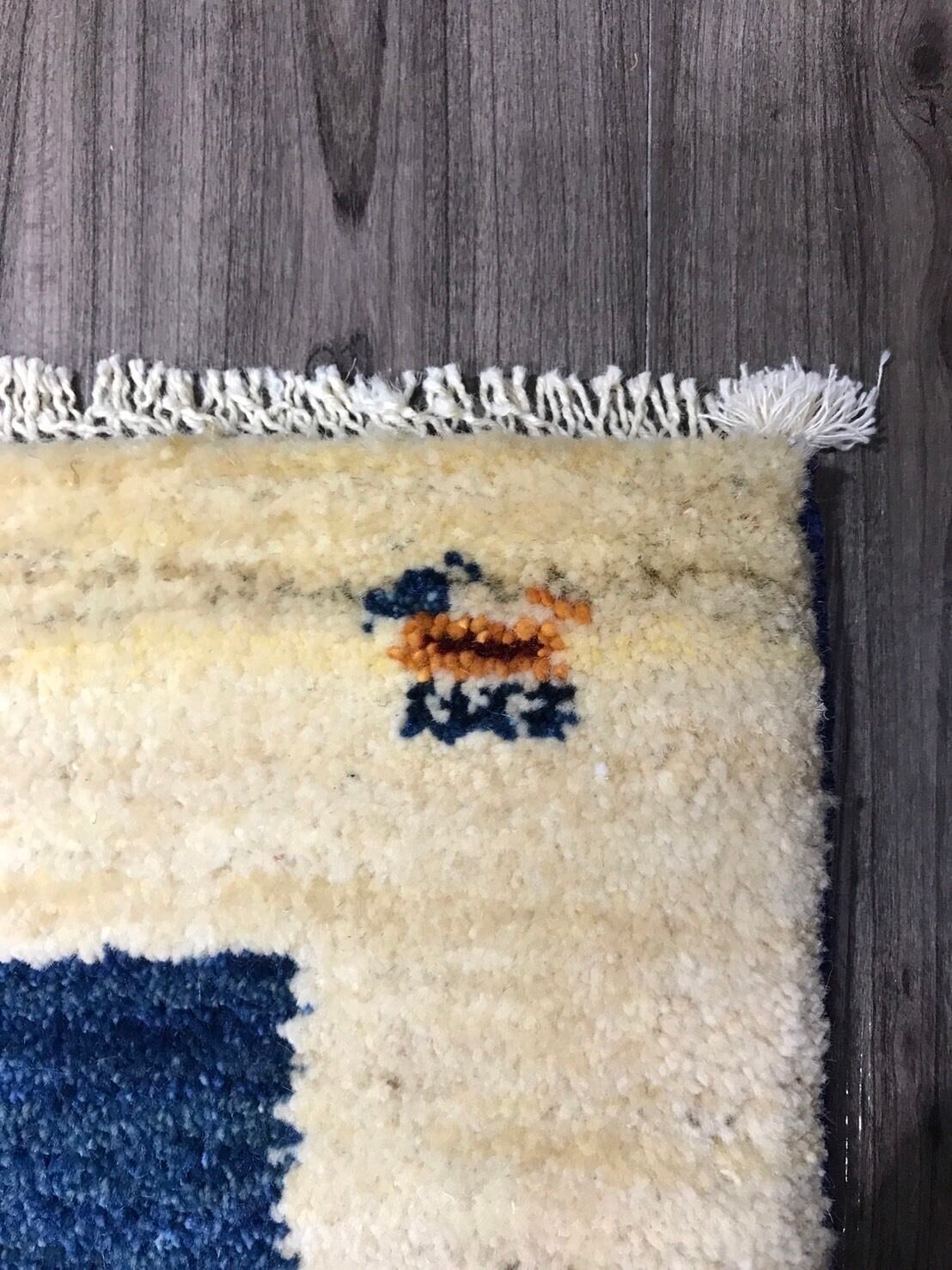 新品 ペルシャ絨毯 手織りギャッベ 87cm×59cm ナチュラル 青 山羊 生命の木