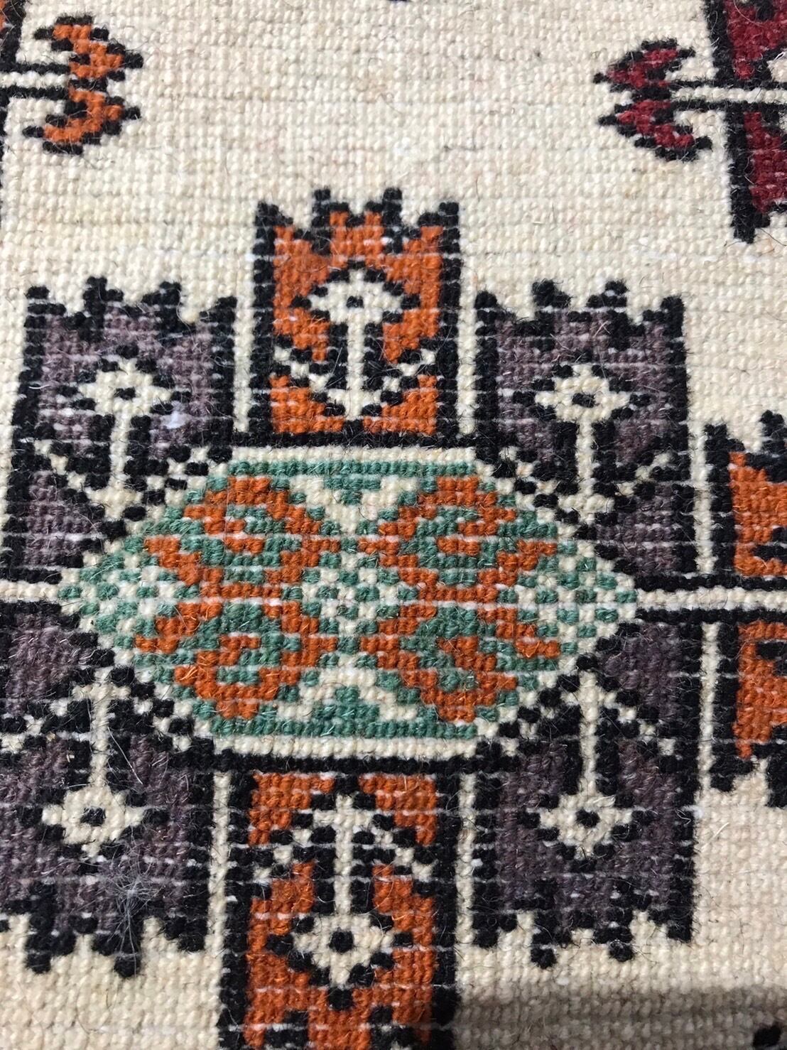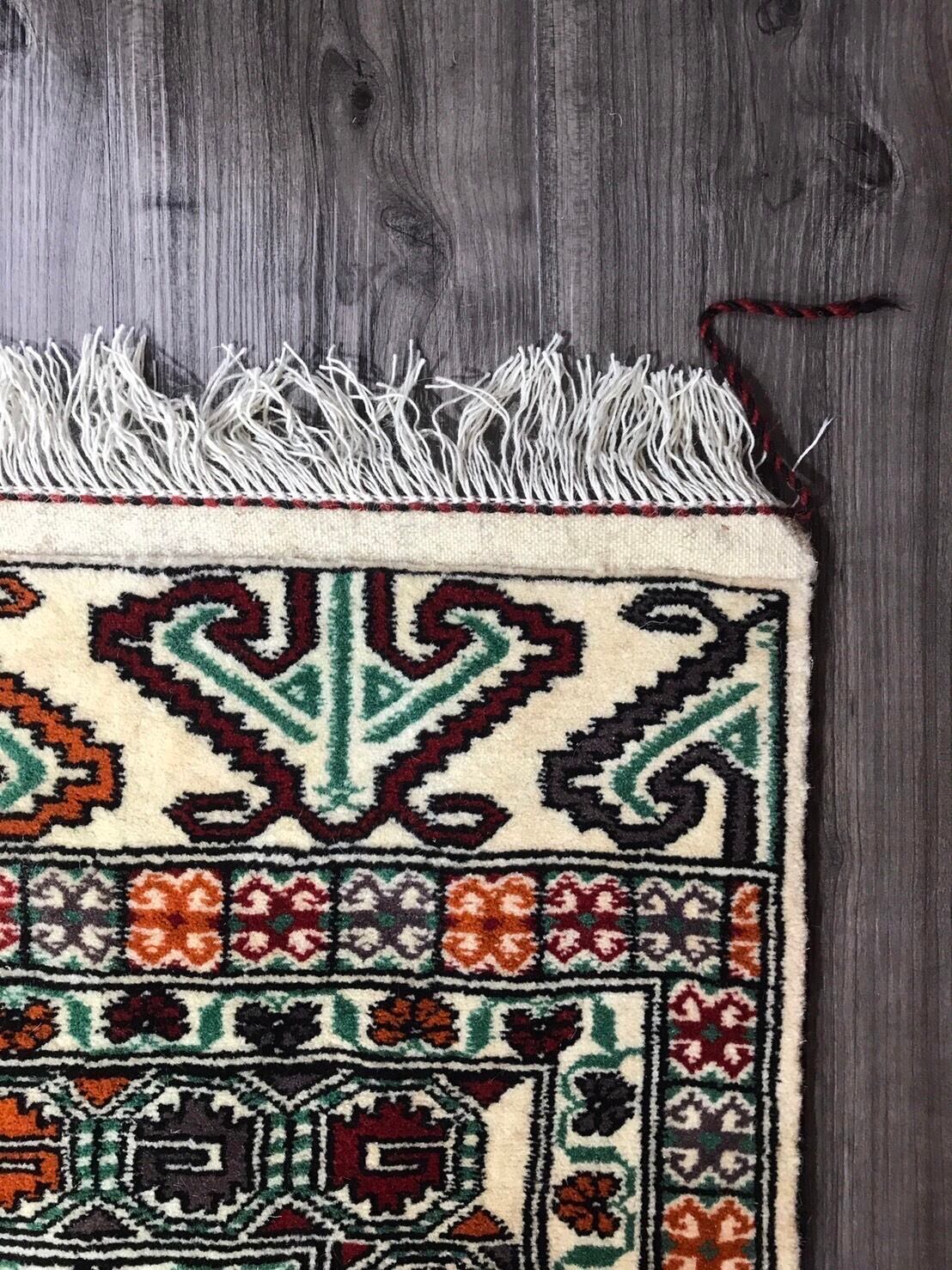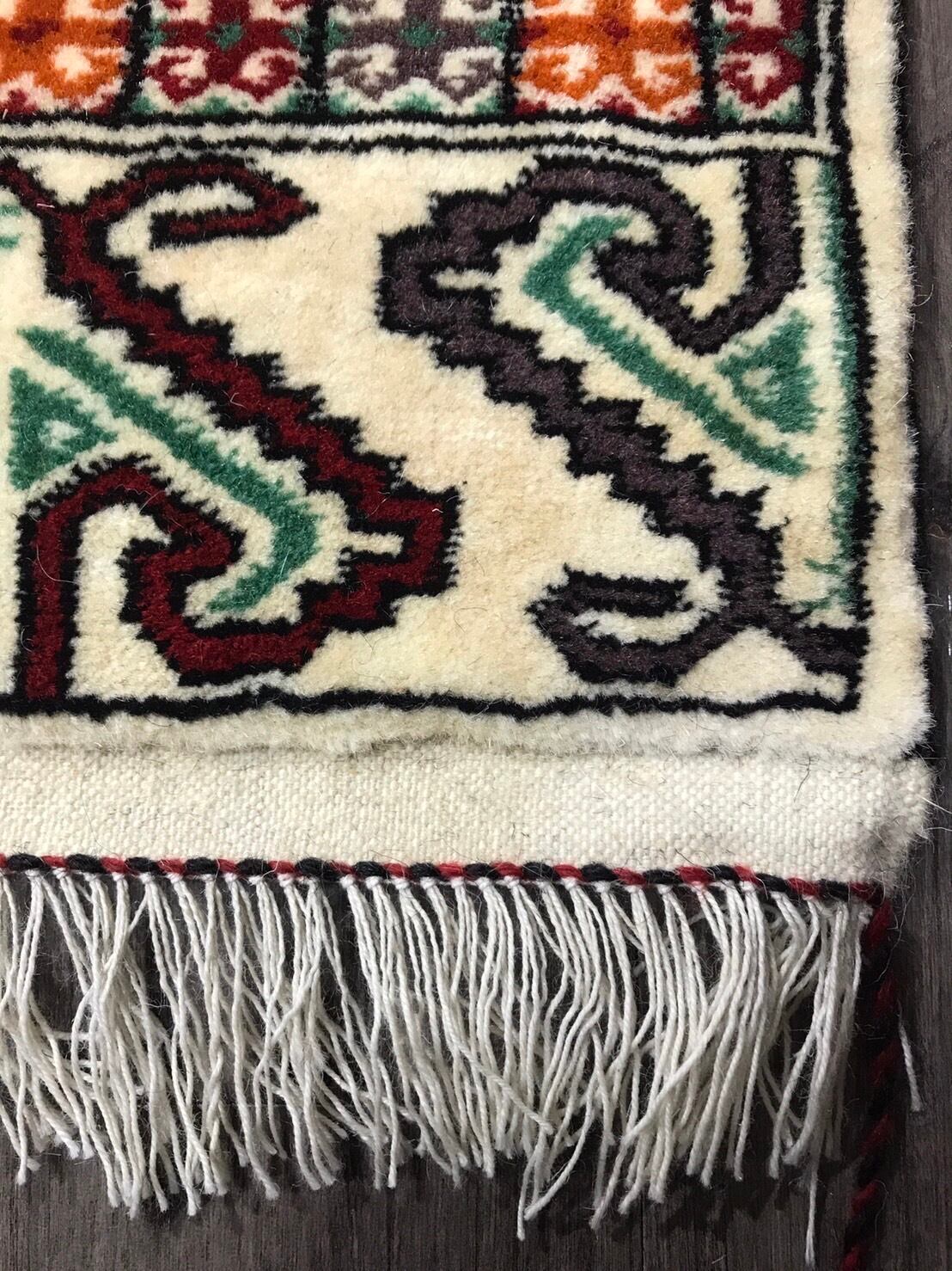 ナチュラルな色味のフィールドに草木染めされたカラフルな色味を使い紋様を織り上げてありとても素敵な絨毯です。