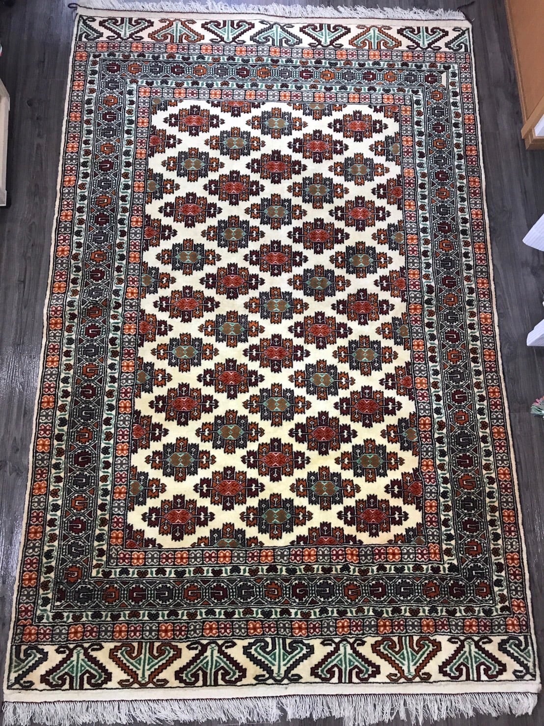 イランの北東部、カスピ海南岸にある州、ゴレスターン州にある町バンダルトルキャマンで作られたトルキャマン産ペルシャ絨毯です。