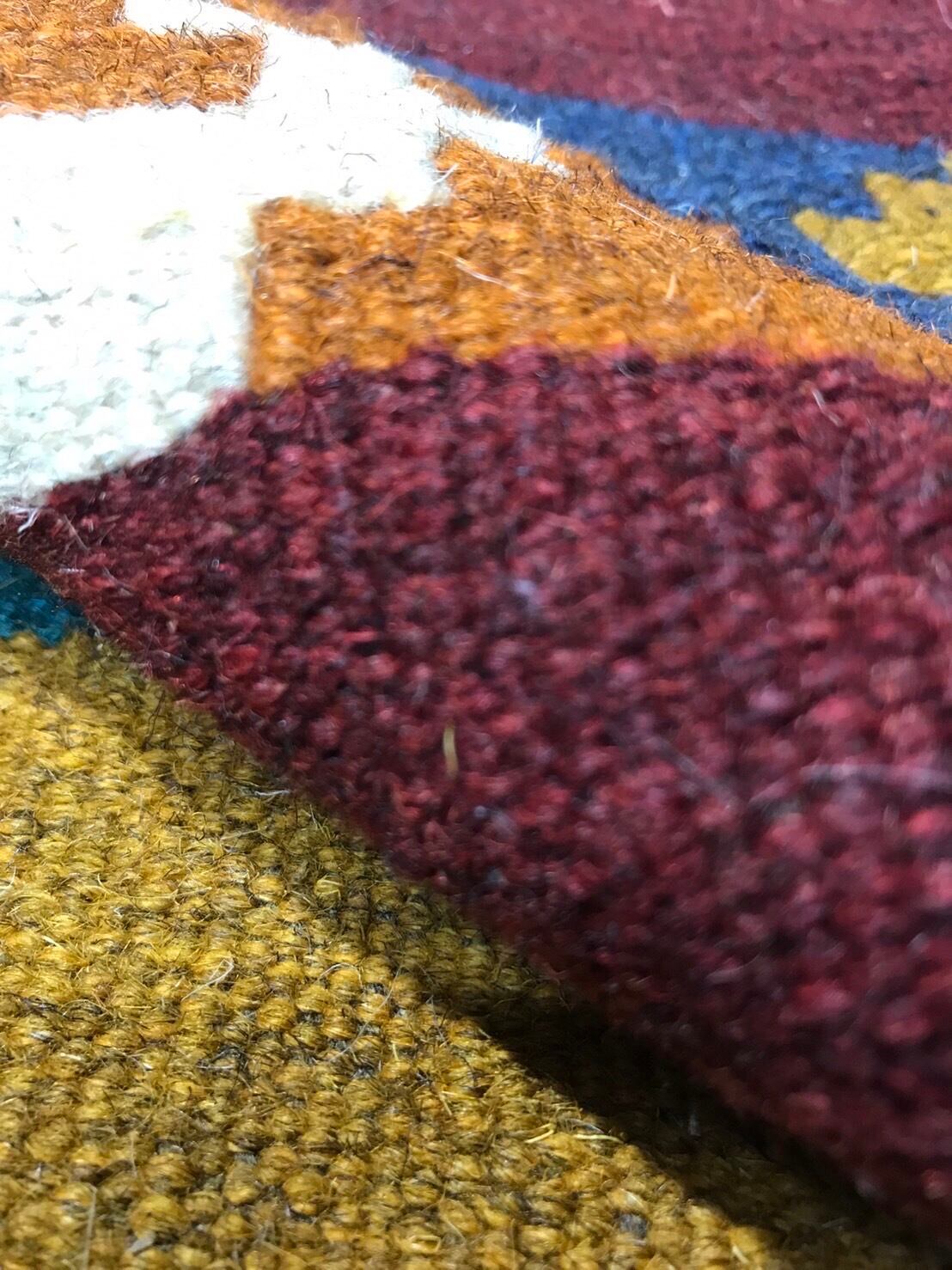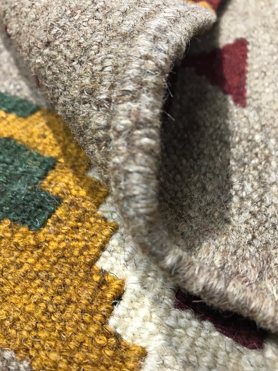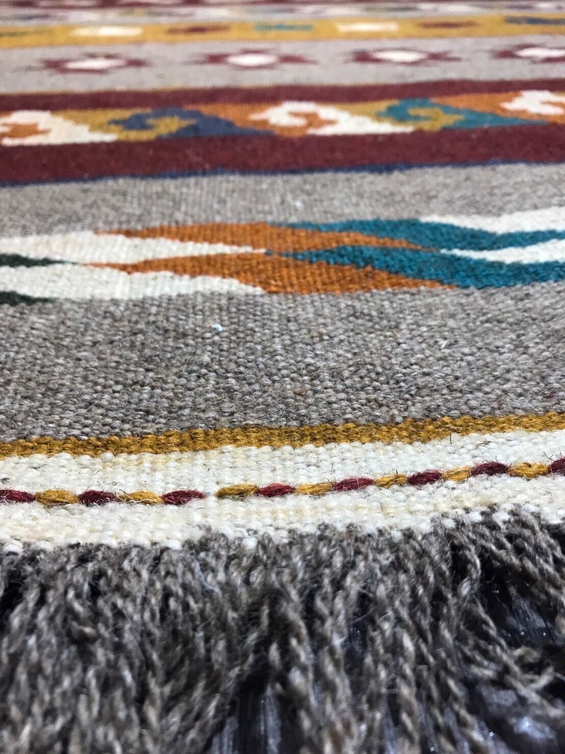 ナチュラルと草木染めされたカラフルな色味の紋様の組み合わせがとても素敵なキリムです。