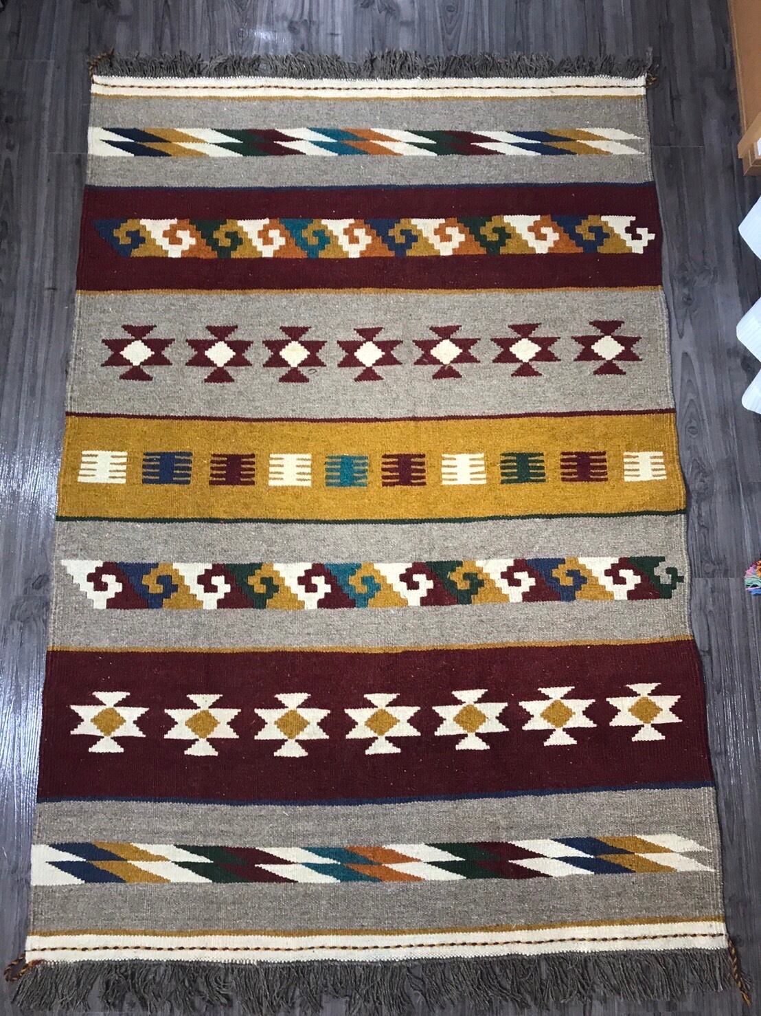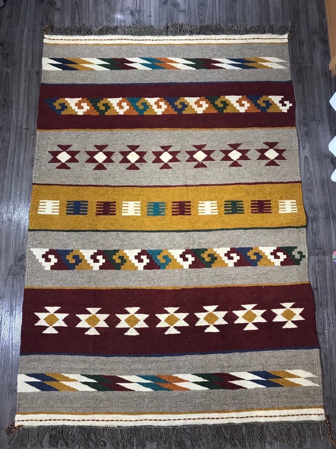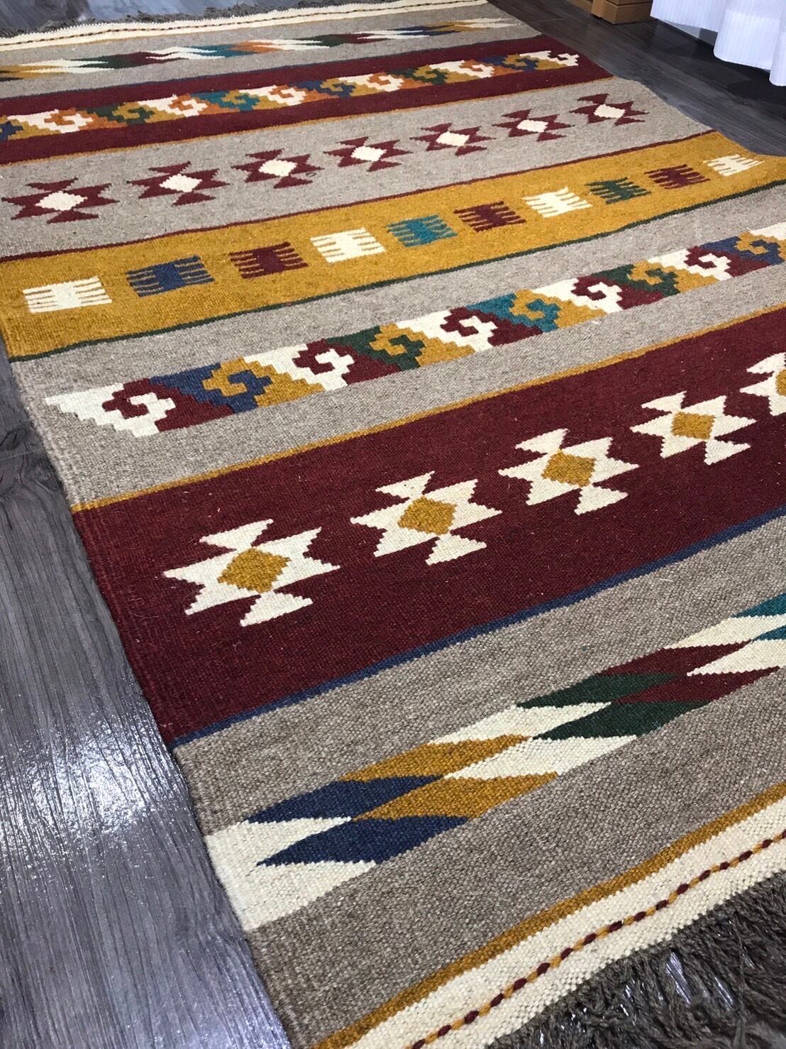 ナチュラルと草木染めされたカラフルな色味の紋様の組み合わせがとても素敵なキリムです。