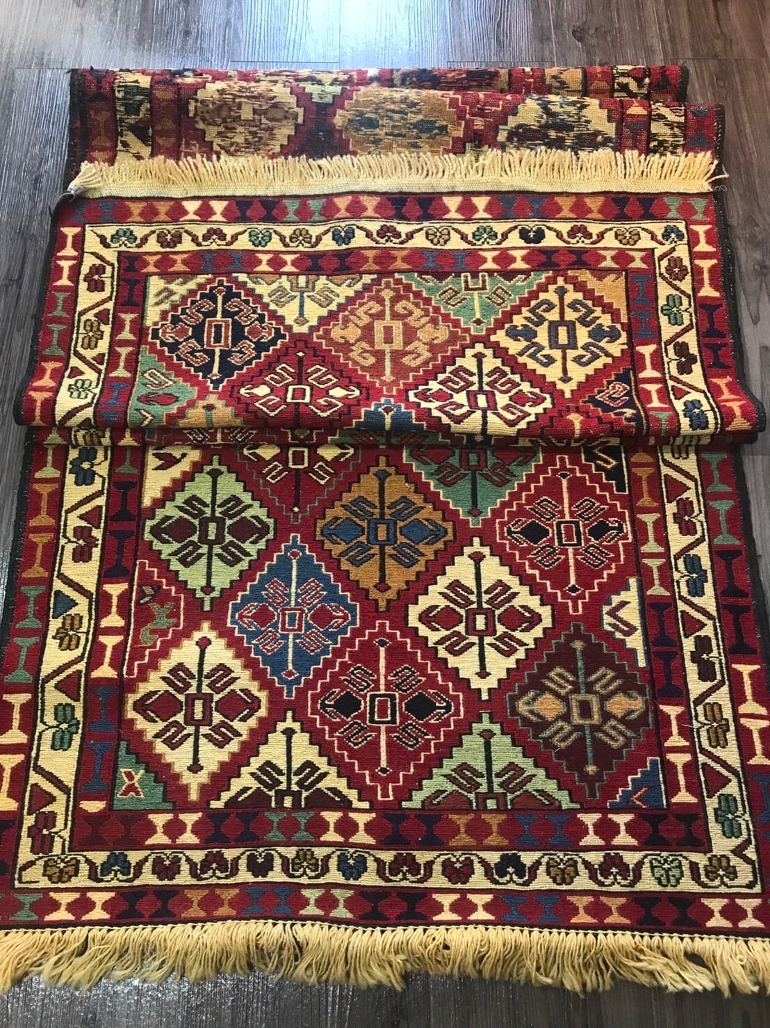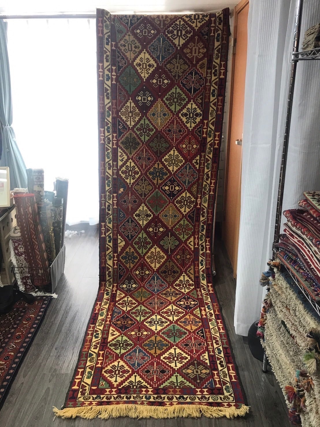 新品 ペルシャ絨毯 手織りキリム スマック織 300cm×85cm ウール 草木染め ランナータイプ