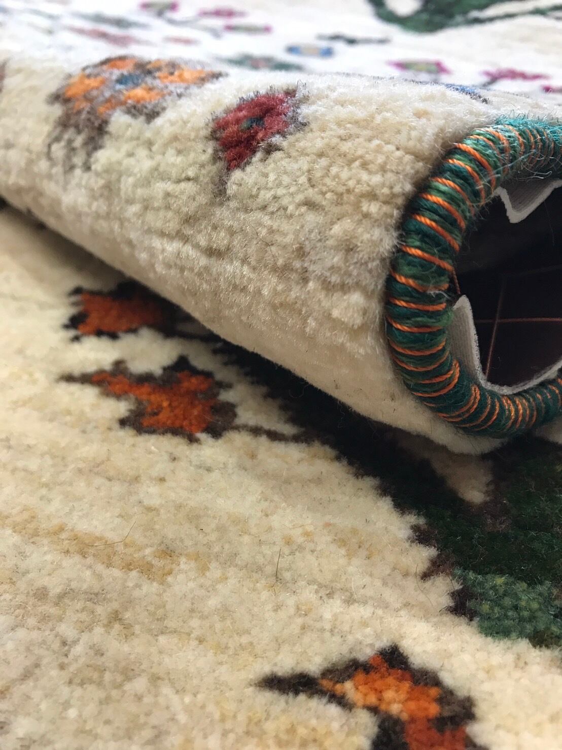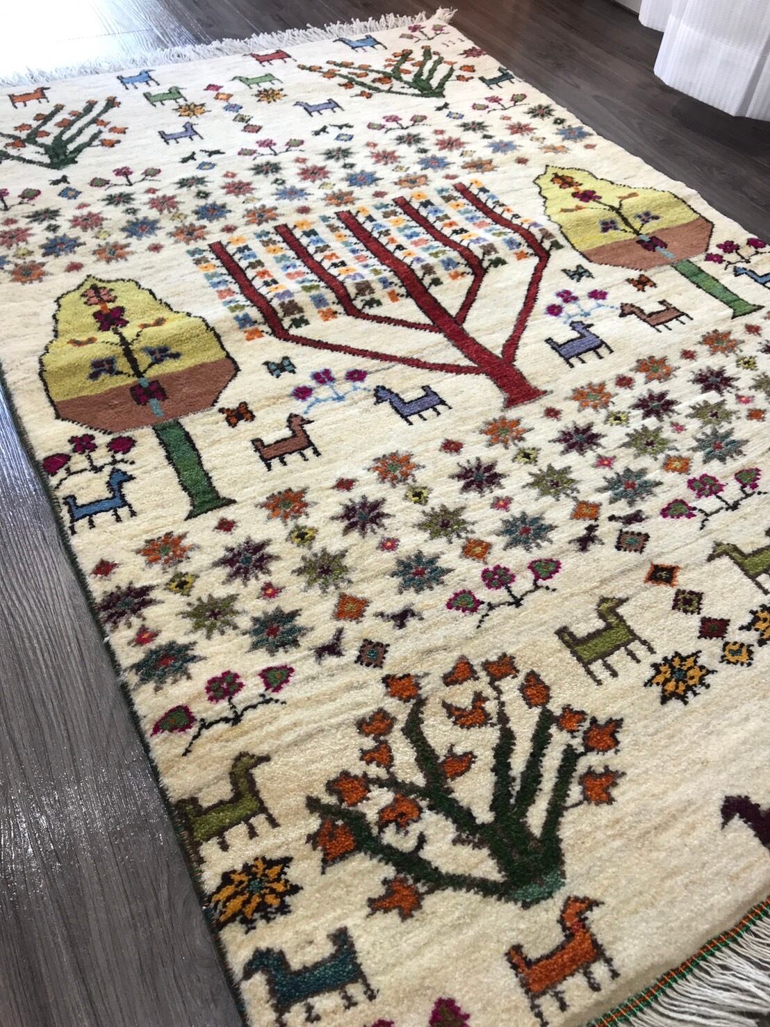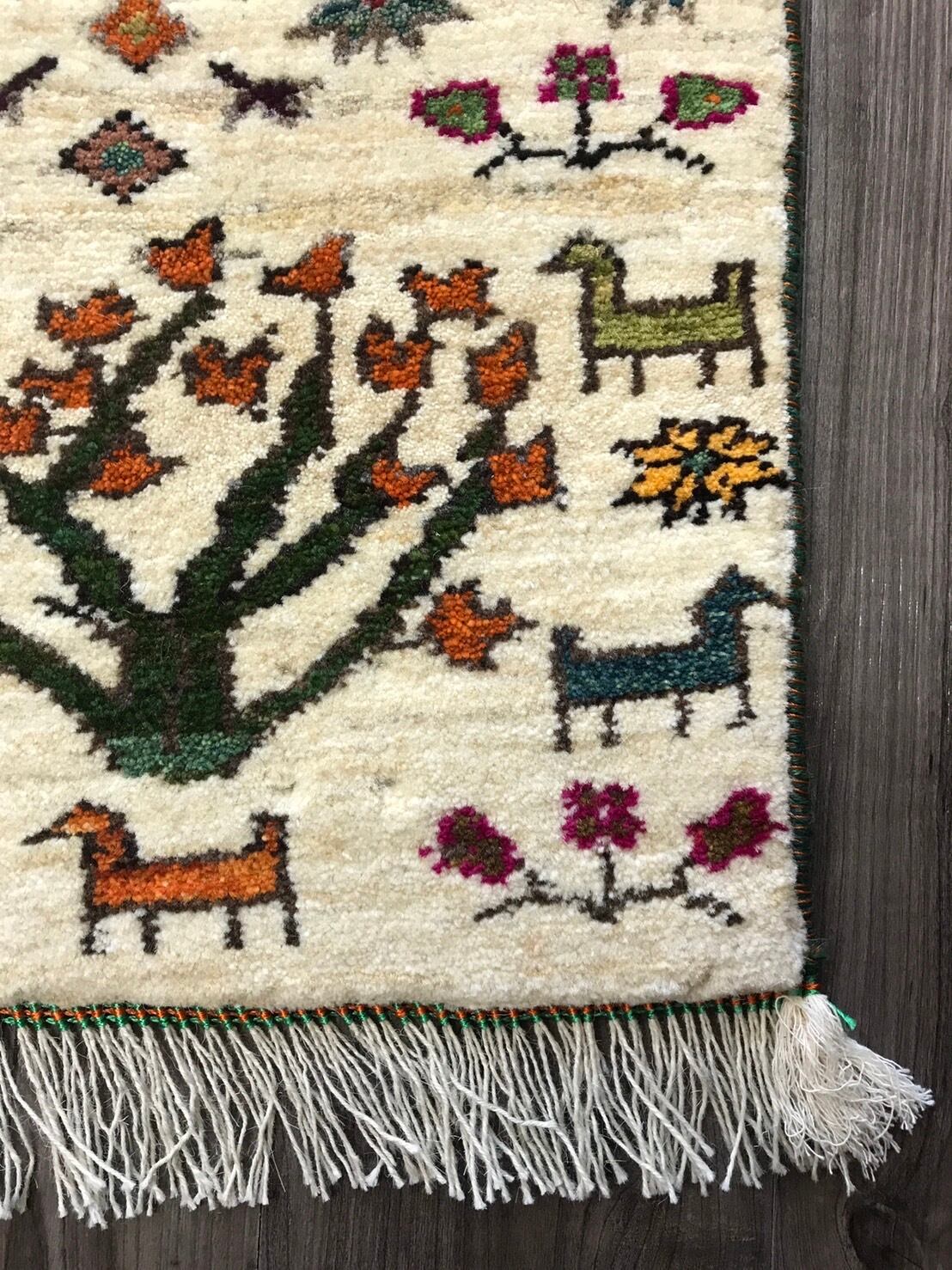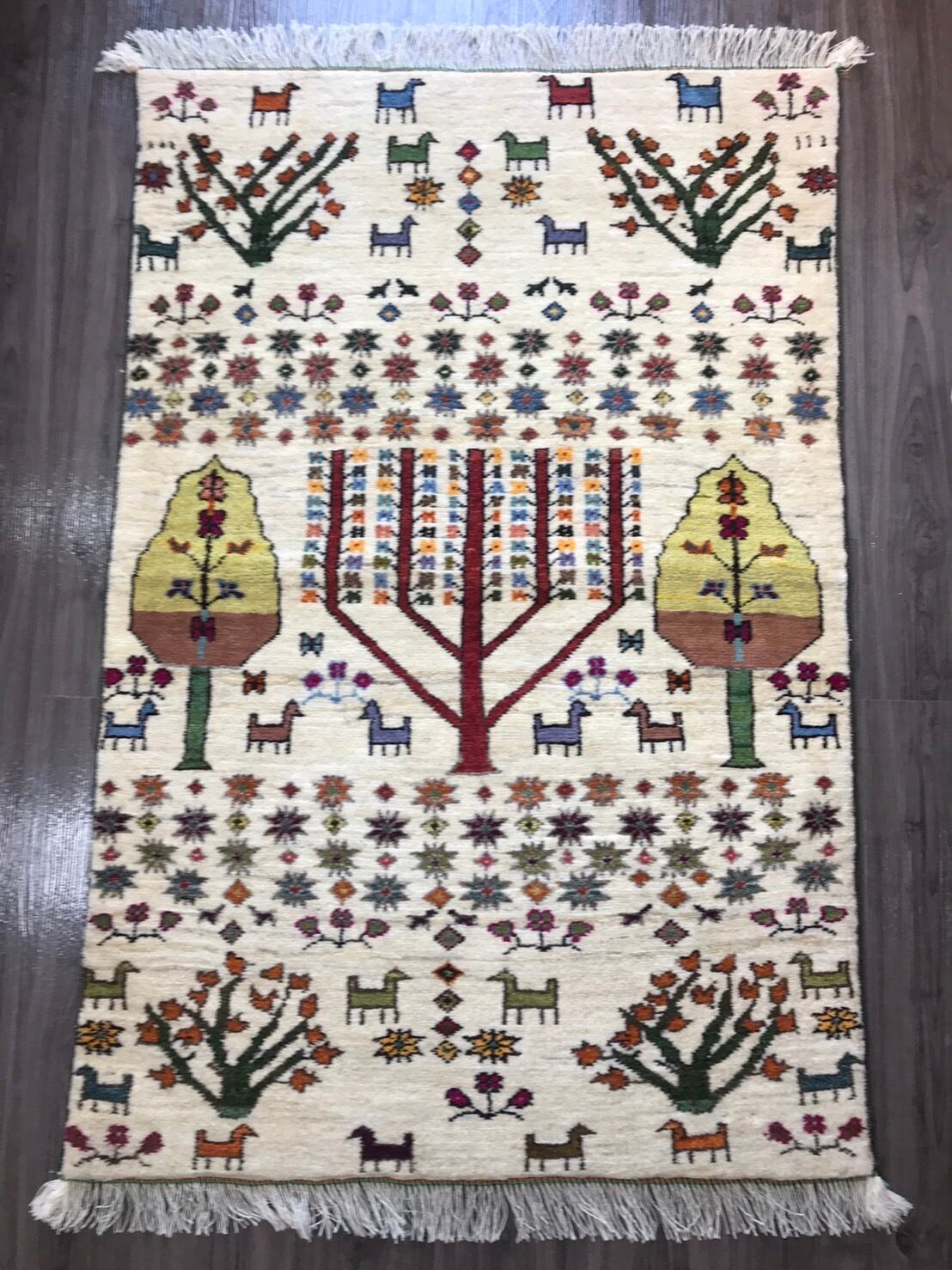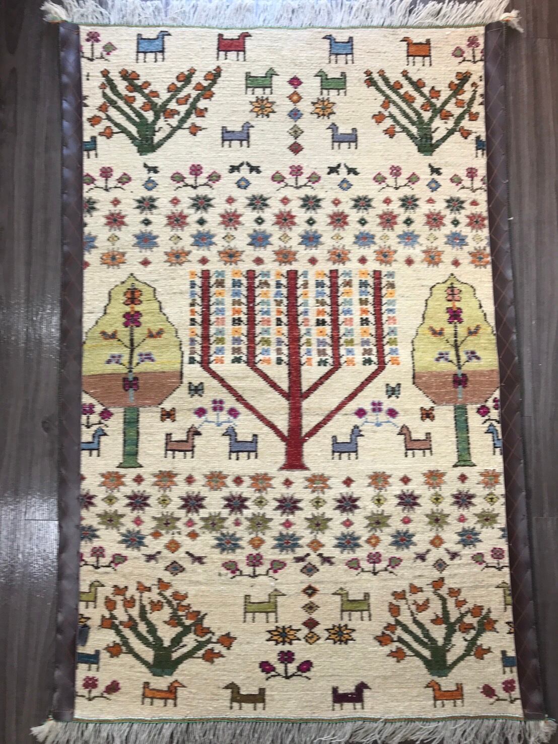 新品 ペルシャ絨毯 手織り リズギャッベ 126cm×84cm ナチュラル 生命の木 山羊 花
