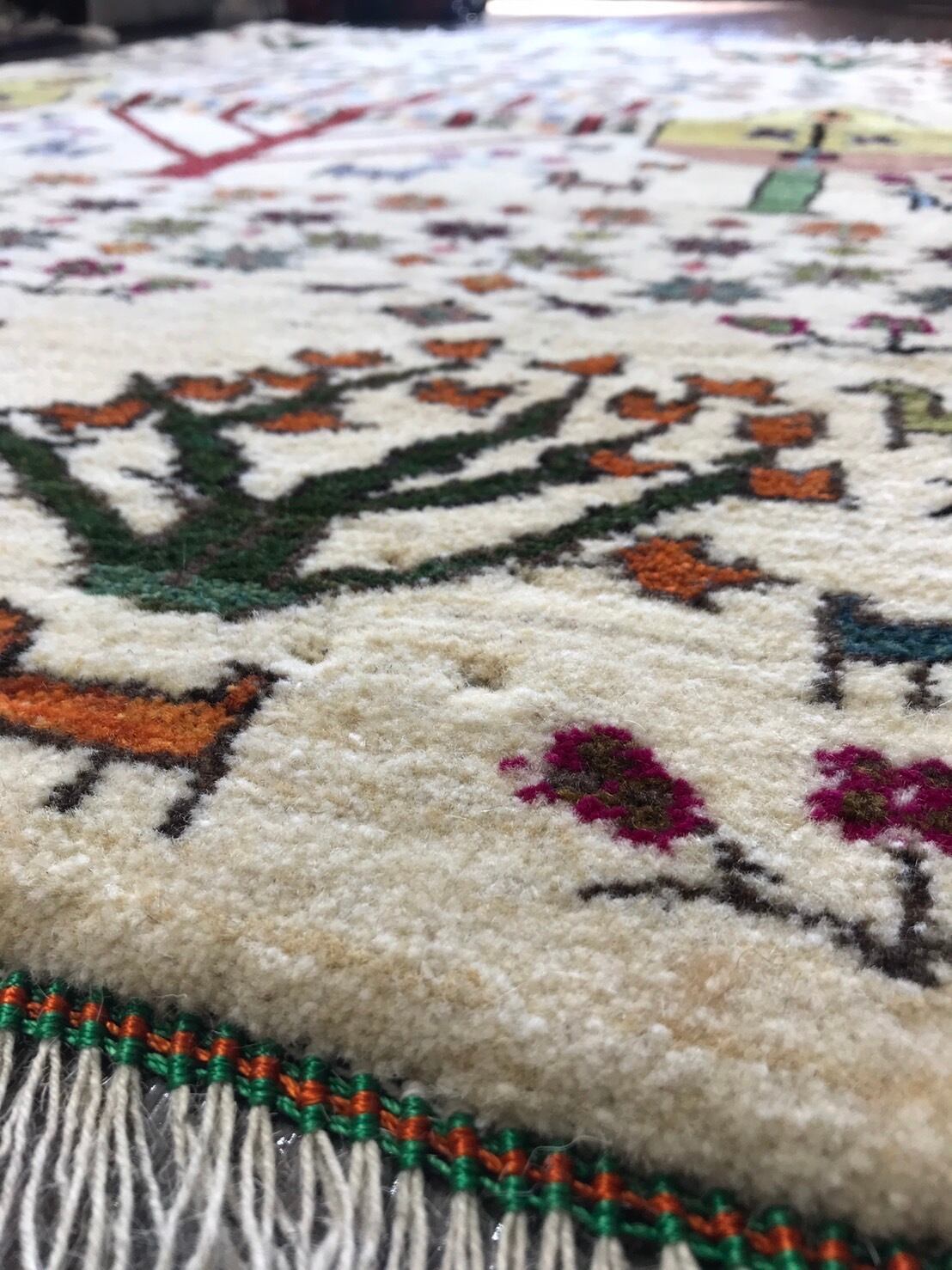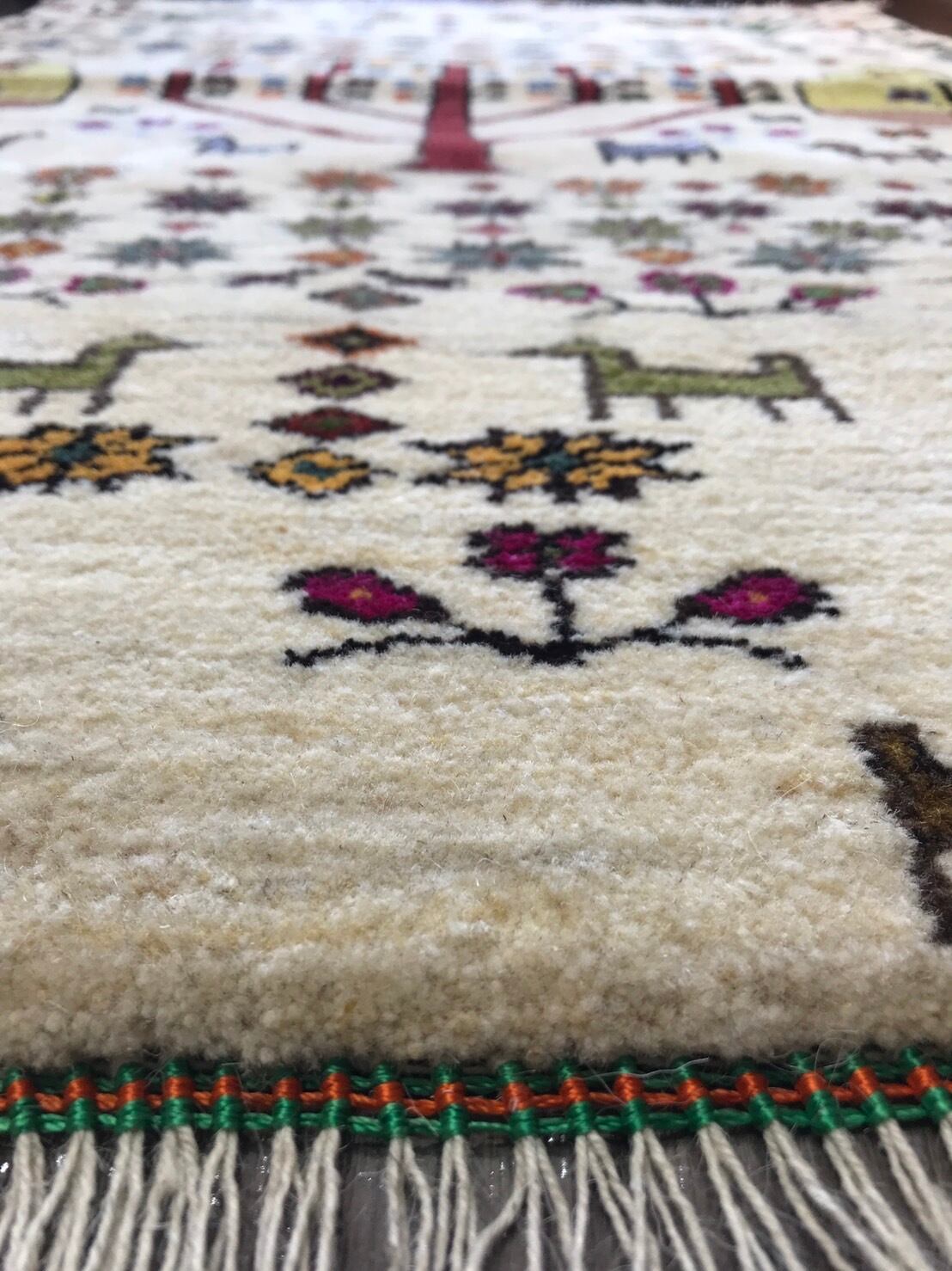 イランのギャッべの特徴は遊牧民の暮らしている地域は夏冬の温度差が大きい事に加え乾燥地帯であるため昼夜の温度差も大きい環境で育った羊の毛を刈り紡いで使っているので良質なウールで出来ていて手触りが良いです。