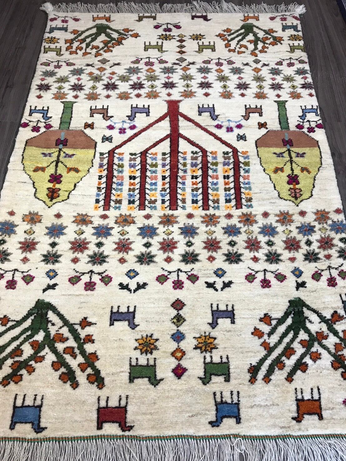 ナチュラル(無染色の羊さんの毛の色)なフィールドに様々なタイプの生命の木や沢山の花、可愛らしい山羊の楽しく可愛い図柄の手織りペルシャリズギャッベです。