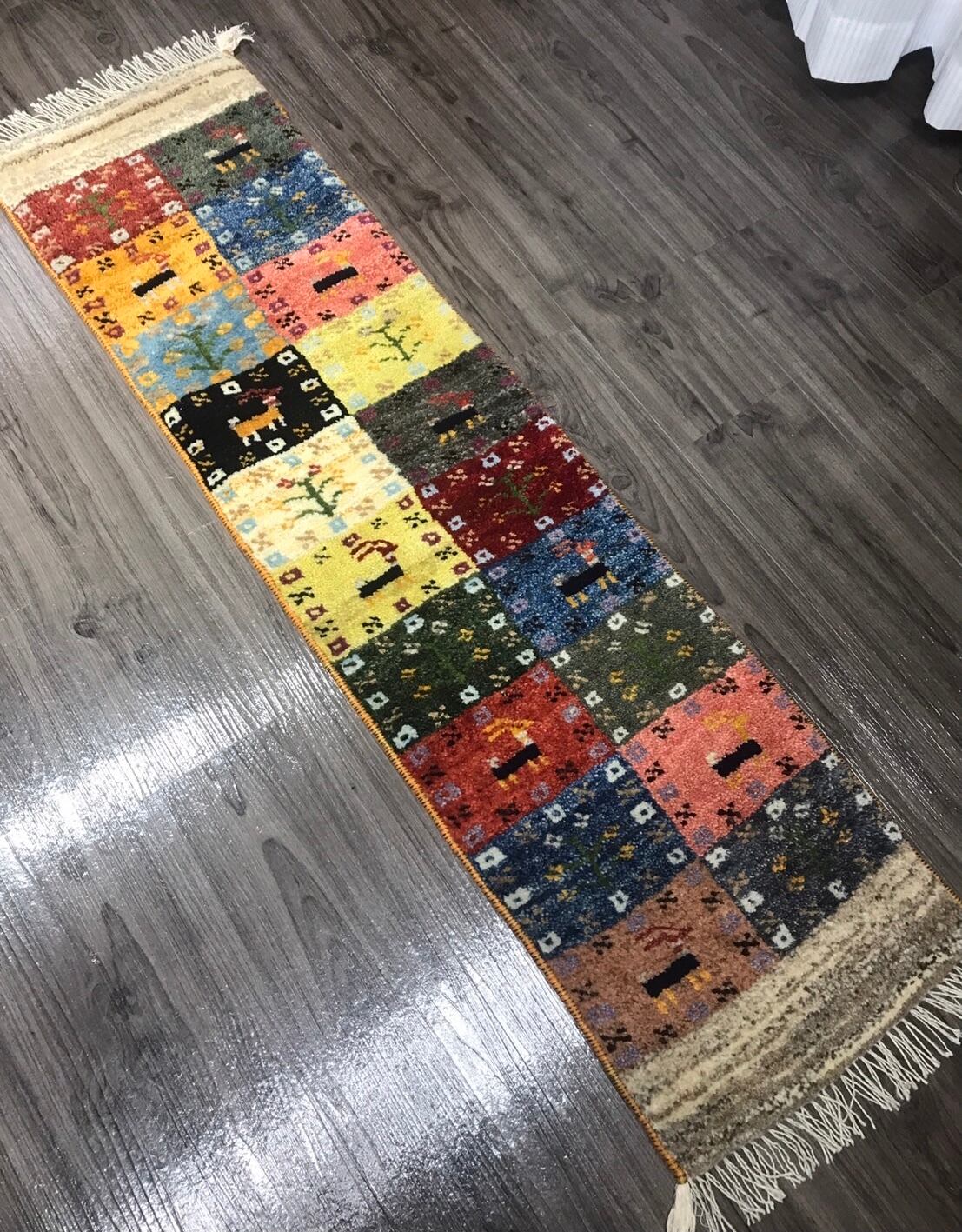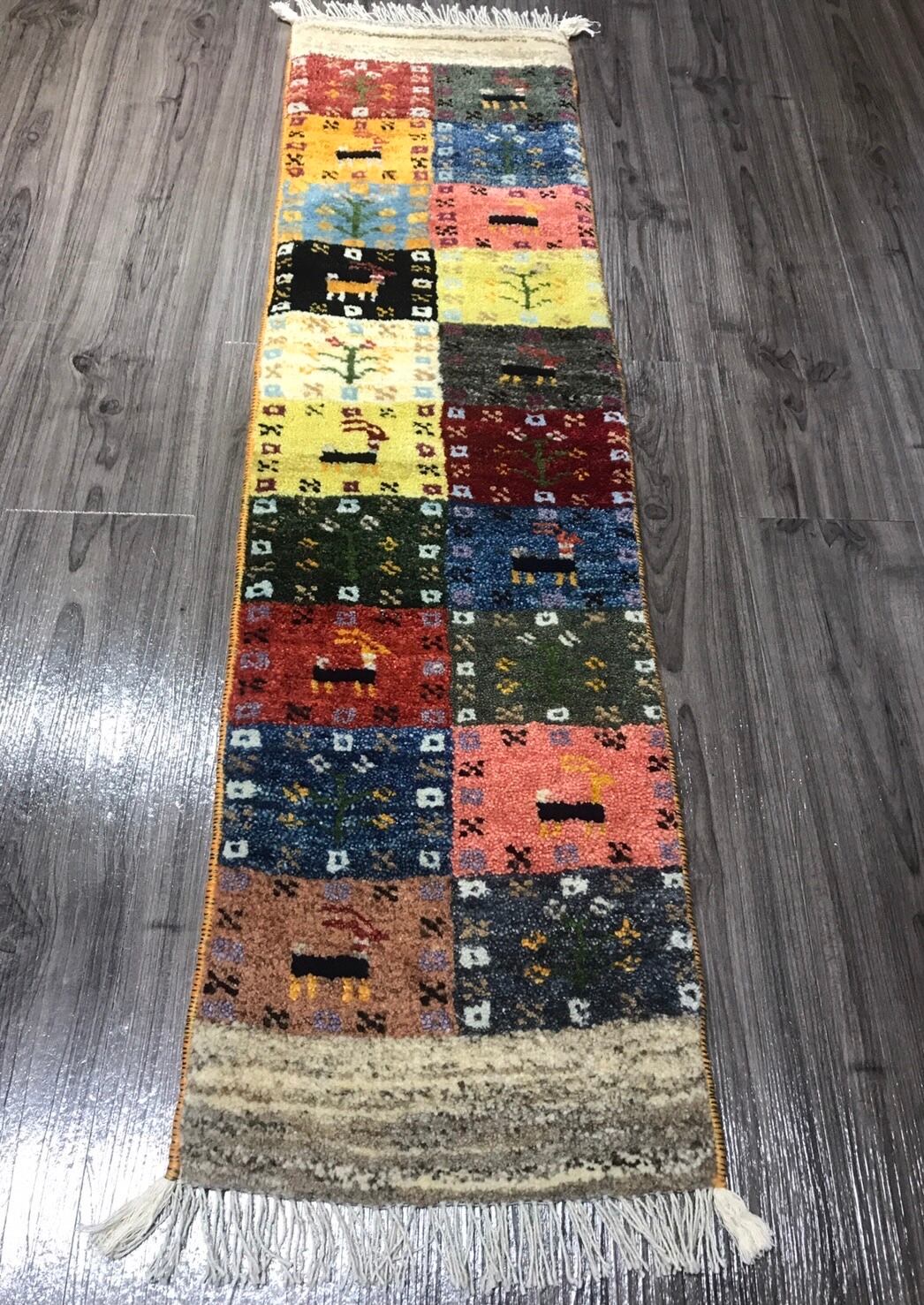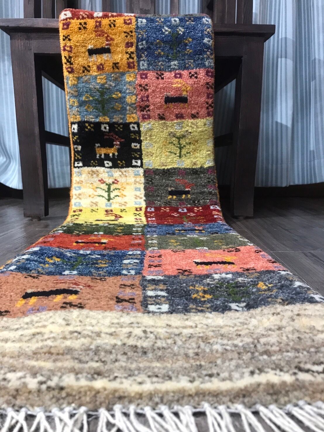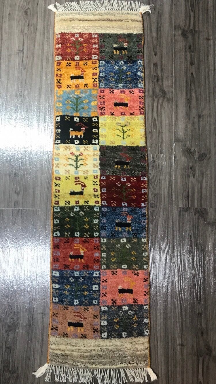 カラフルなパネルの中、それぞれに山羊や生命の木など可愛らしいモチーフが入っていて見ているだけでも楽しいランナータイプの手織りペルシャギャッベです。