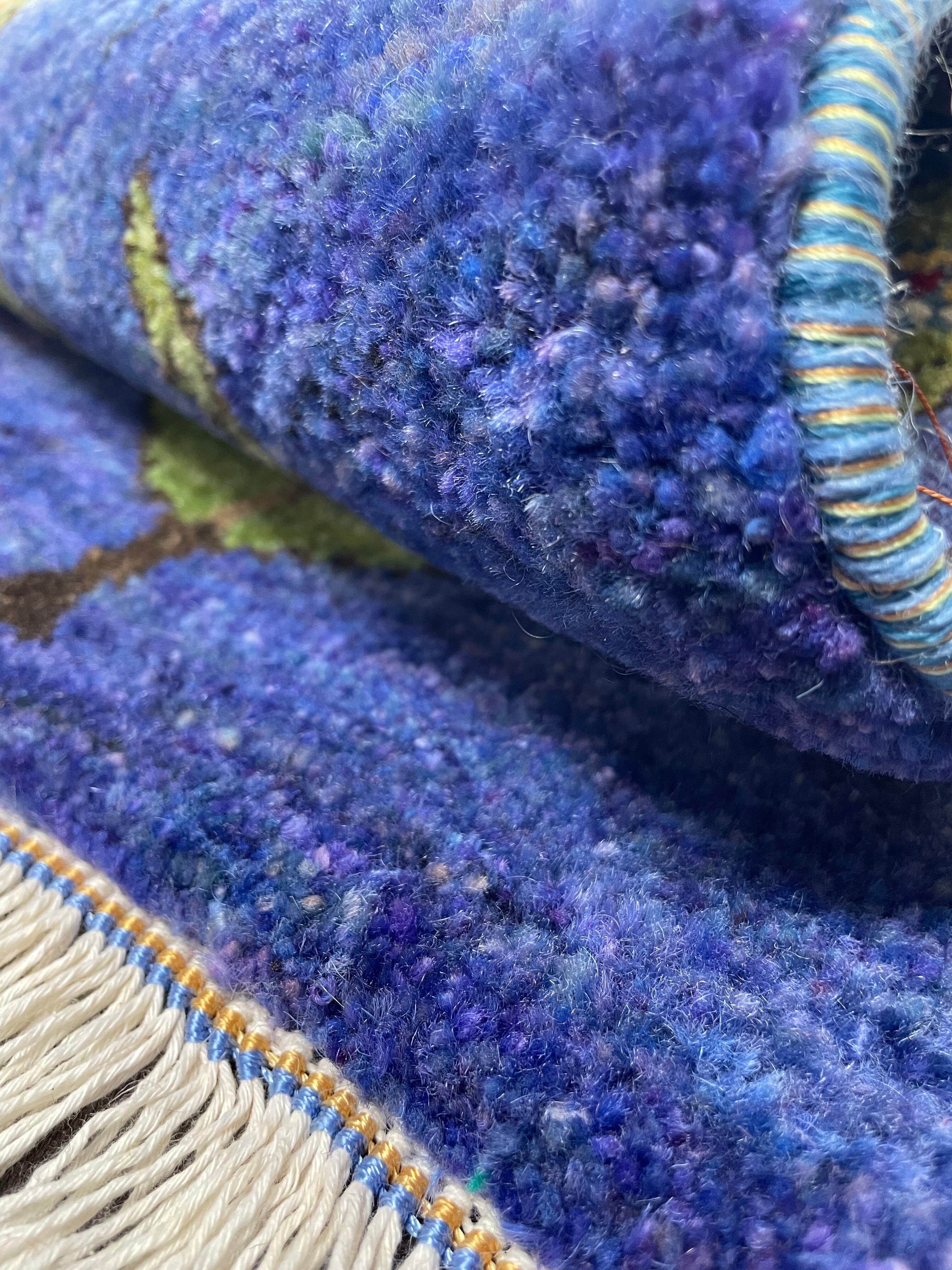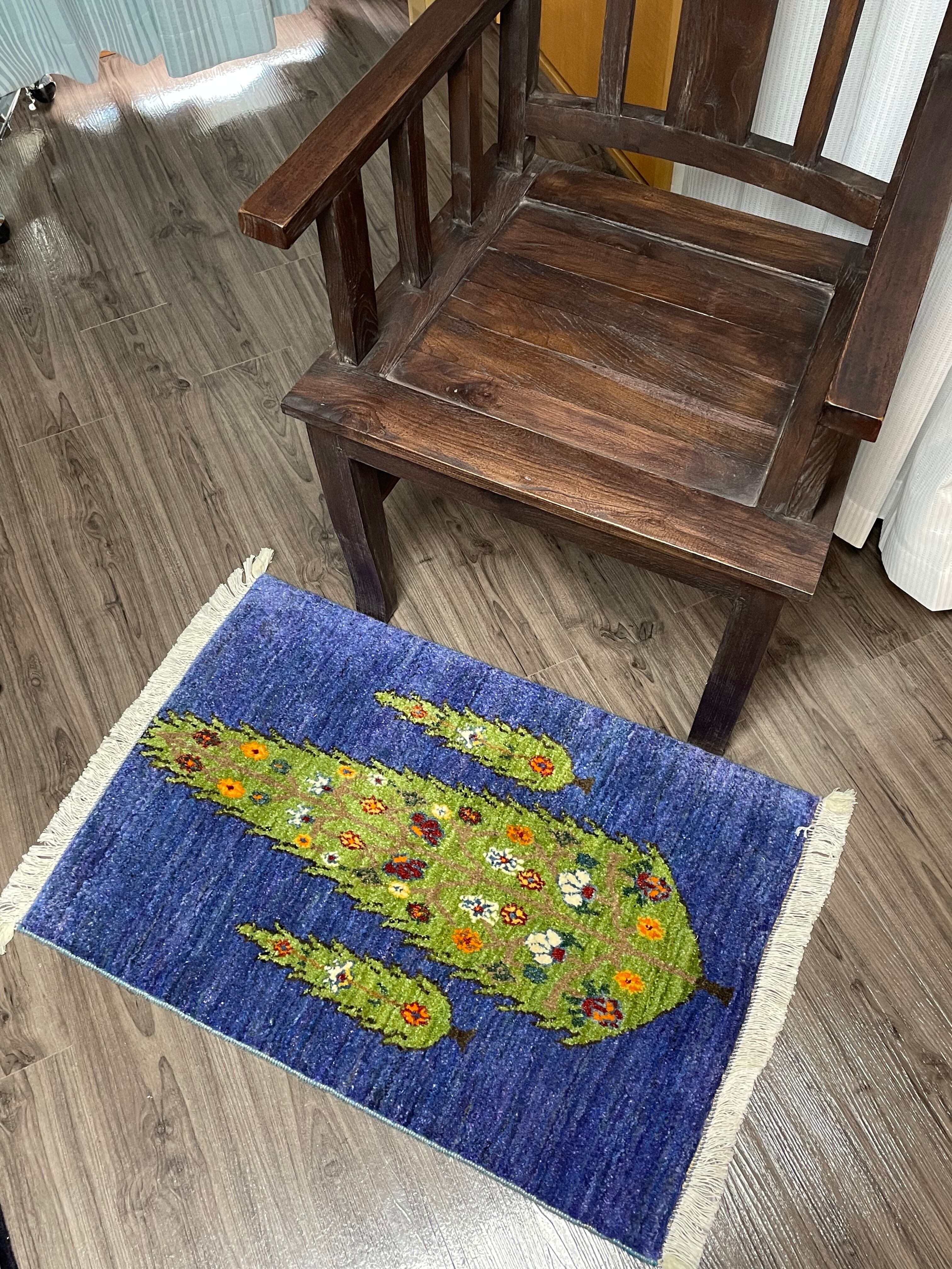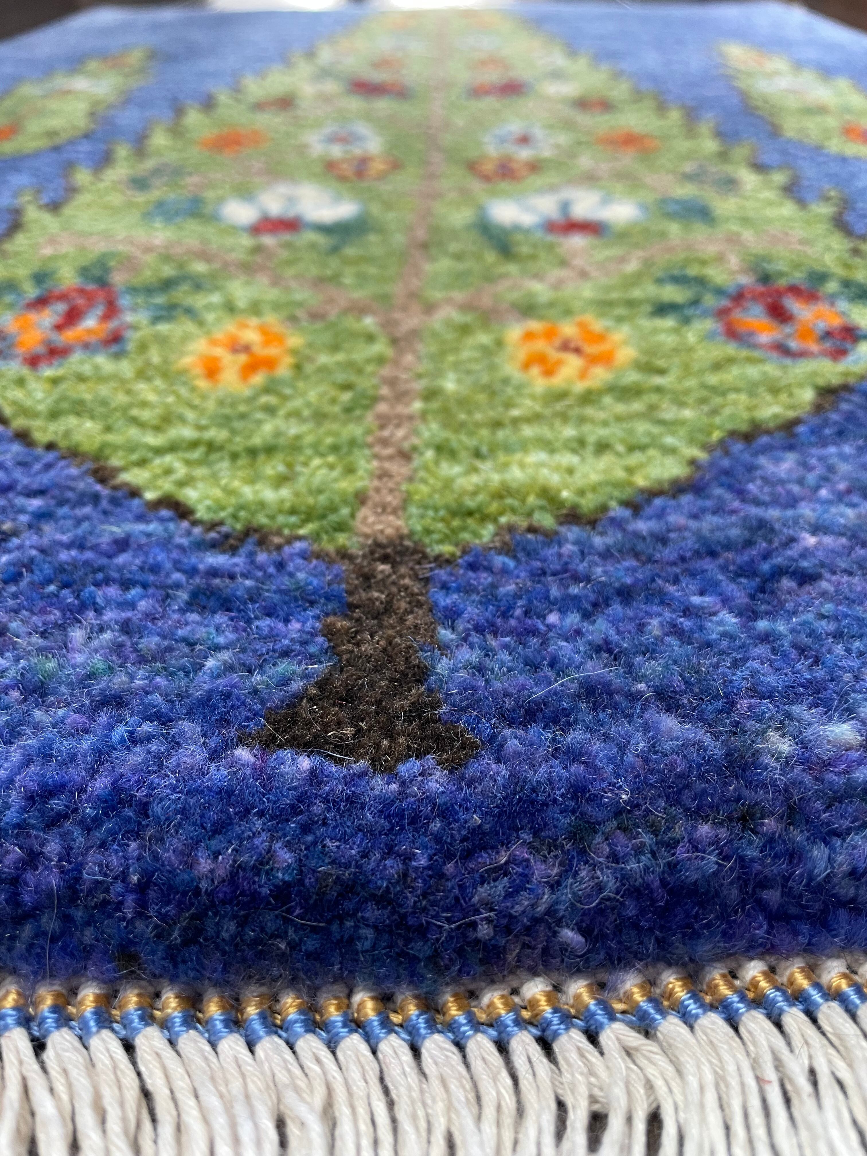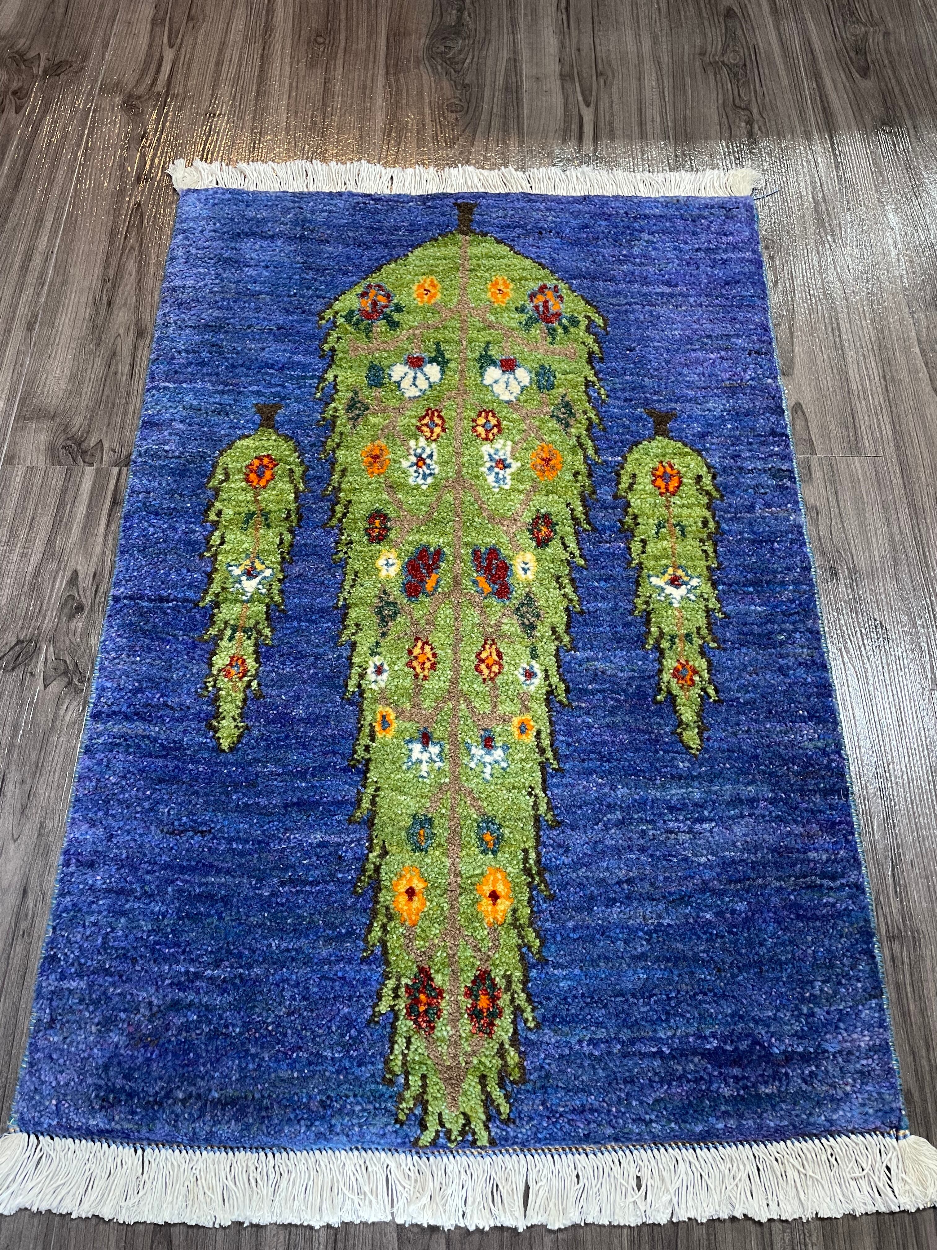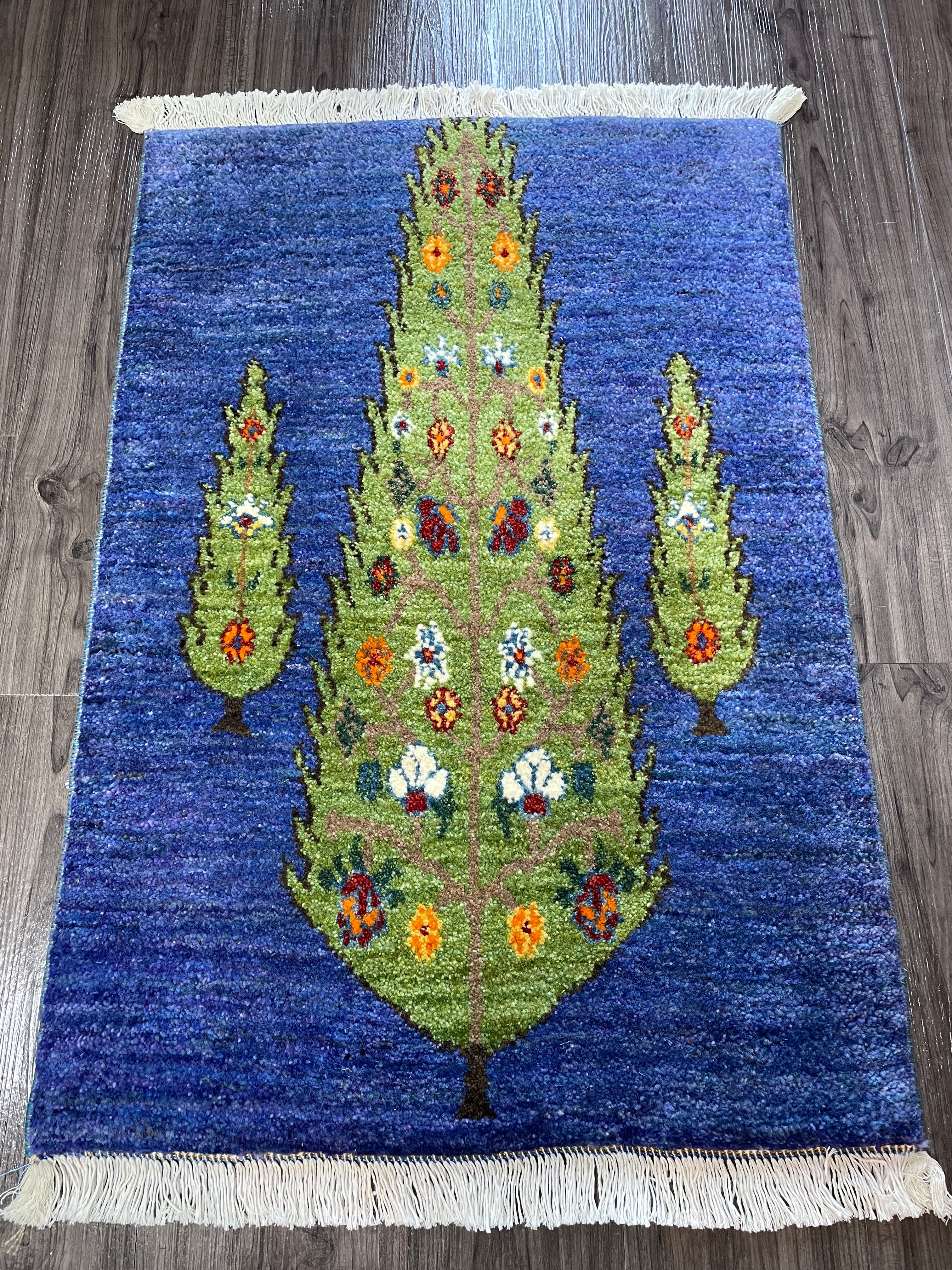 ブルー系や紫色などの濃淡の組み合わせがとてもきれいな色味のフィールドにカラフルな花々を付けた生命の木の姿がとても素敵な手織りのペルシャリズギャッベです。