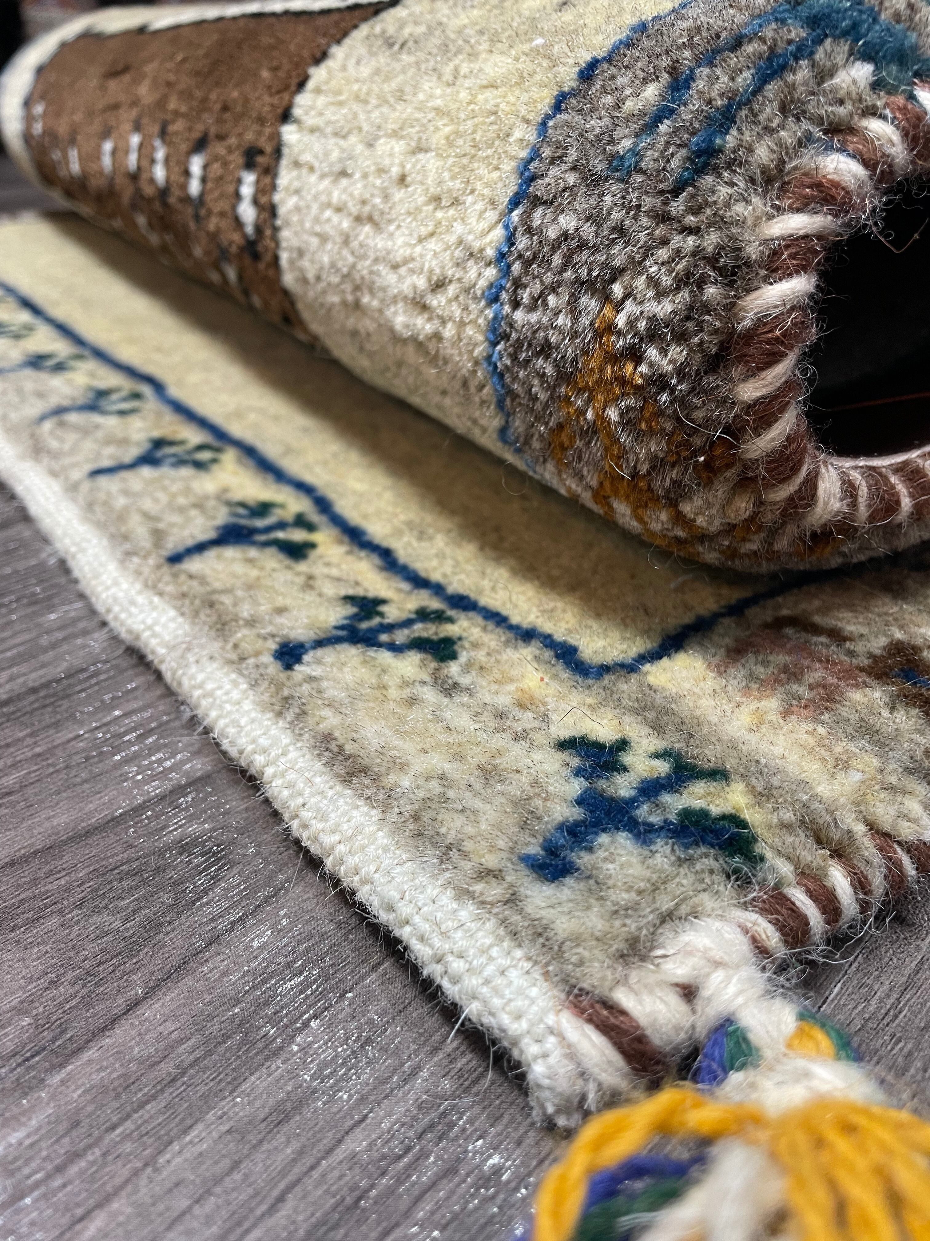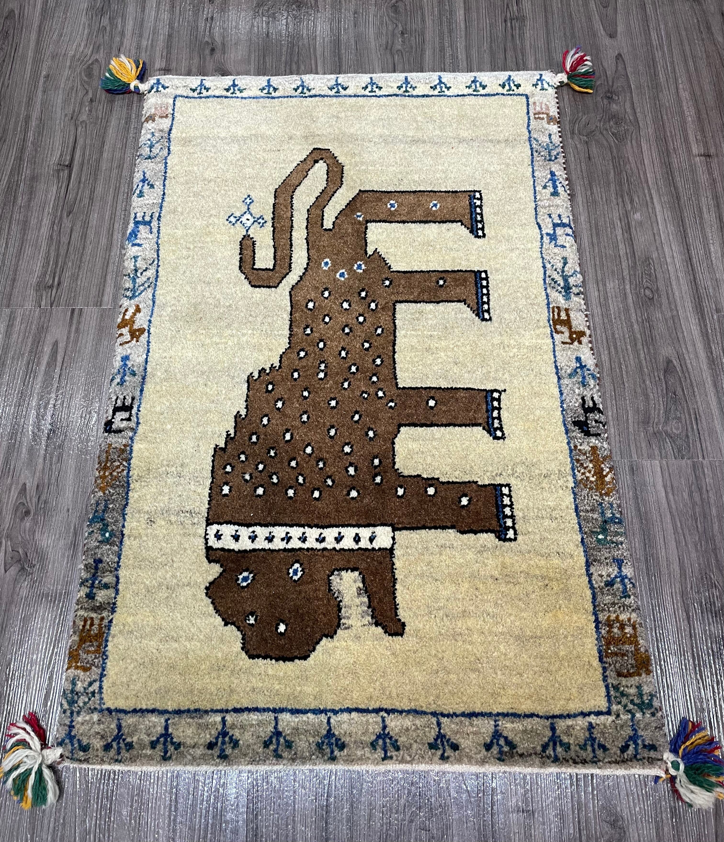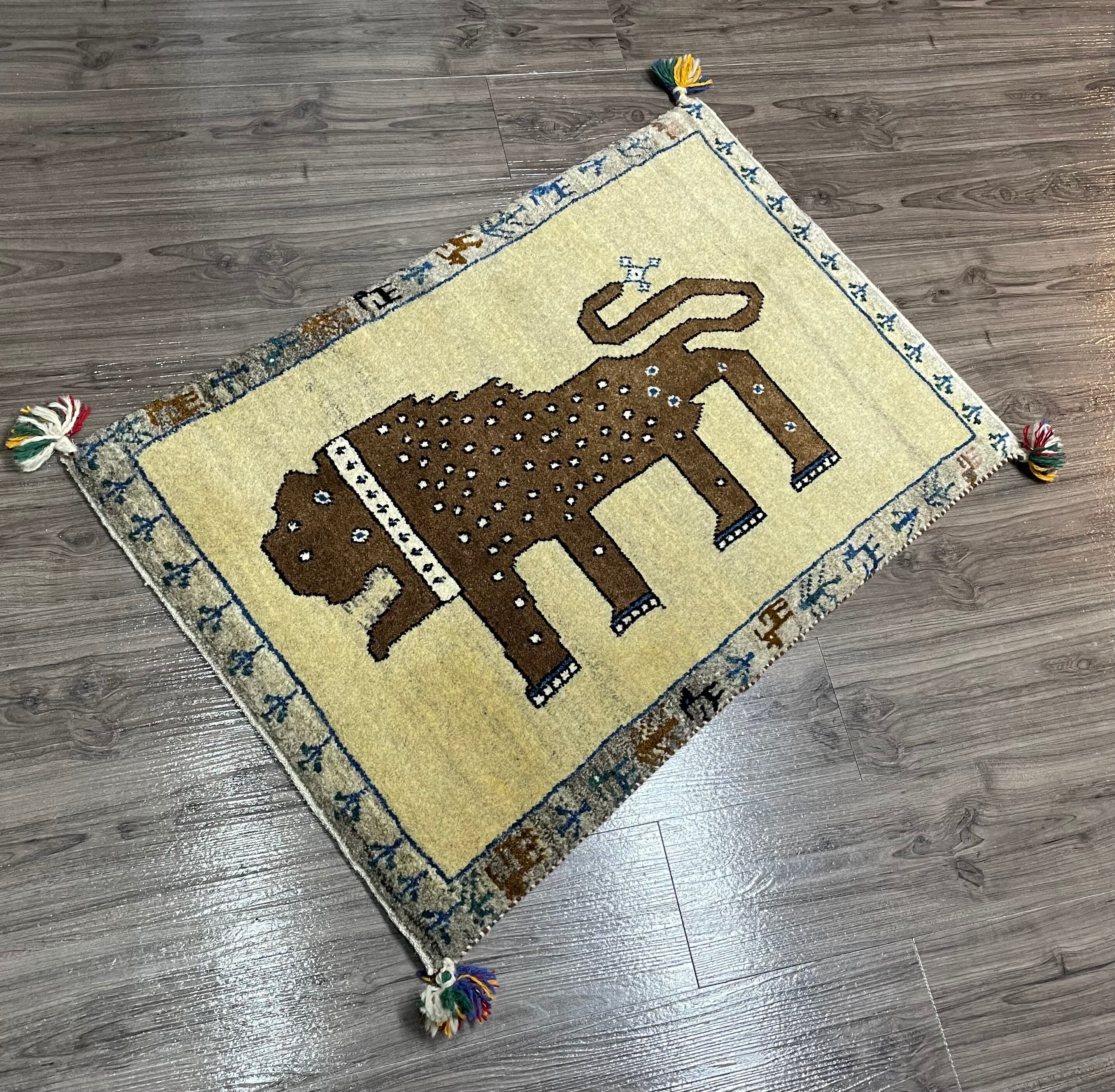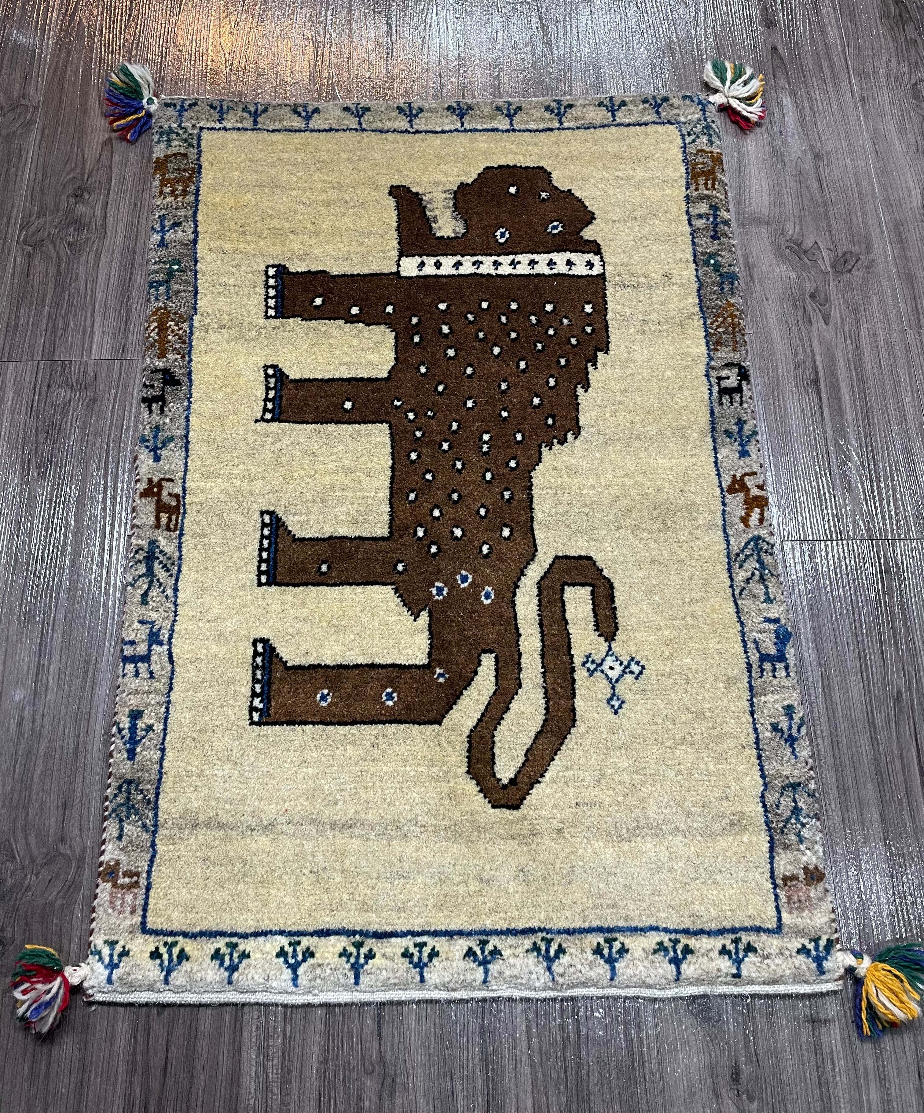 新品 ペルシャ絨毯 手織り リズ ギャッベ 90cm×60cm ナチュラル ライオン 山羊 生命の木