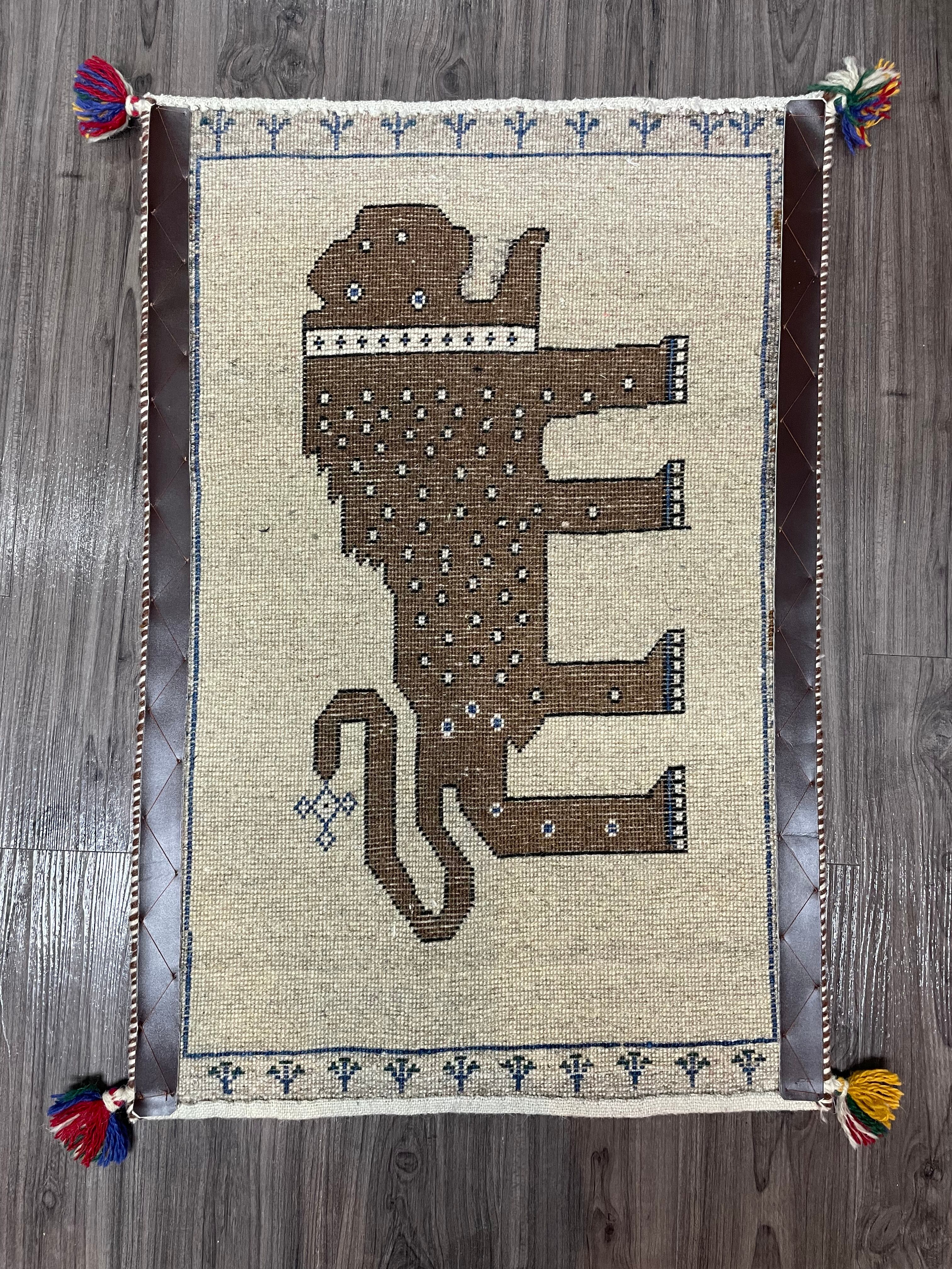 ナチュラルなフィールドにユニークな表情の堂々とした姿のライオンがかっこよくもあり可愛さもある素敵な手織りのペルシャリズギャッベです。
