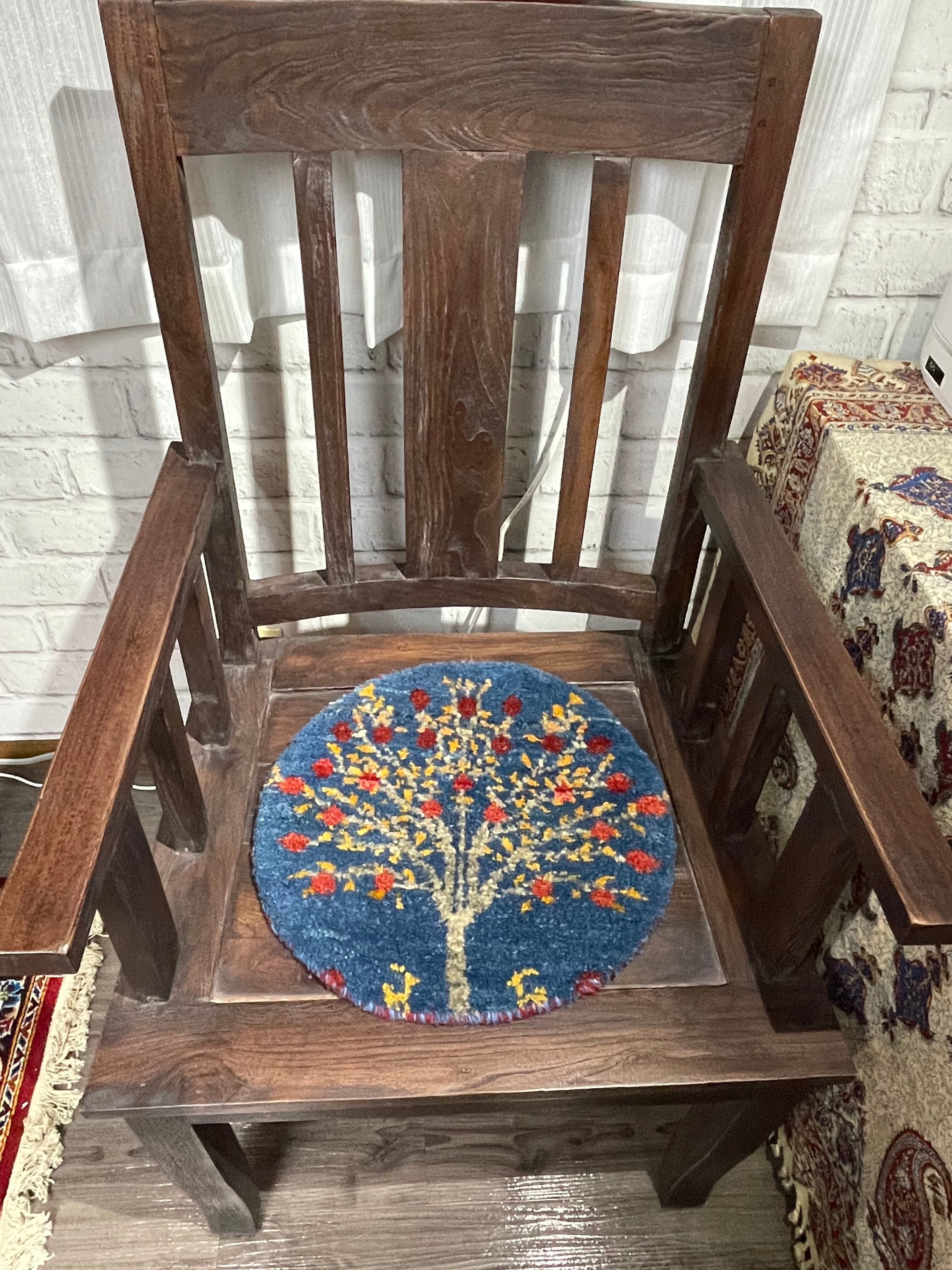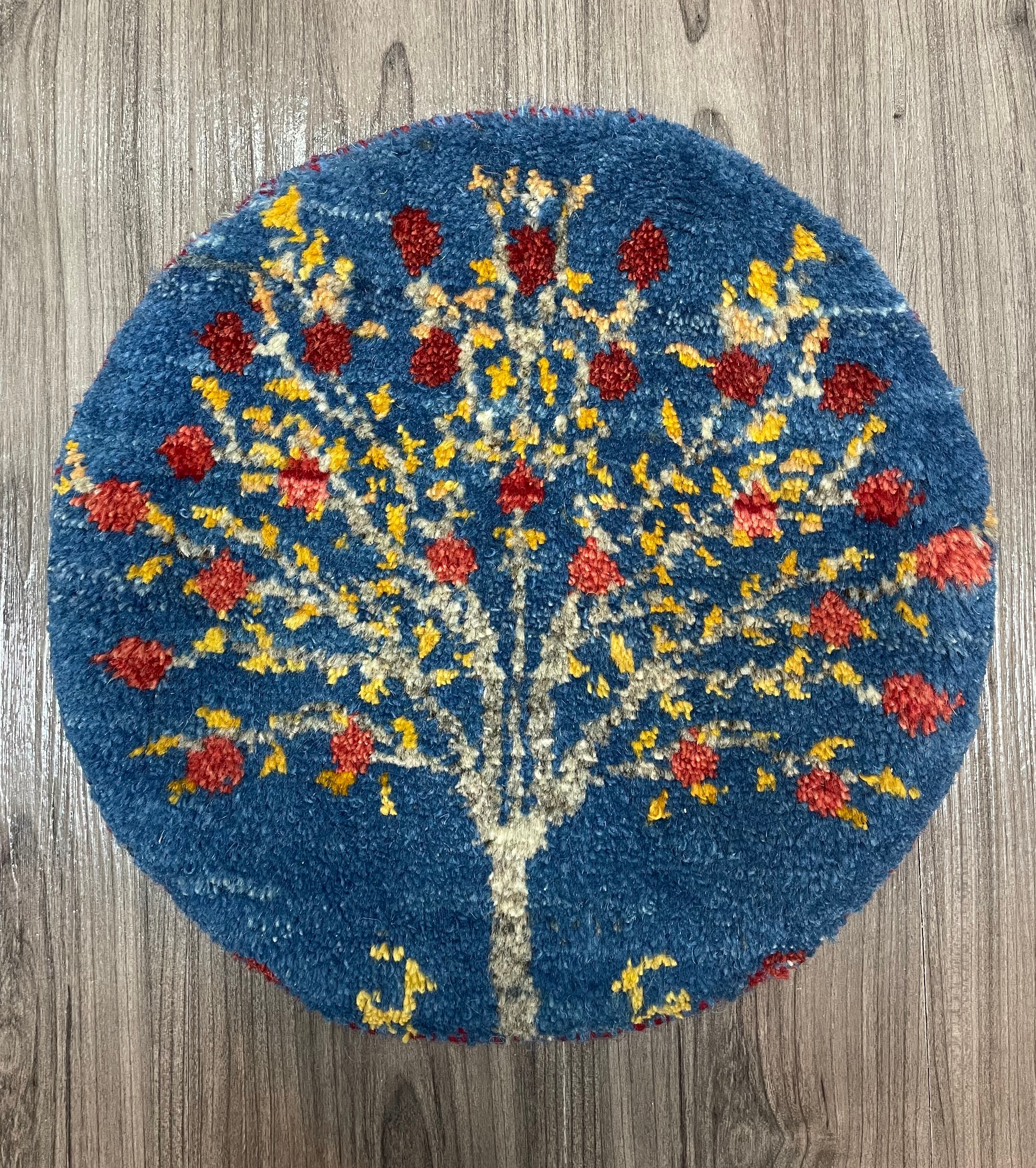 青色のフィールドに赤い実を沢山つけたザクロの木の堂々した姿とザクロの木を挟んでちょこんとくつろぐ山羊たちが可愛らしい円形の座布団サイズの手織りペルシャギャッベです。