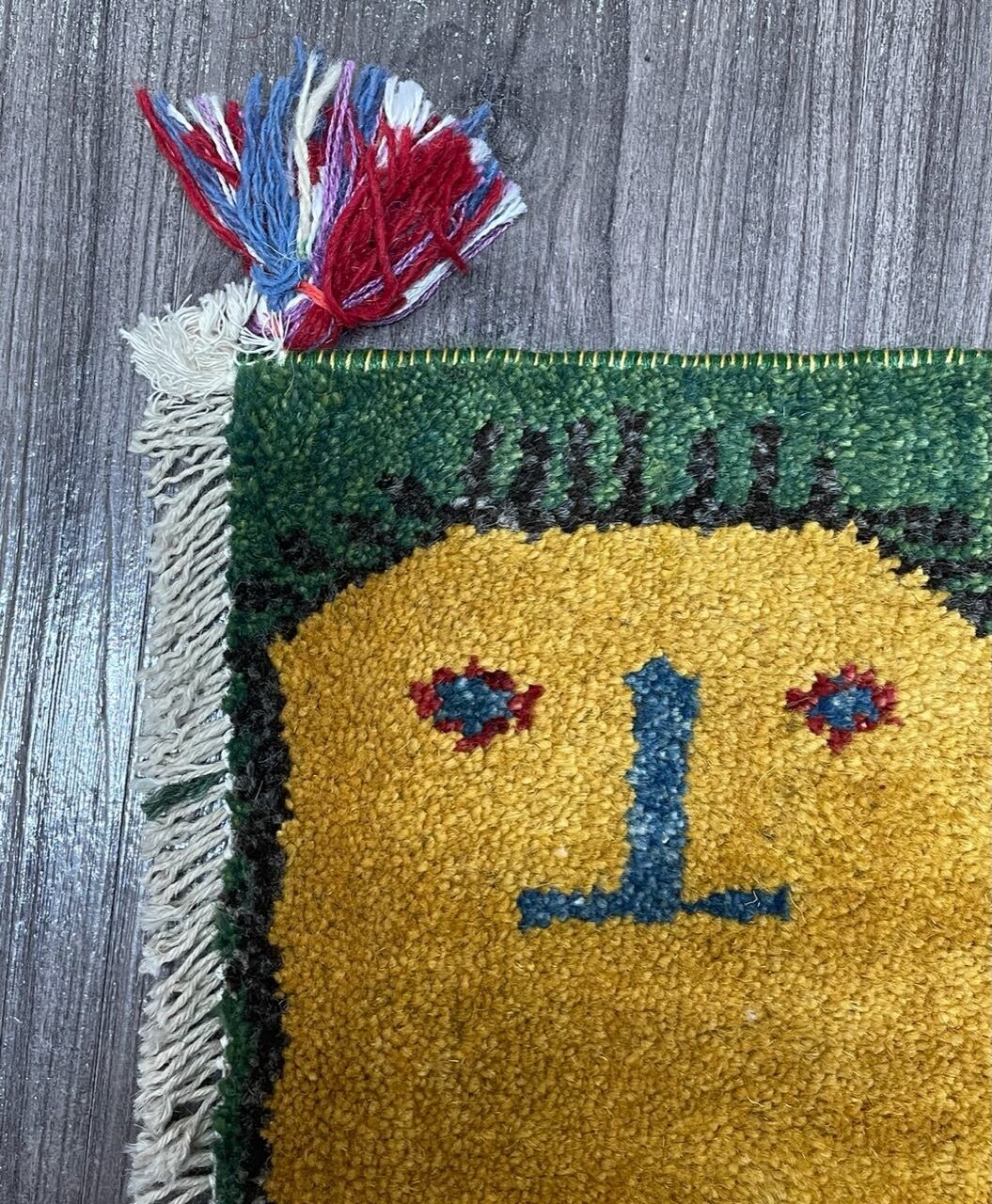 緑色のフィールドに見ているとホッコリ笑顔になるようなユニークで可愛らしいライオンさんモチーフの座布団サイズの手織りペルシャギャッベです。