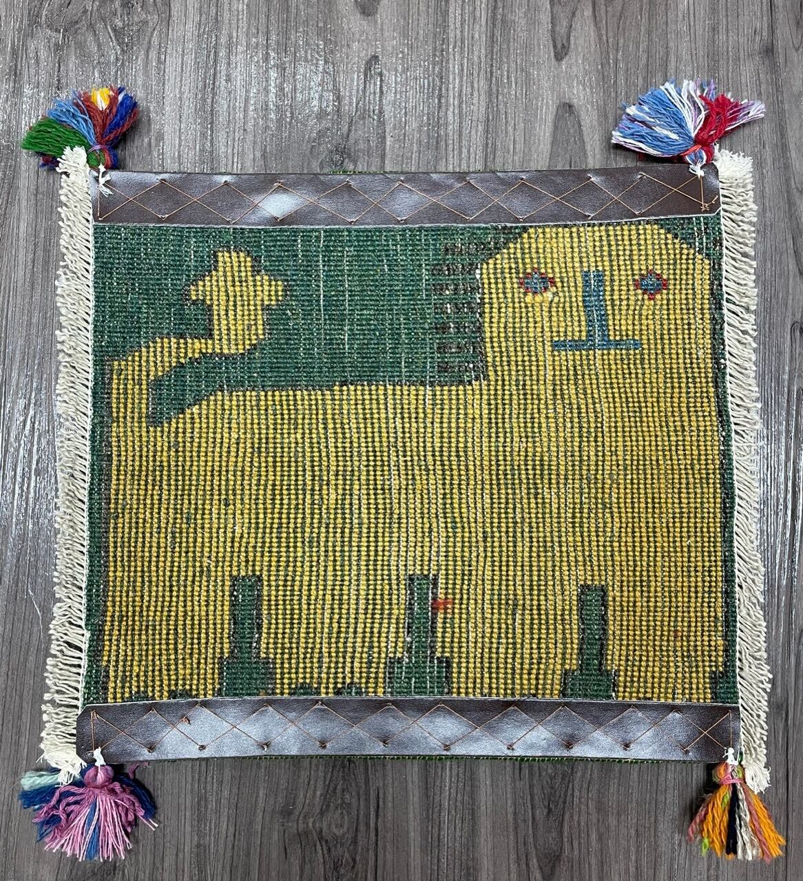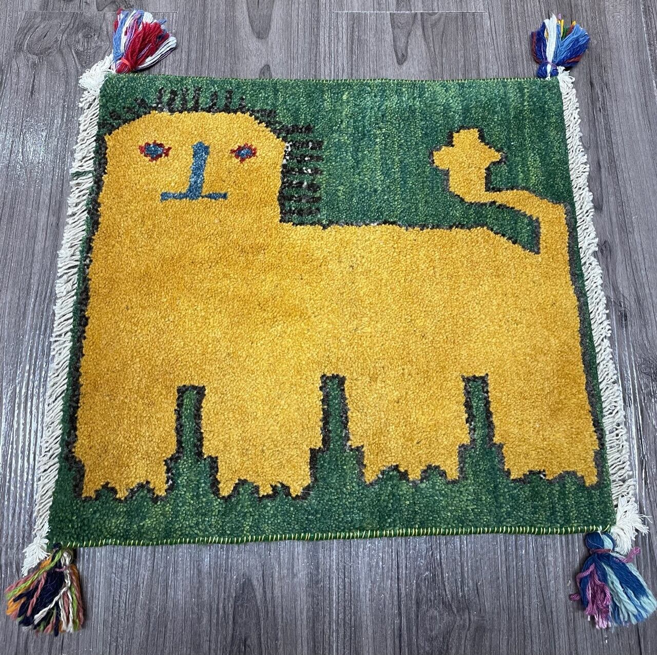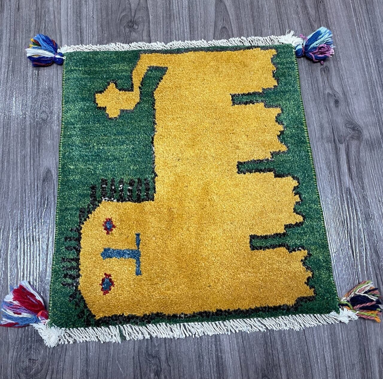 新品 ペルシャ絨毯 手織り ギャッベ 43×39cm 緑色 ライオン