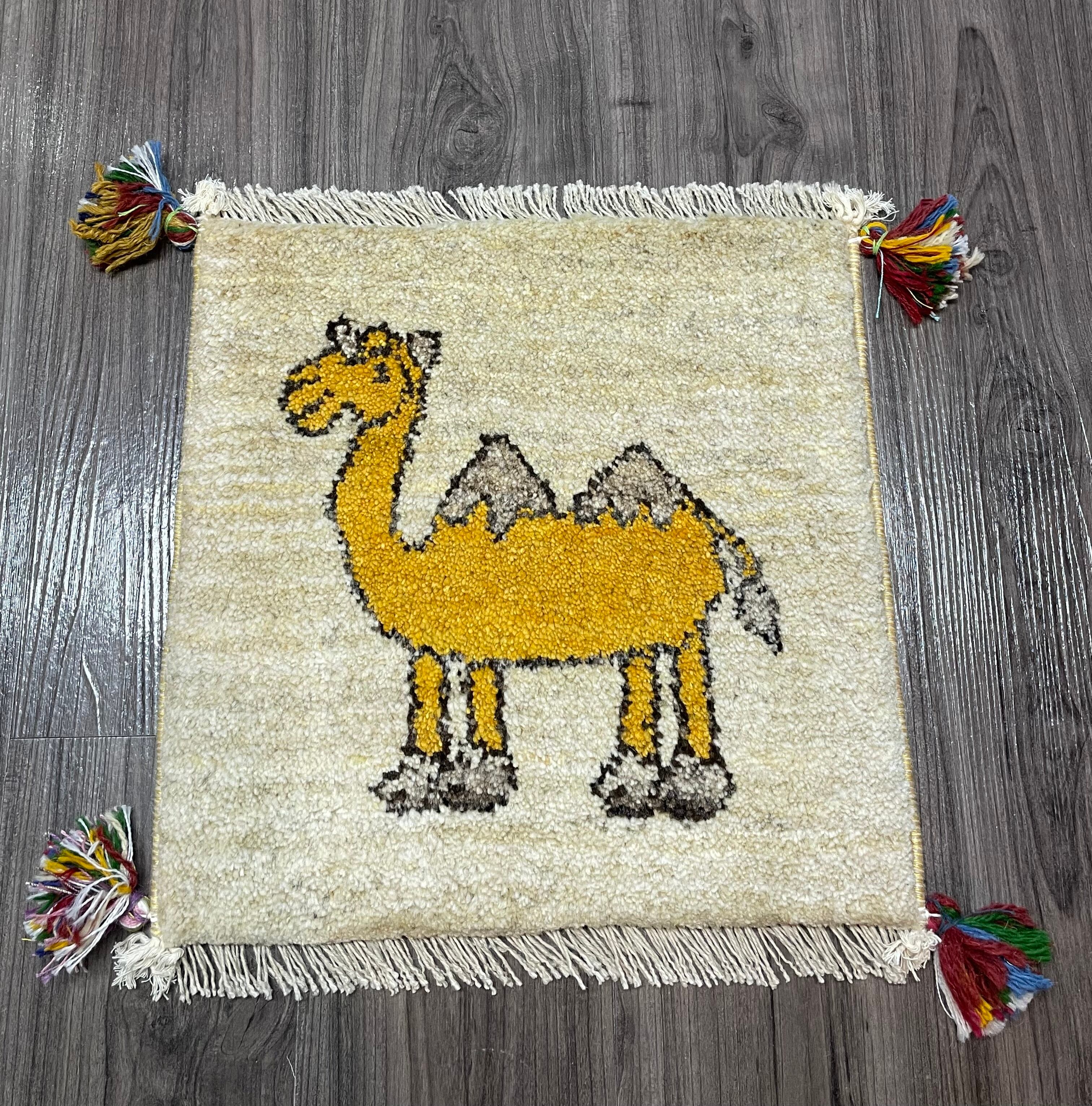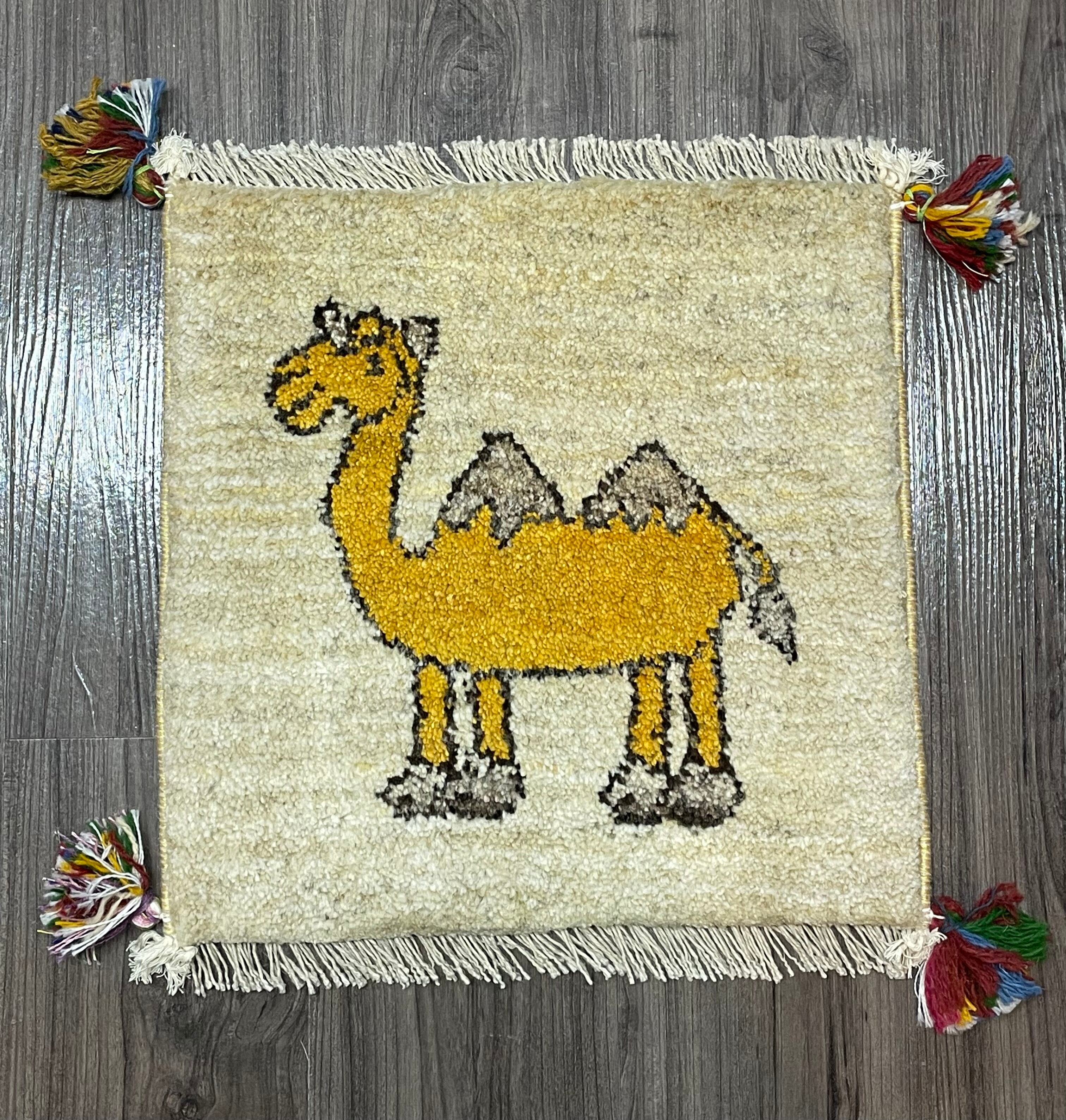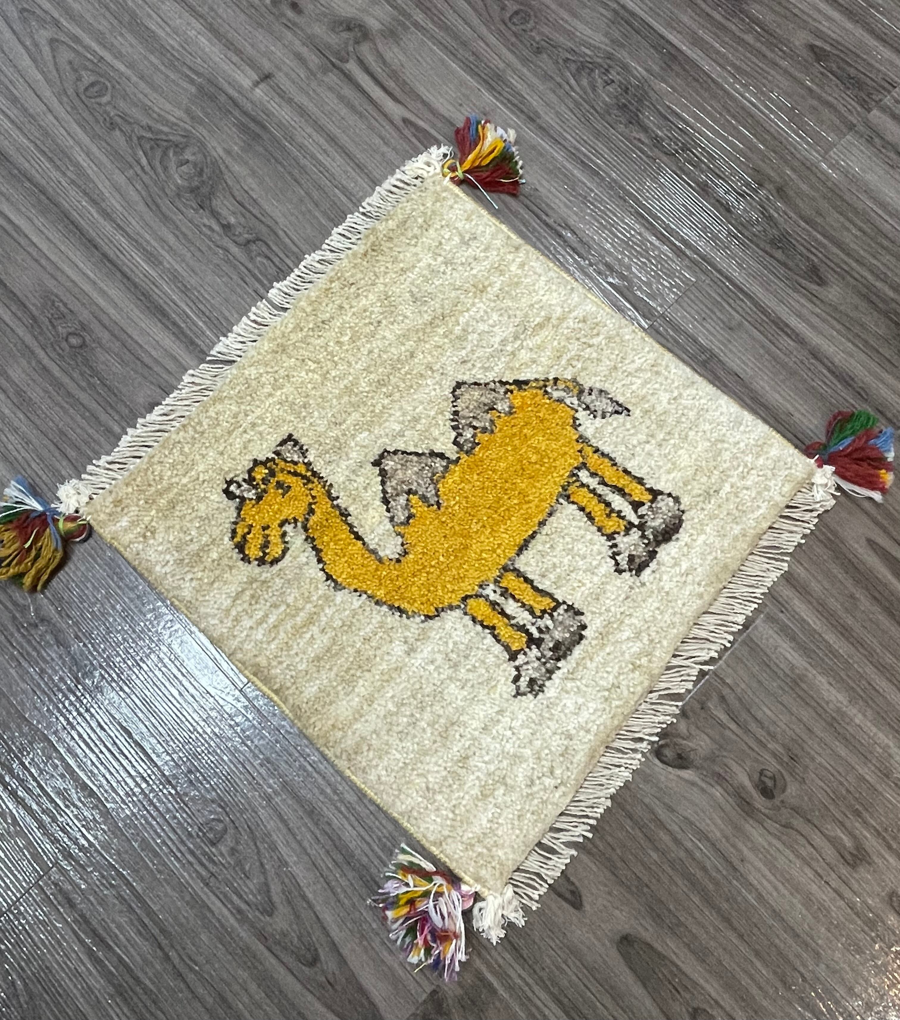 ナチュラルのフィールドに黄色の可愛らしいラクダさんモチーフが印象的な座布団サイズのペルシャギャッベです。