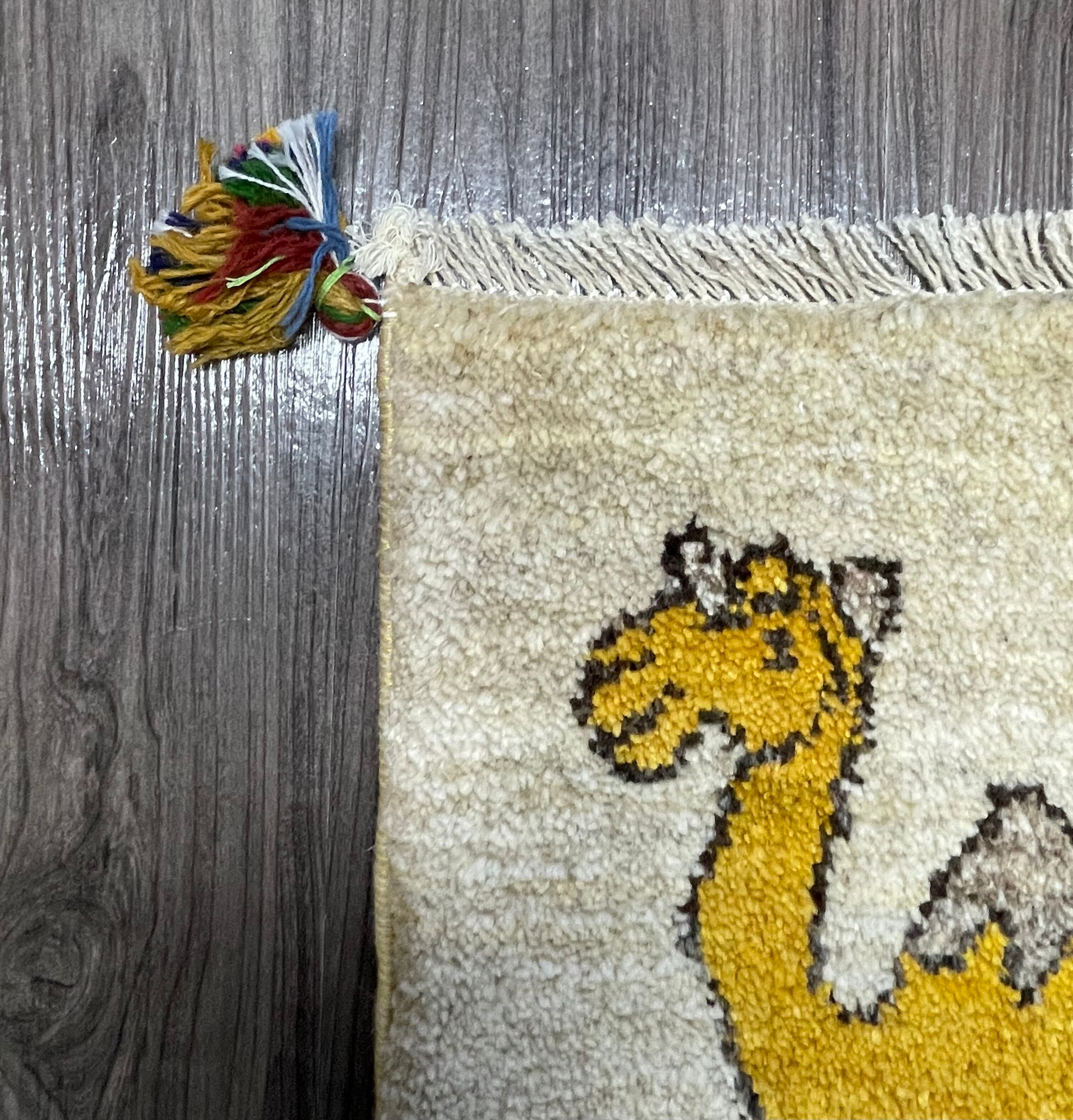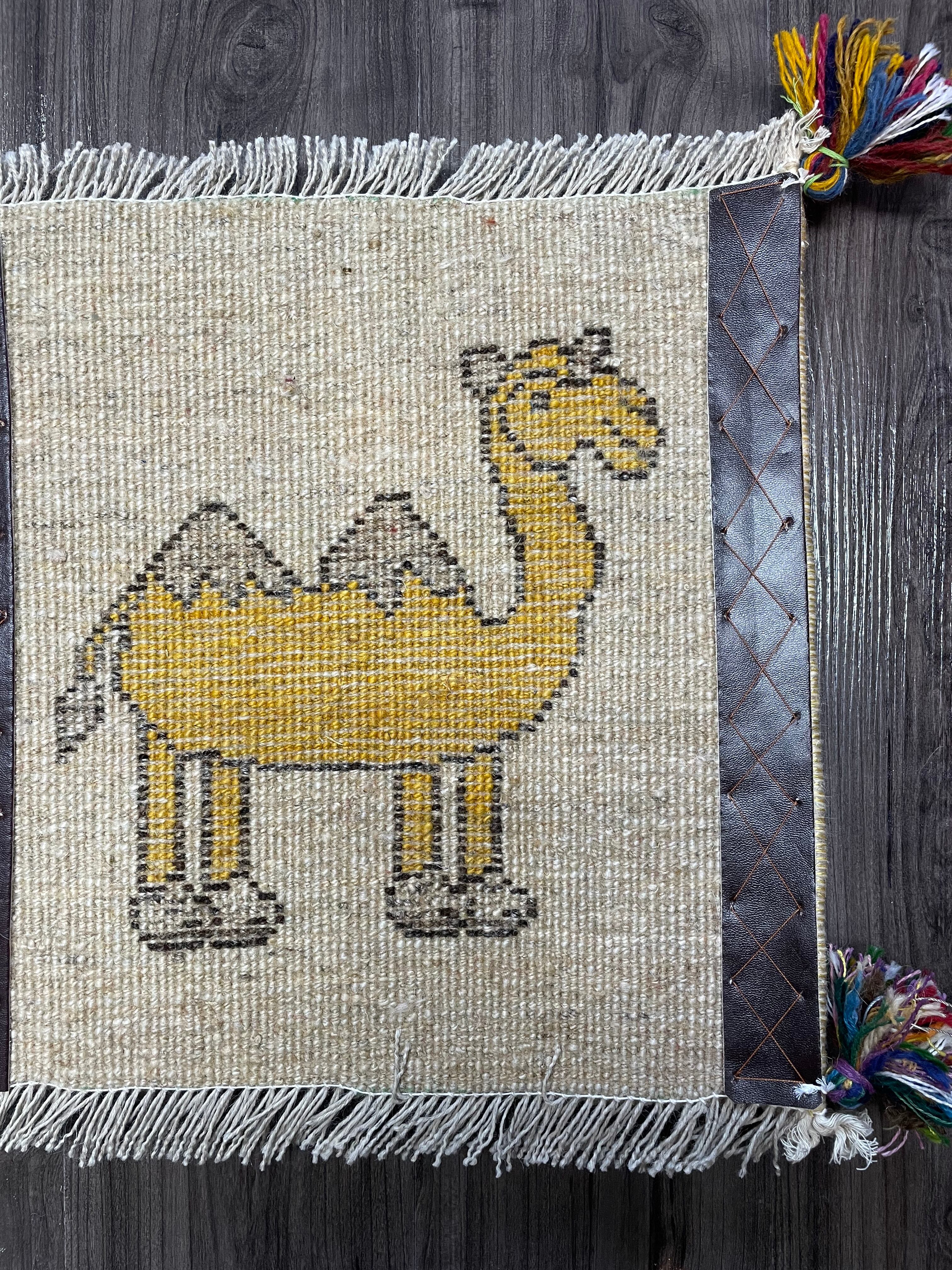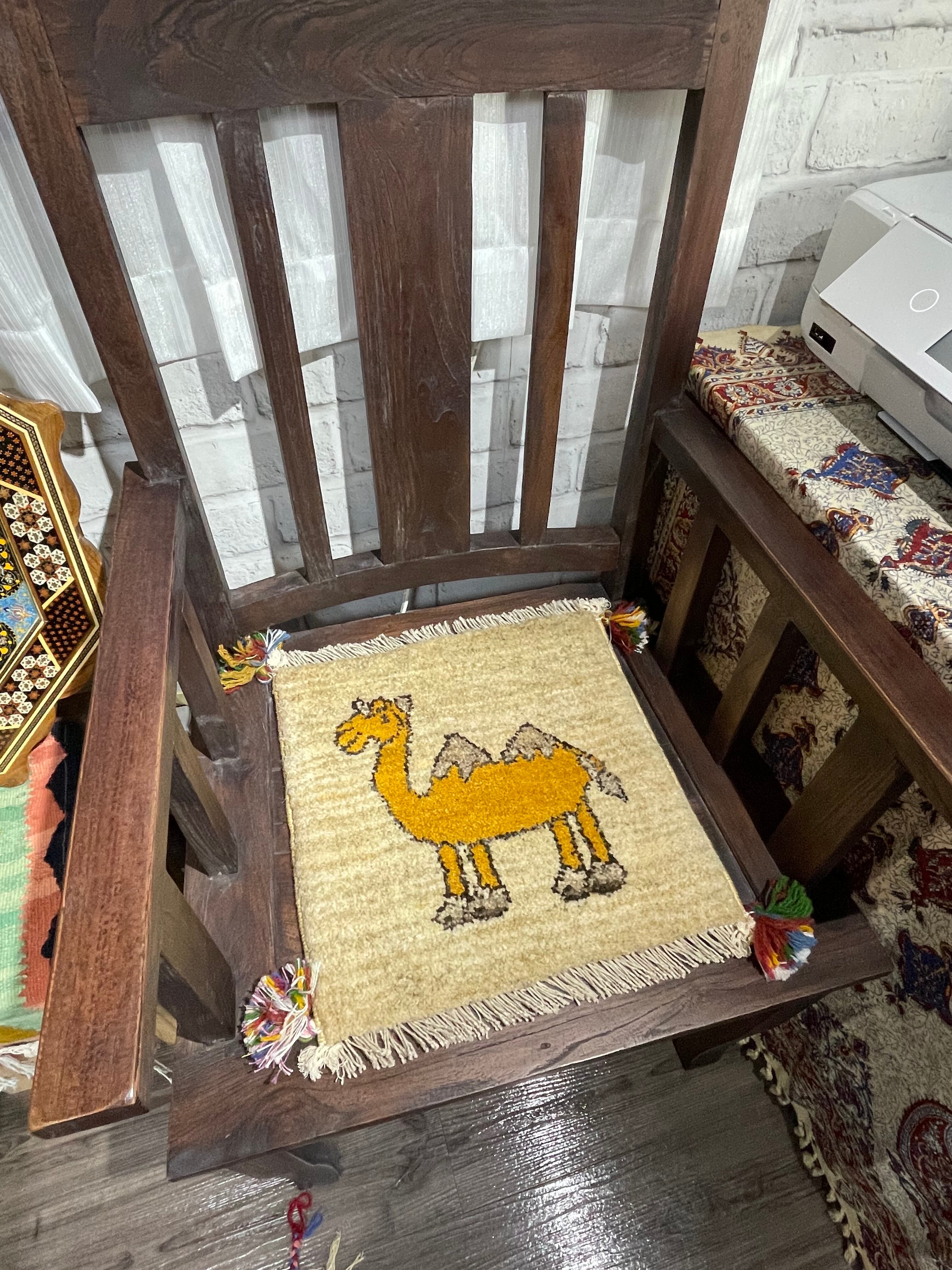 ナチュラルのフィールドに黄色の可愛らしいラクダさんモチーフが印象的な座布団サイズのペルシャギャッベです。