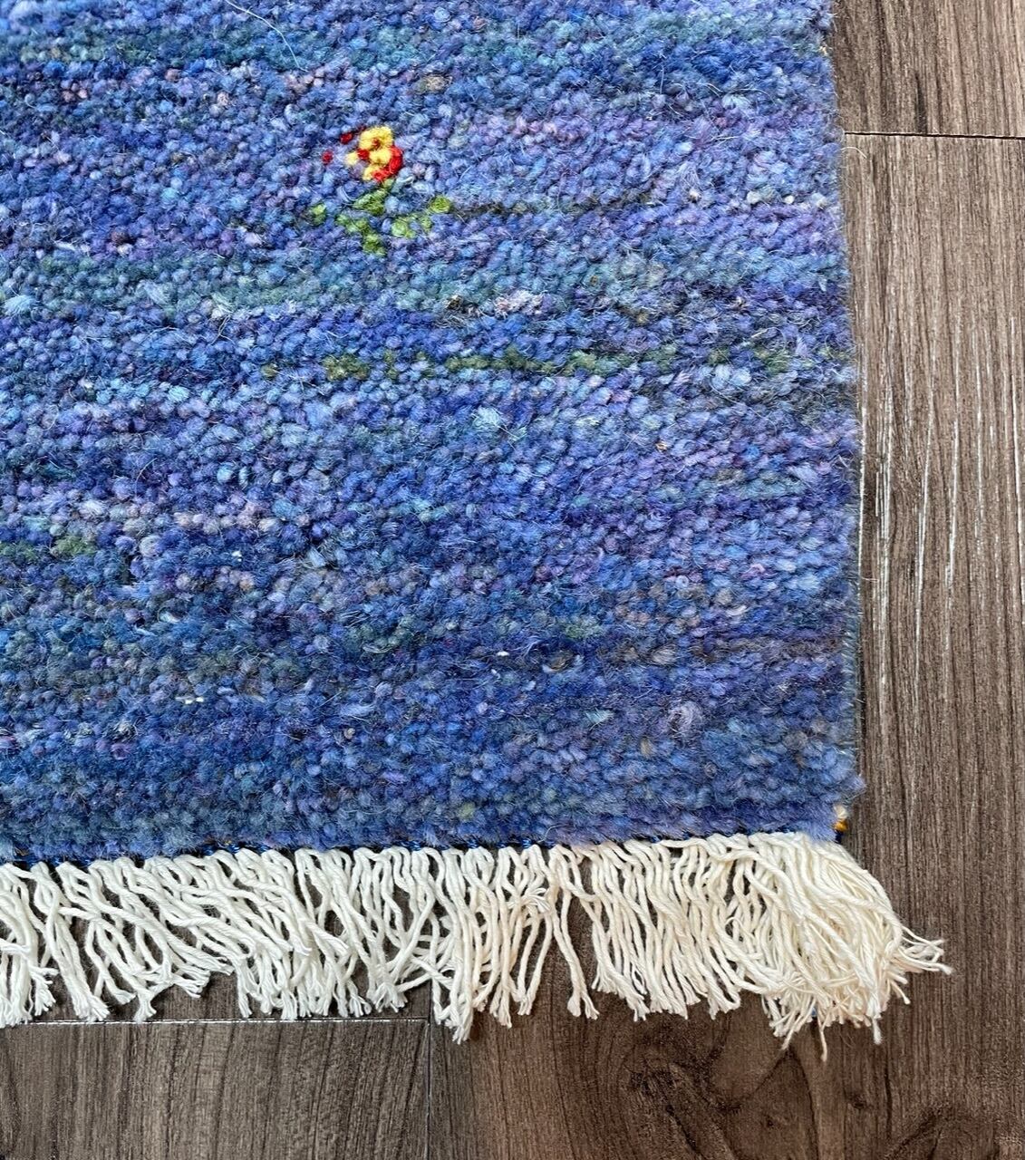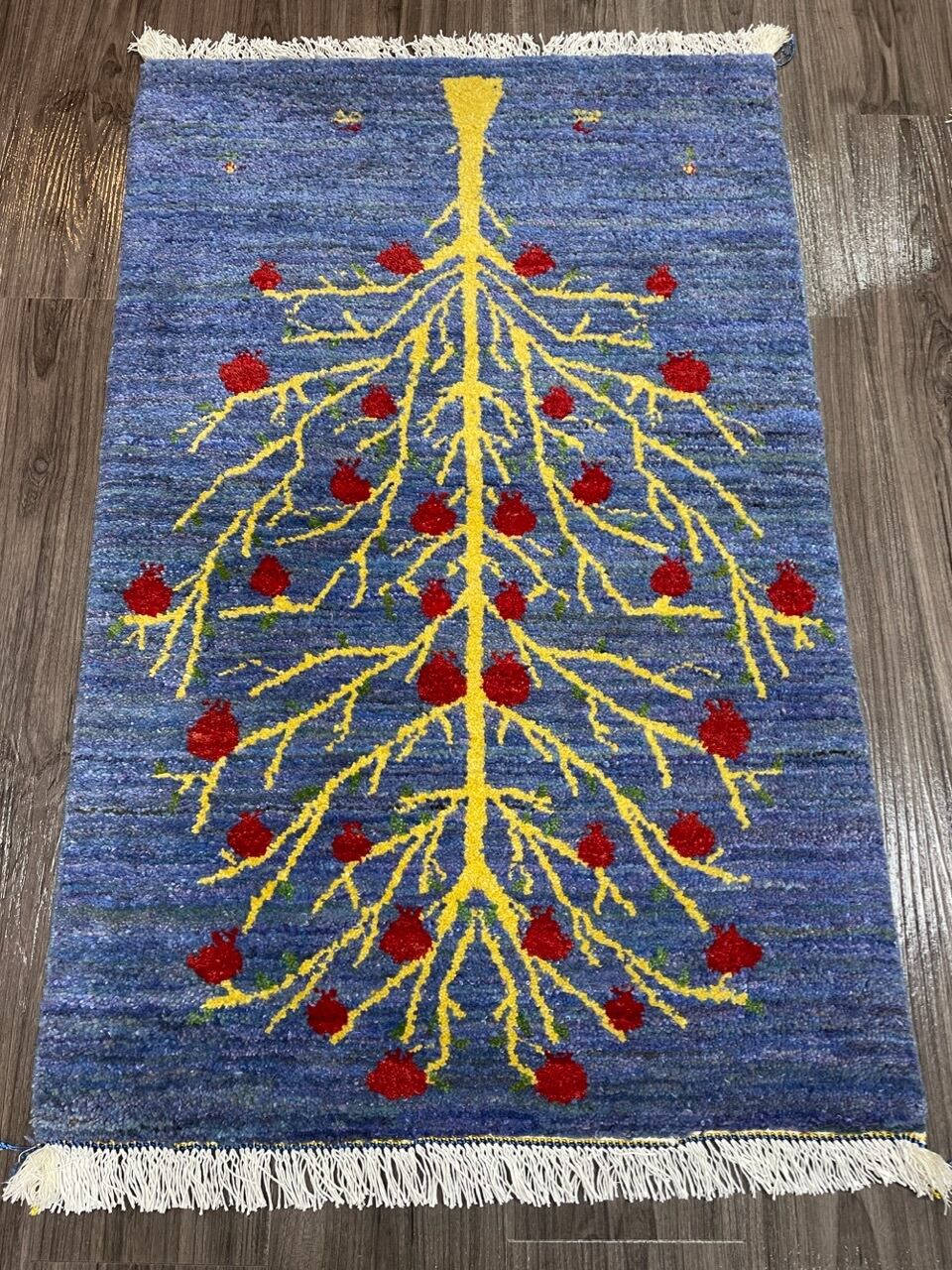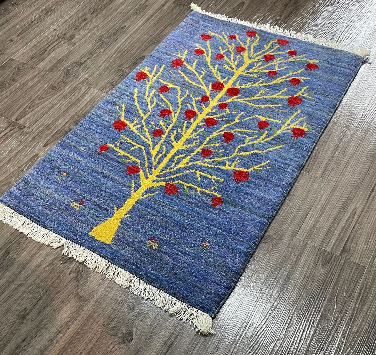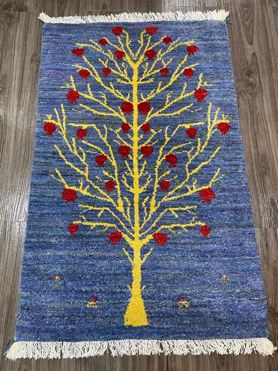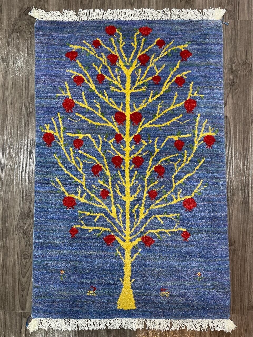 新品 ペルシャ絨毯 手織り リズギャッベ 90×60cm 青 ザクロの木