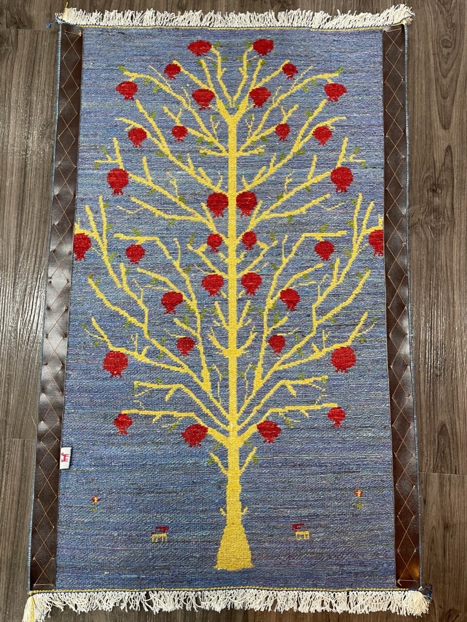 青や紫色の濃淡がとてもきれいなフィールドに赤い実を沢山付け、堂々とした姿のザクロの木がとても印象的な手織りのペルシャリズギャッベです。