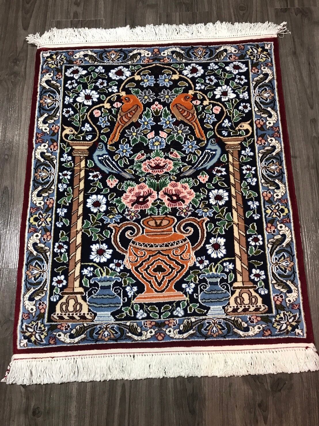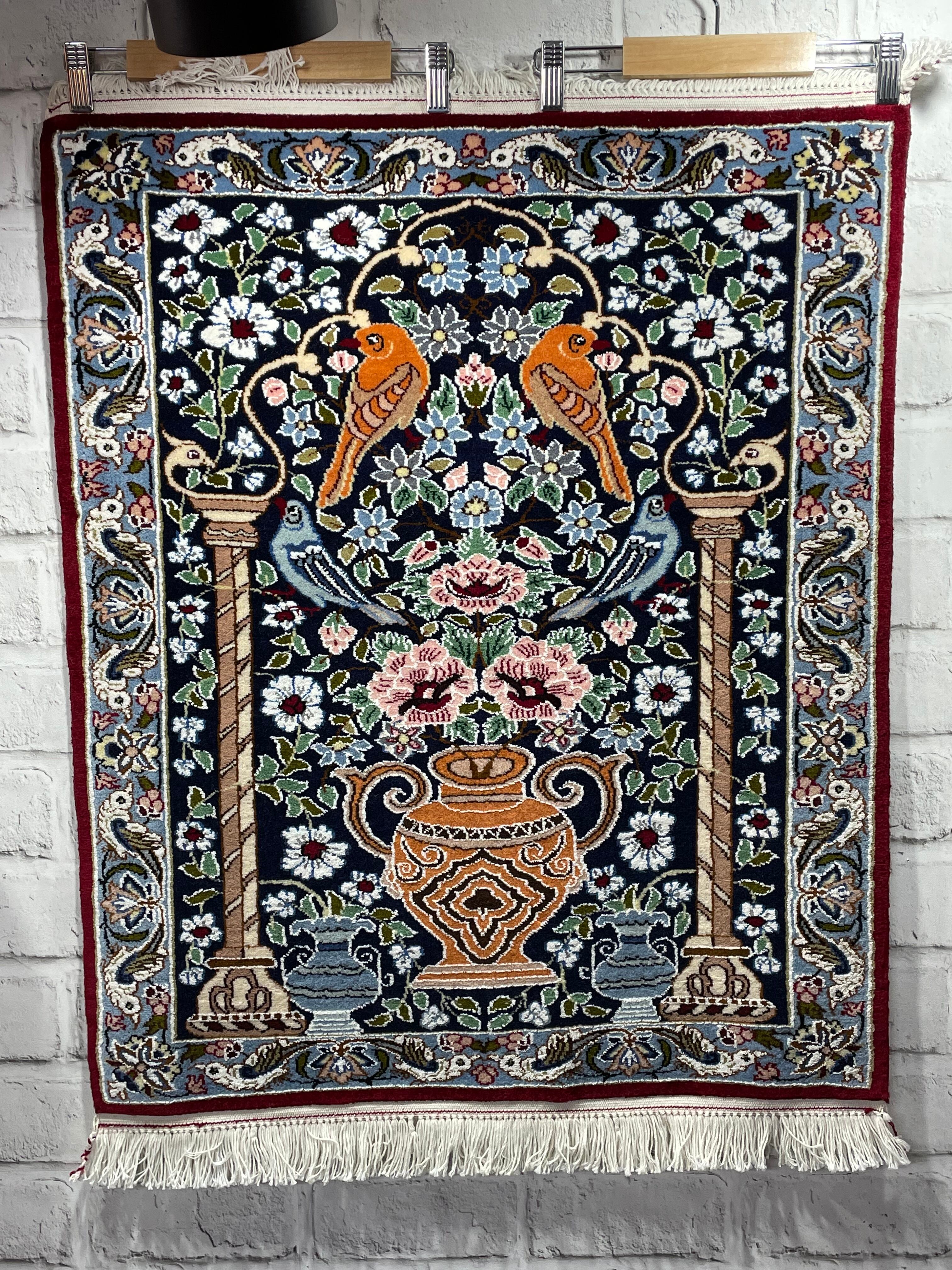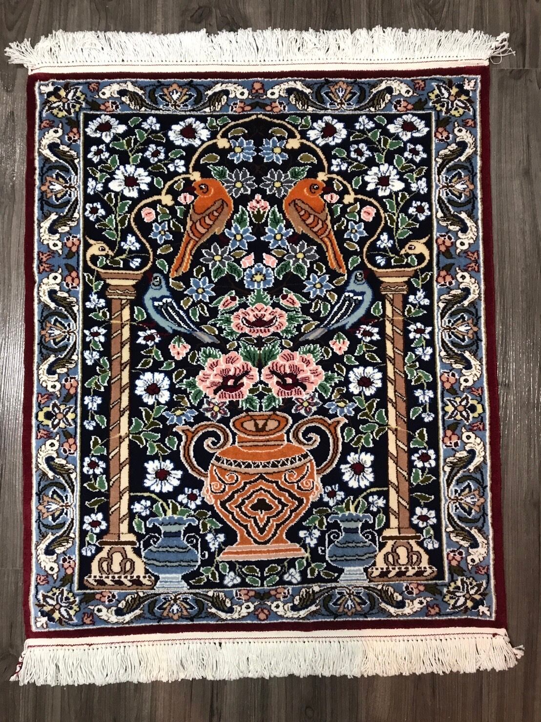 新品 ペルシャ絨毯 手織り ナイン産9la 77×65cm 花鳥文様