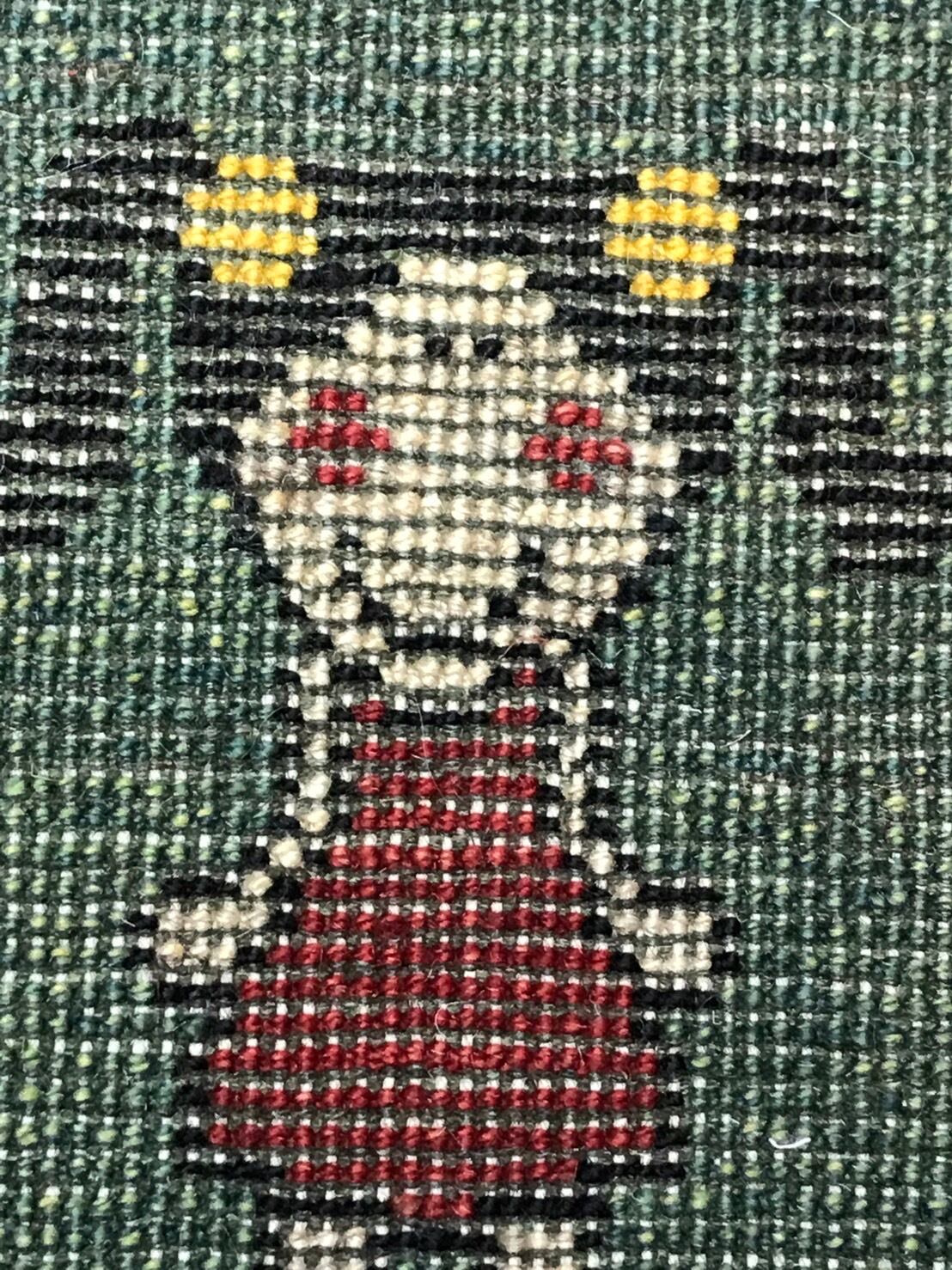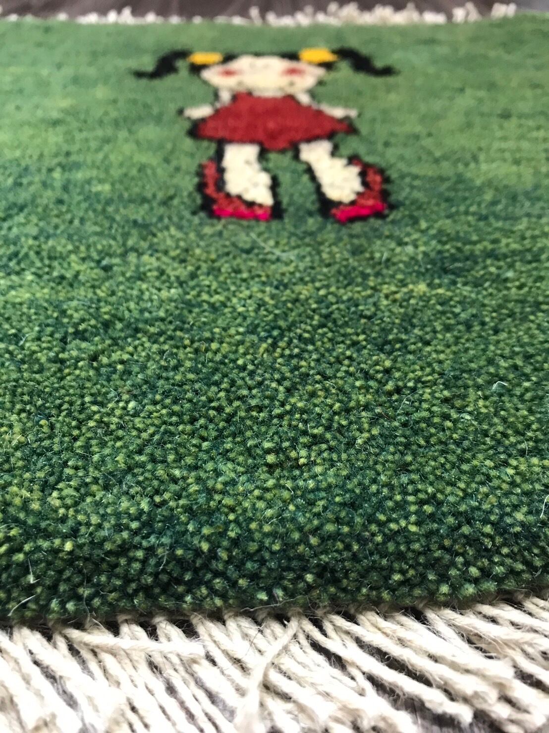 緑色のフィールドに笑顔の可愛らしい女の子が印象的な座布団サイズの手織りのペルシャギャッベです。血色の良い赤いほっぺがなんとも愛らしい目です。